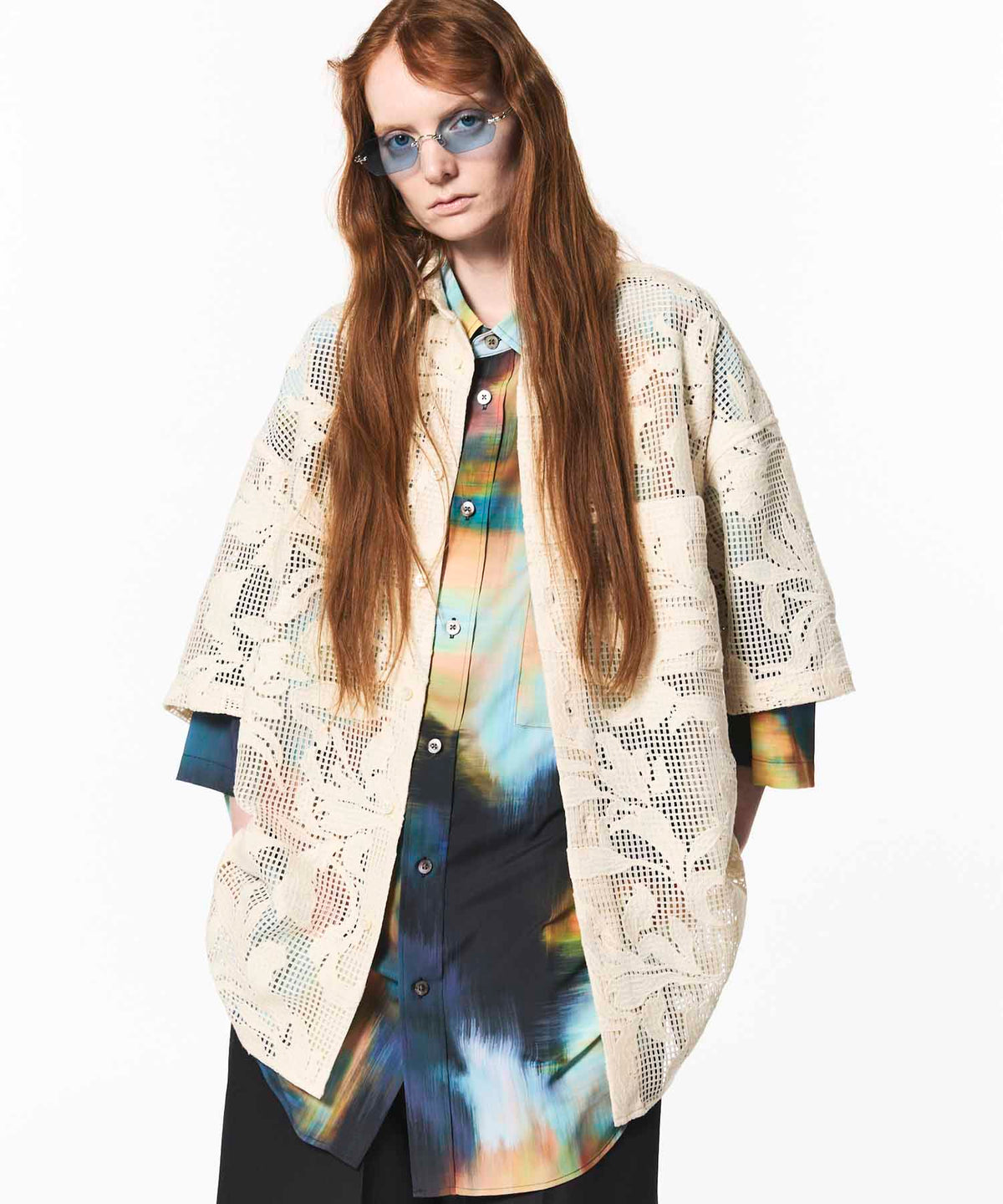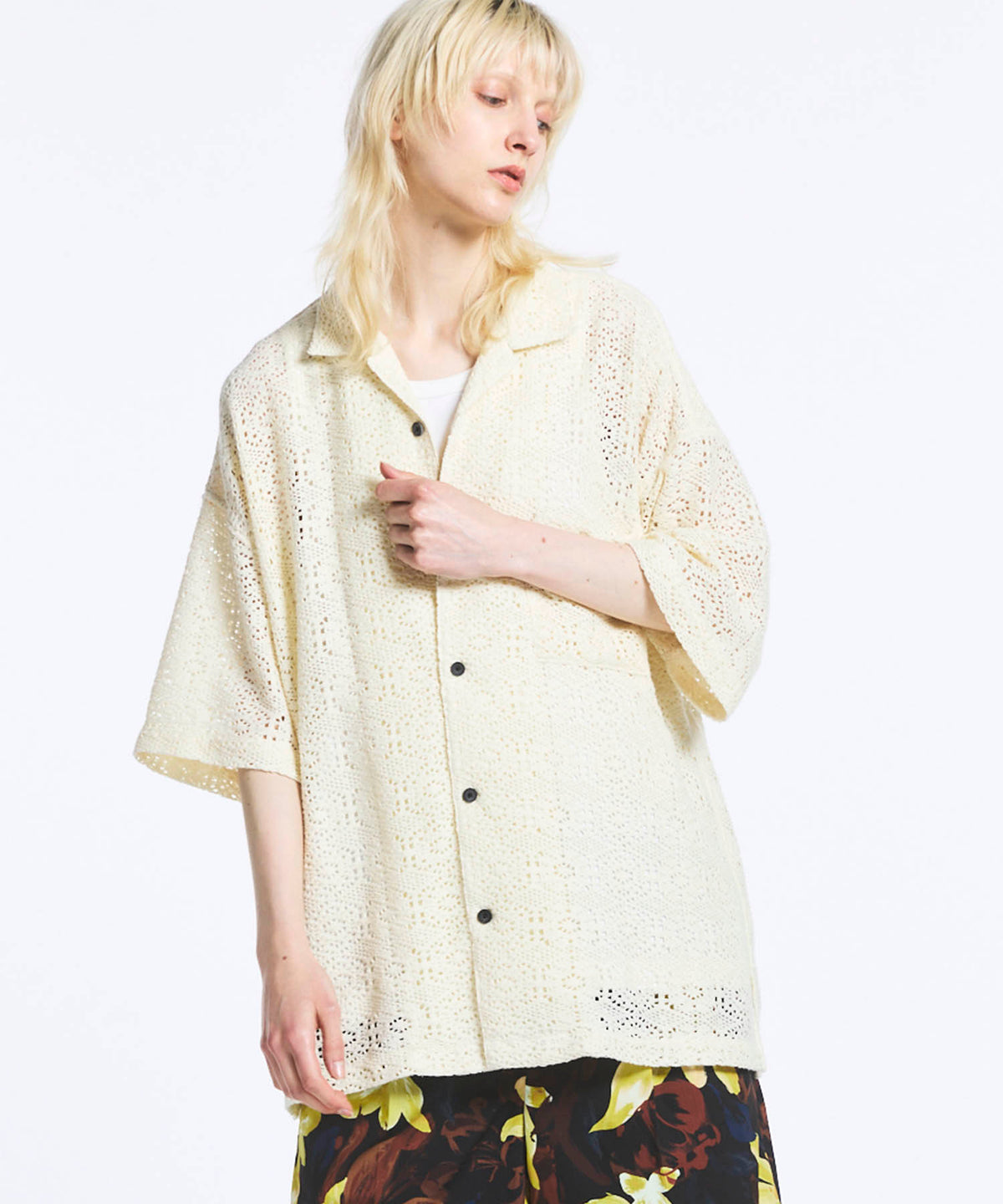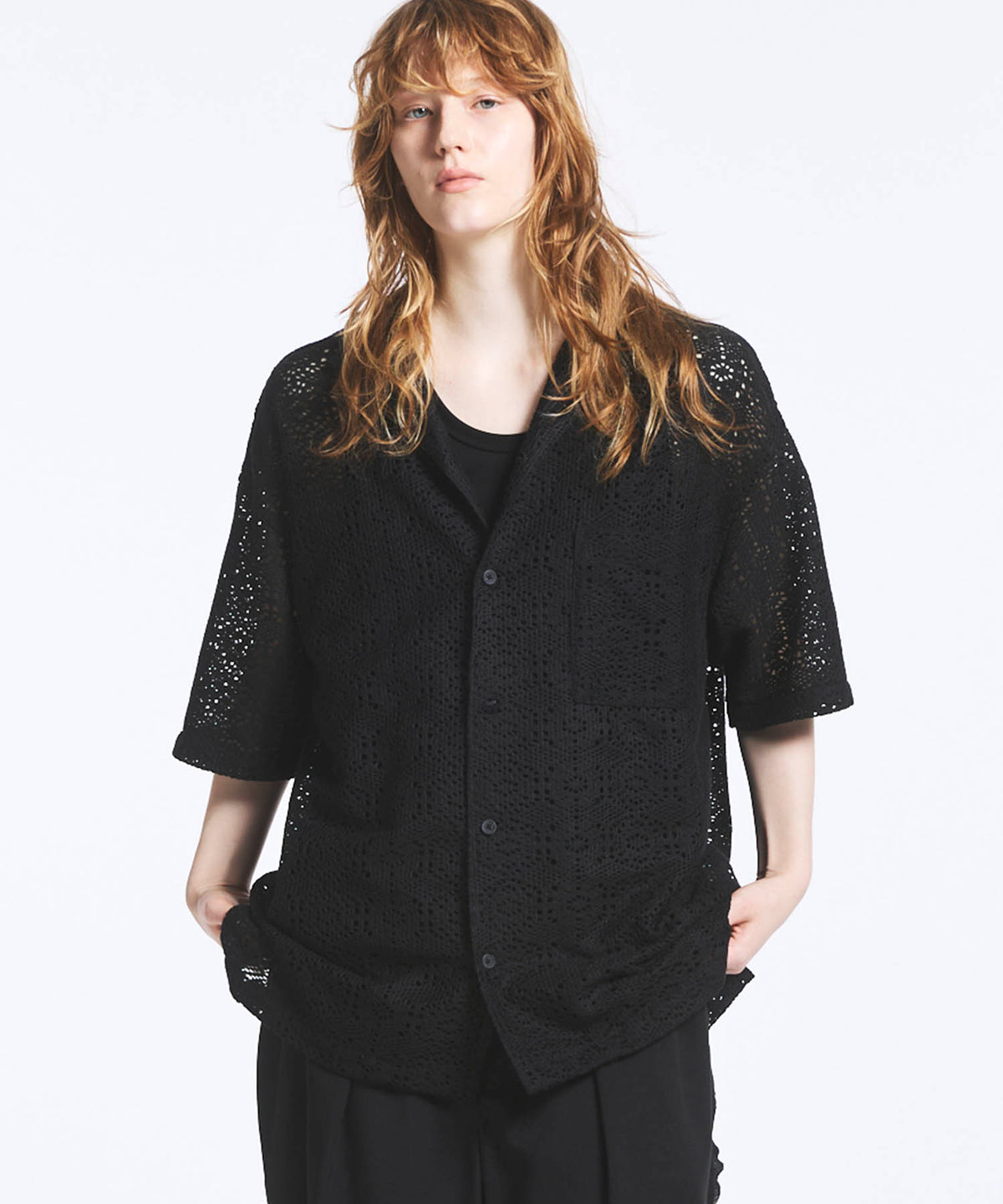 Mesh Flower Embroidery Prime-Over Short Sleeve Shirt