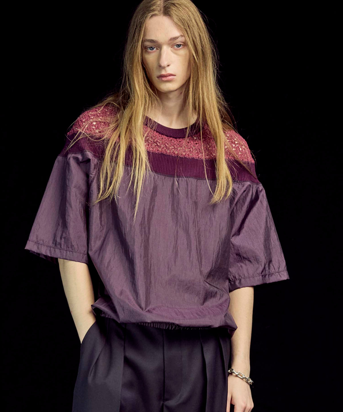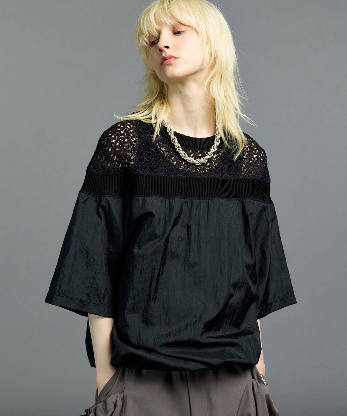 Lace Knit V-Switching Combination Sweat Crew Neck Pullover