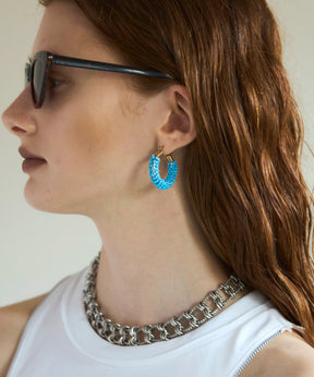 These hoop earrings are decorated with glass beads on brass, and the beautiful color of the item is the highlight.