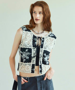 - A compact knit vest that expands the range of styling with two ways in front and back.