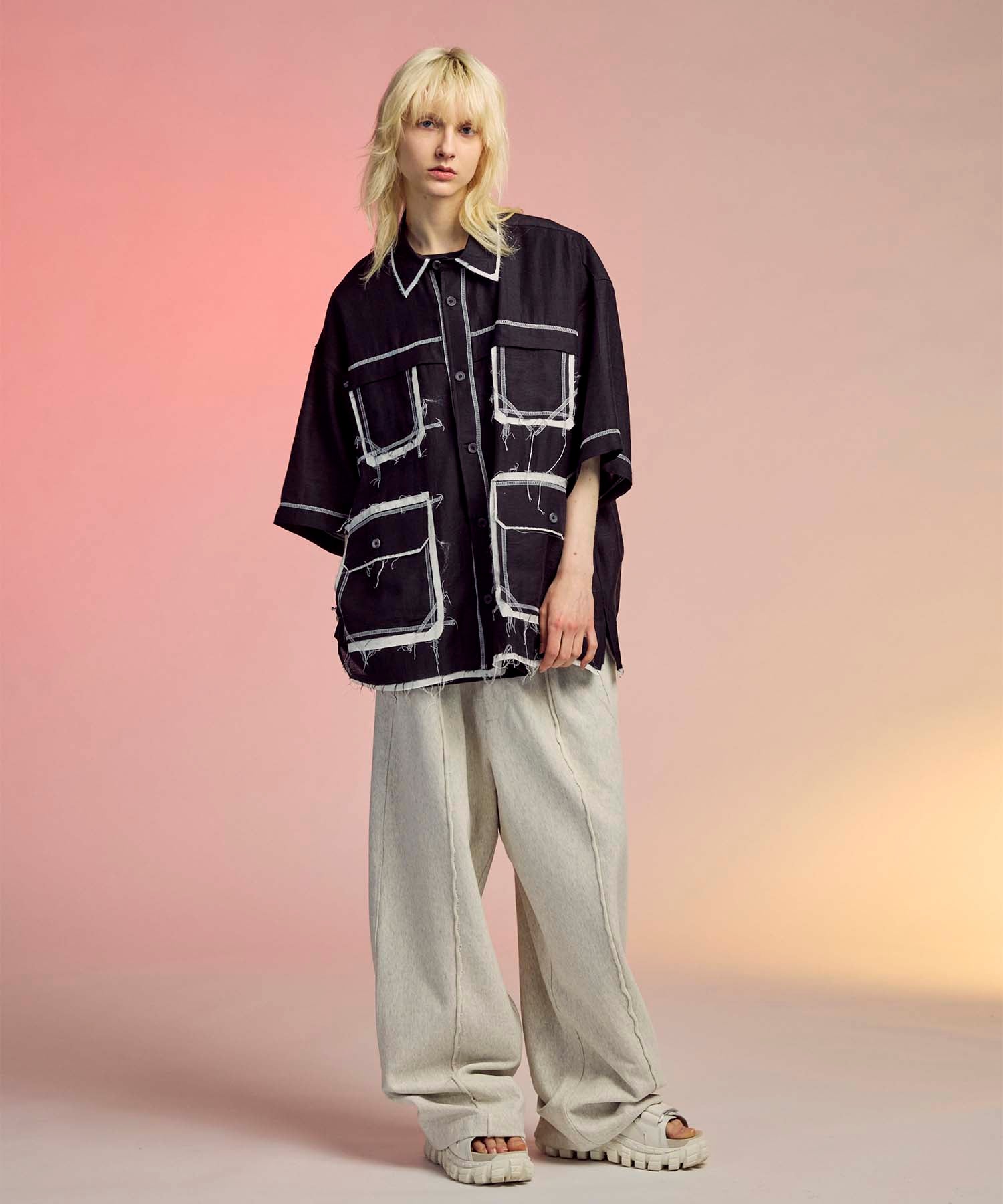 - The crease line, pockets, and hem are cut and finished to add a touch of atmosphere.