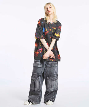 A distinctive oversized silhouette consisting of drop shoulders with very large body width and arms and a drop shoulder with a tightly dropped shoulder.