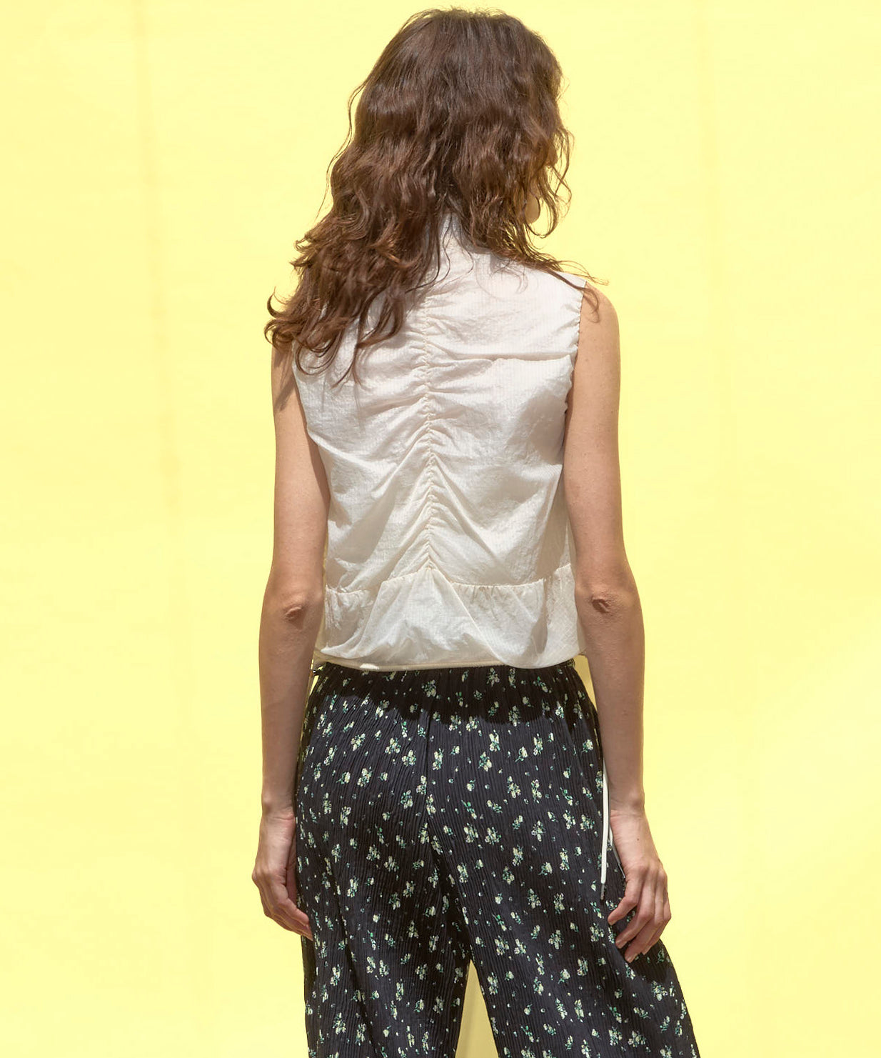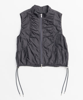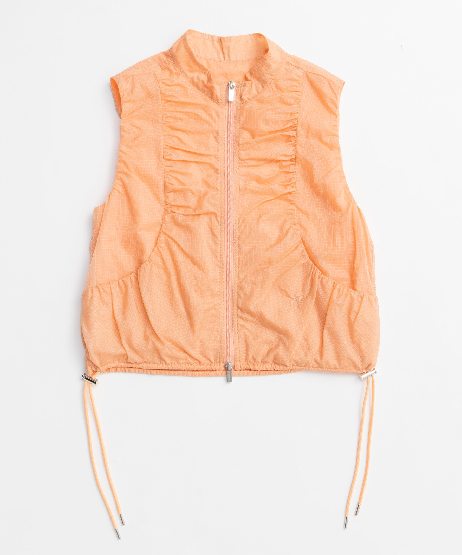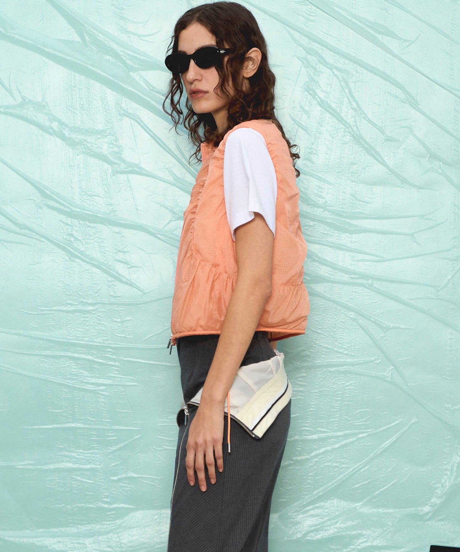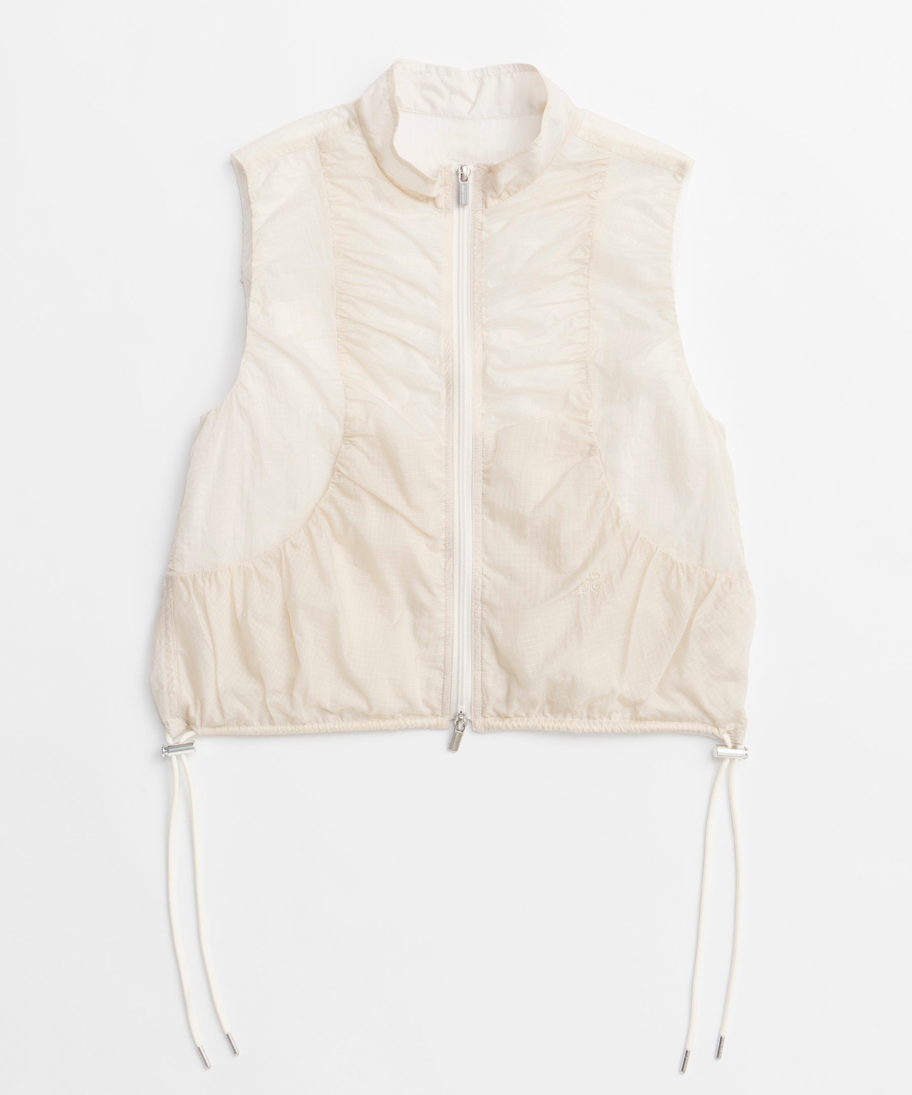 The sporty, light and soft material is gathered to mix it with a slightly girly impression, creating an item with a relaxed feel and movement.