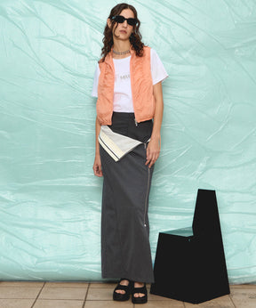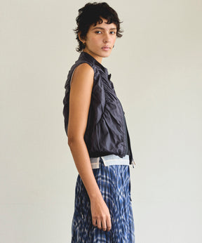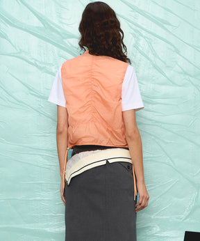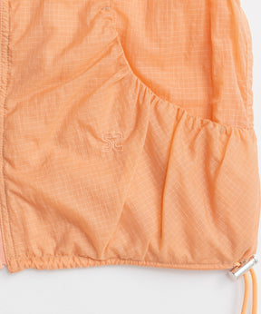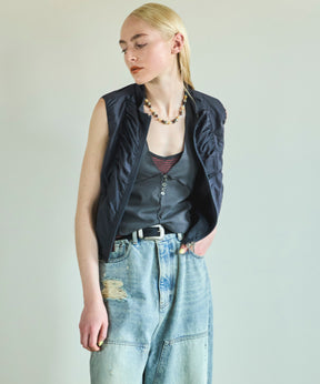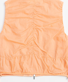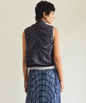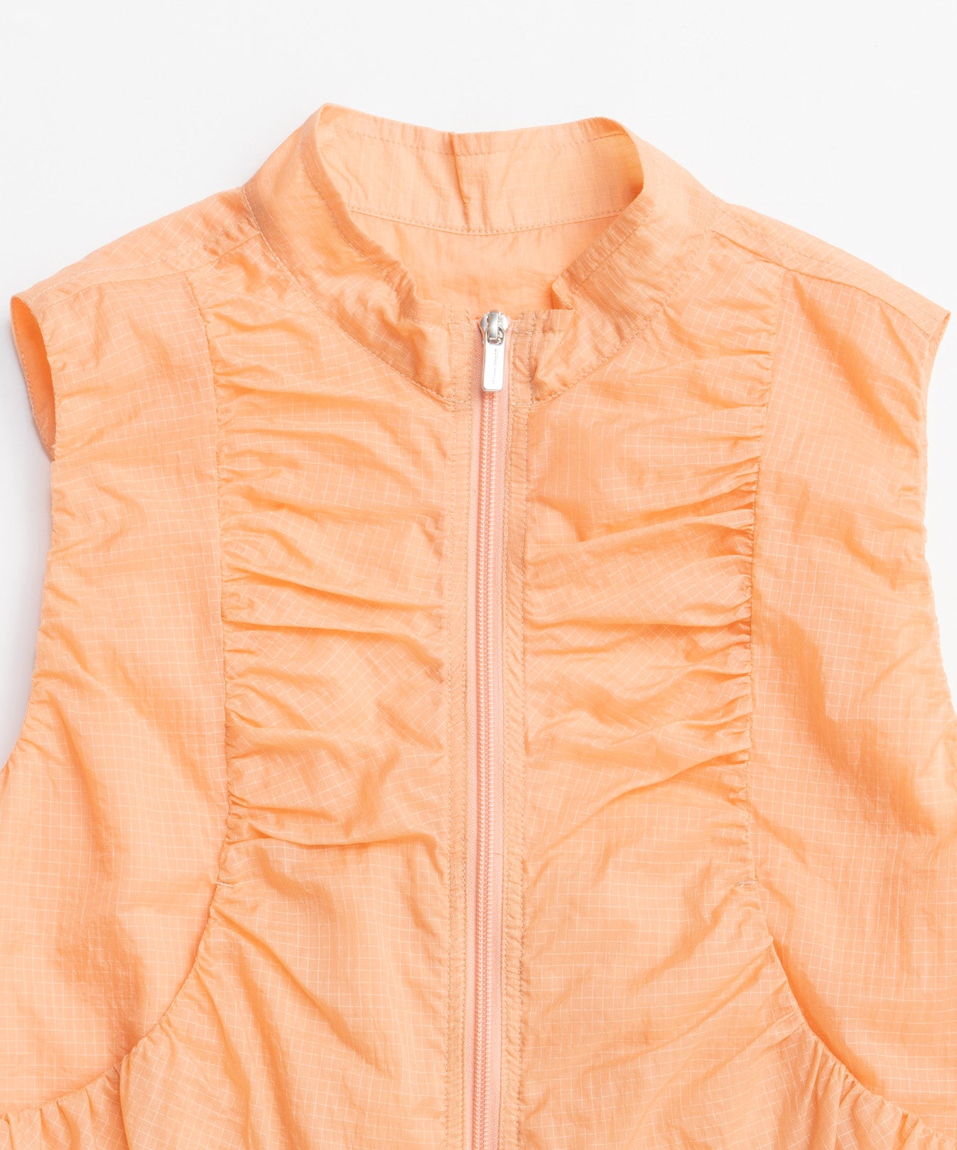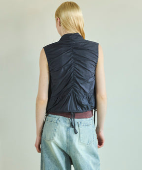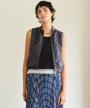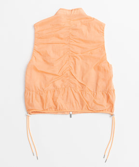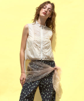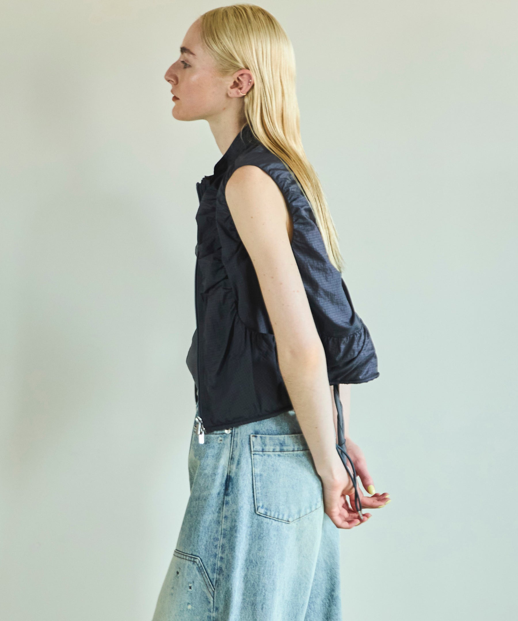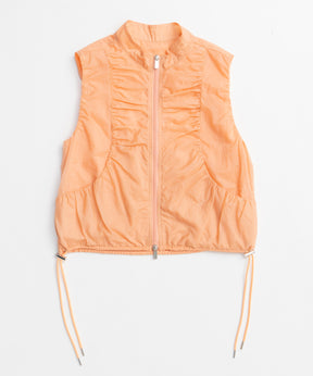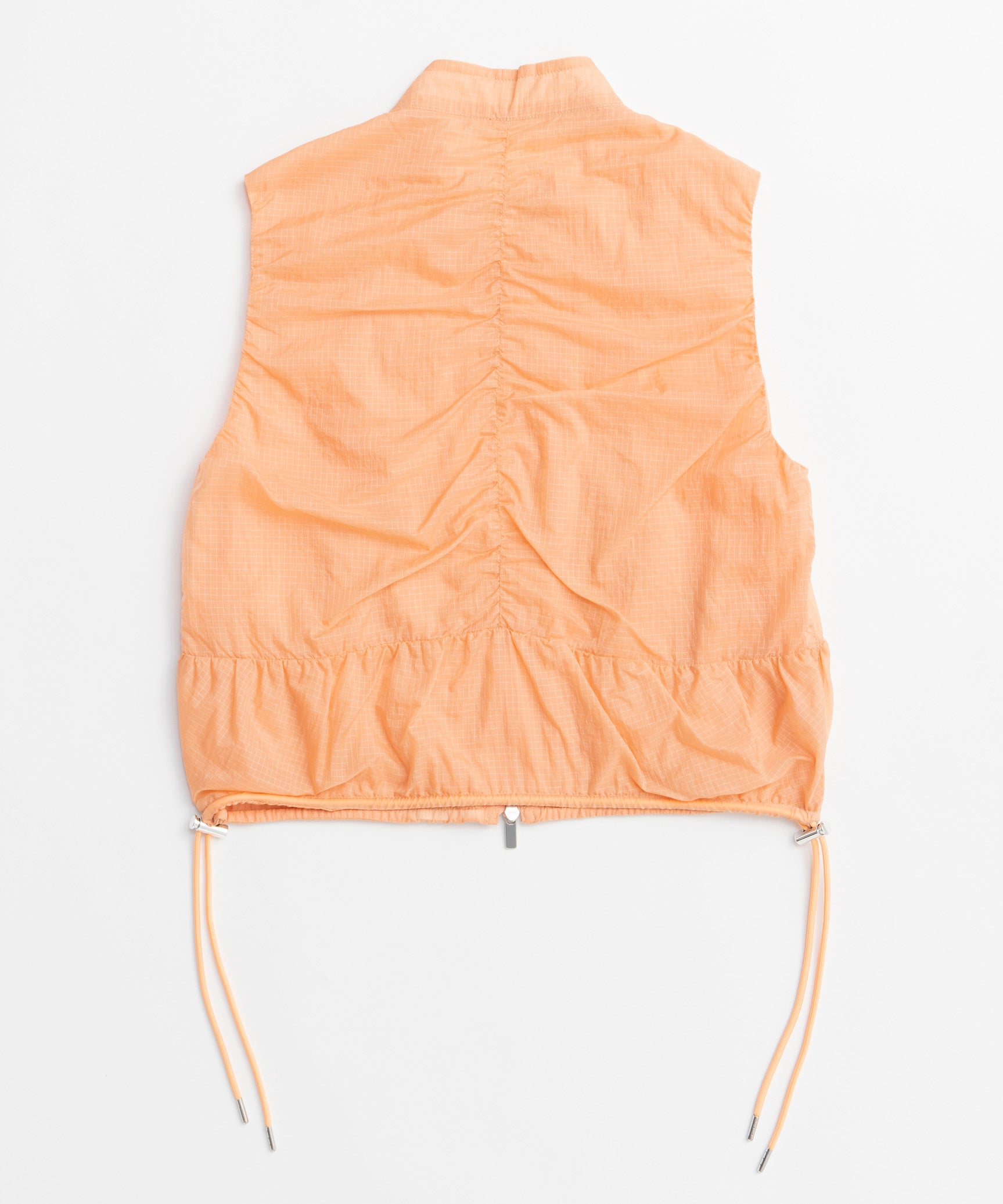 The sporty, light and soft material is gathered to mix it with a slightly girly impression, creating an item with a relaxed feel and movement.