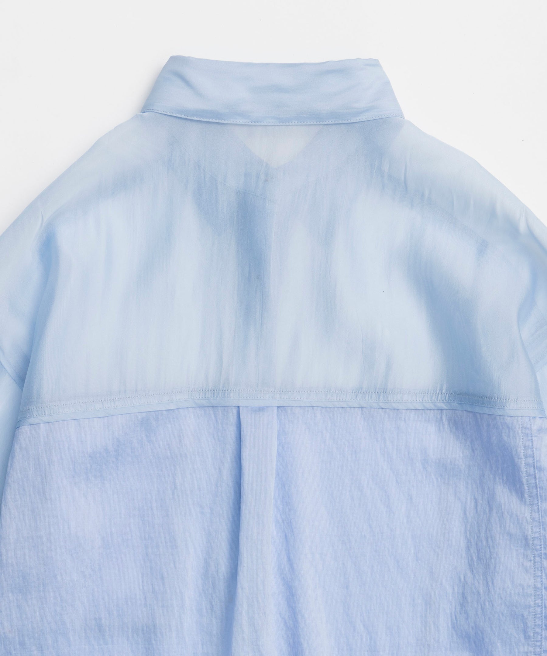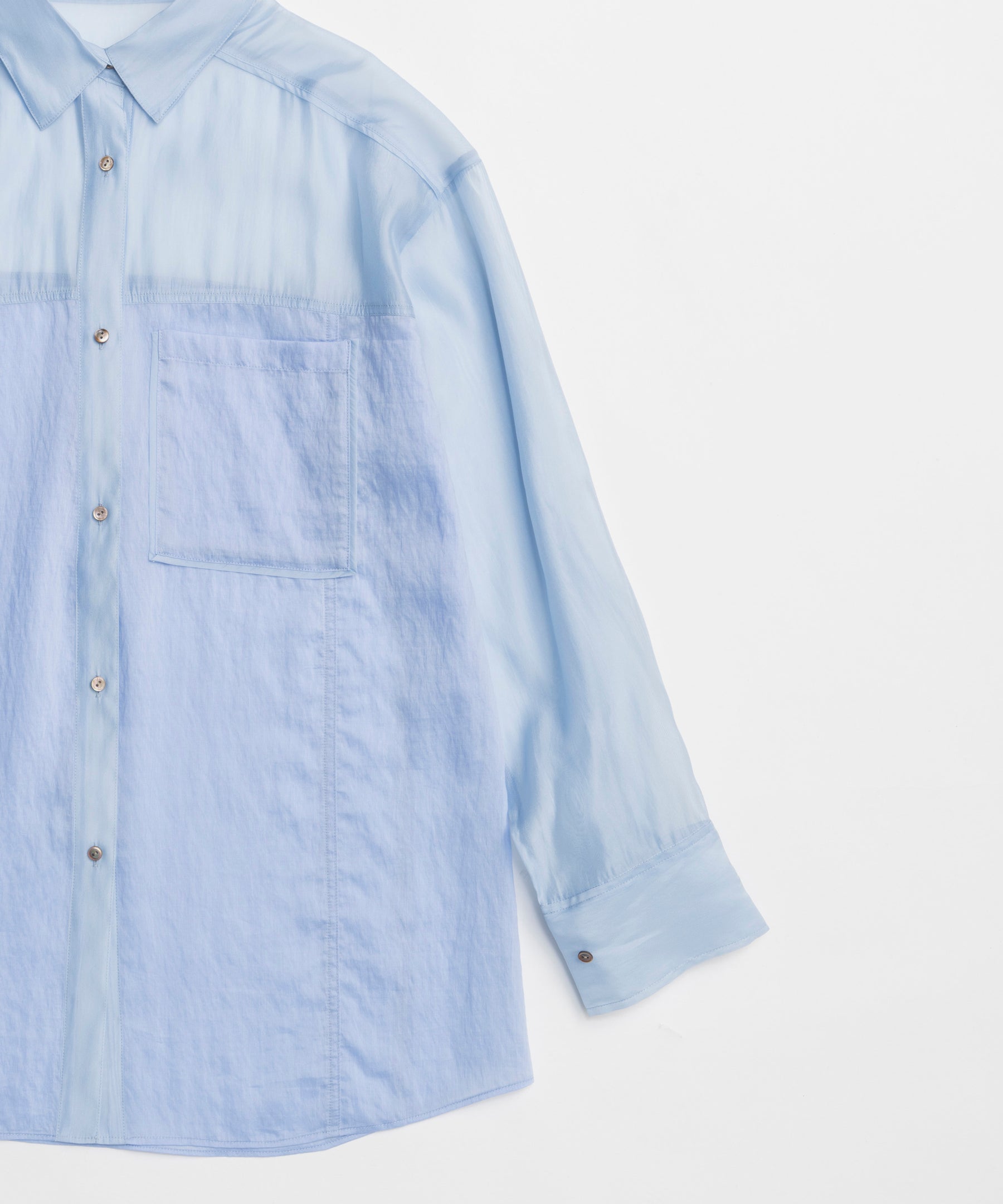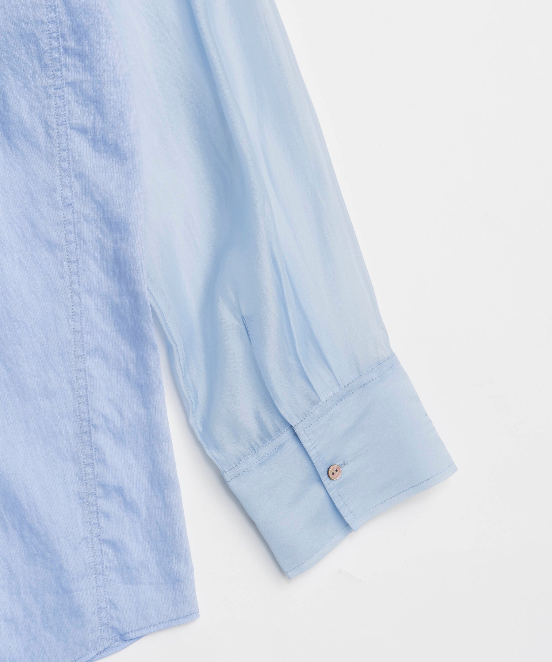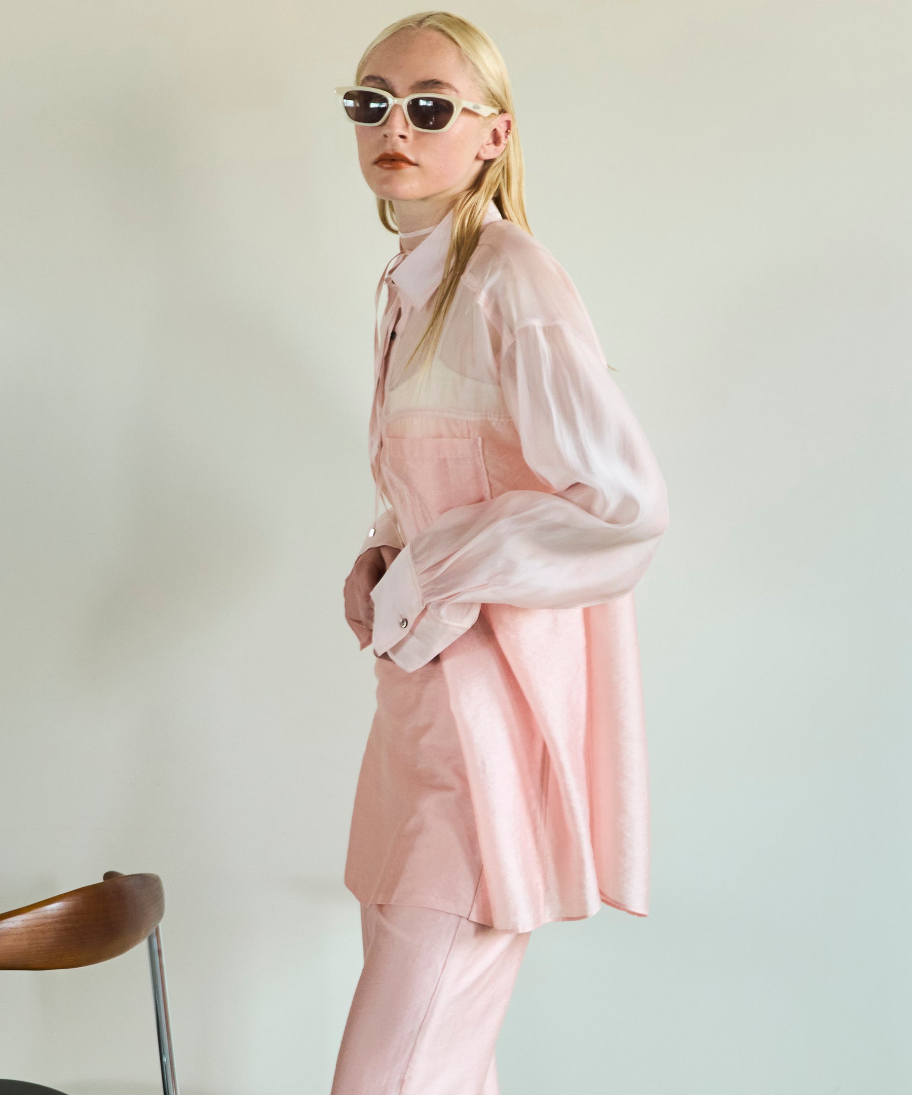 We docked sheer material with a firm feel and sheer material with a drape feel. The sheer material has a drape and is packed with Tencel at a high blend ratio, making it soft to the touch and extremely comfortable to wear. It is light and can be used as a measure to protect against air conditioning in the summer.