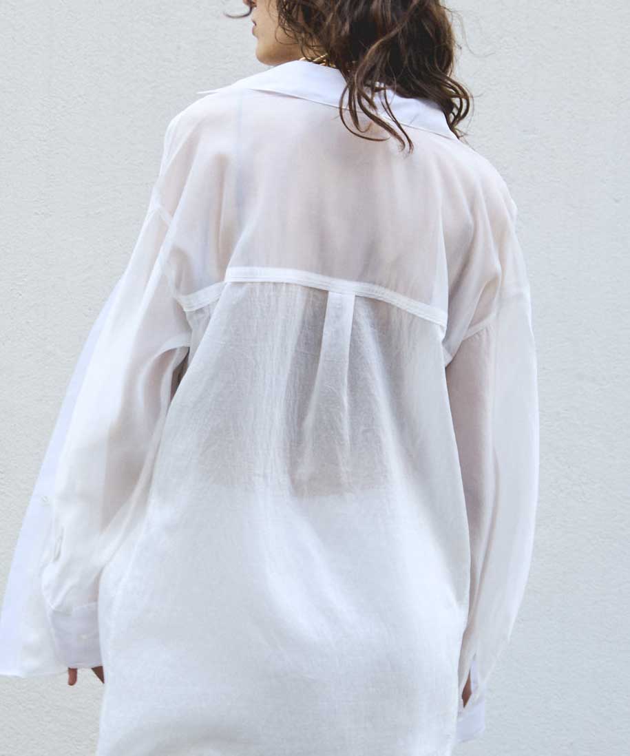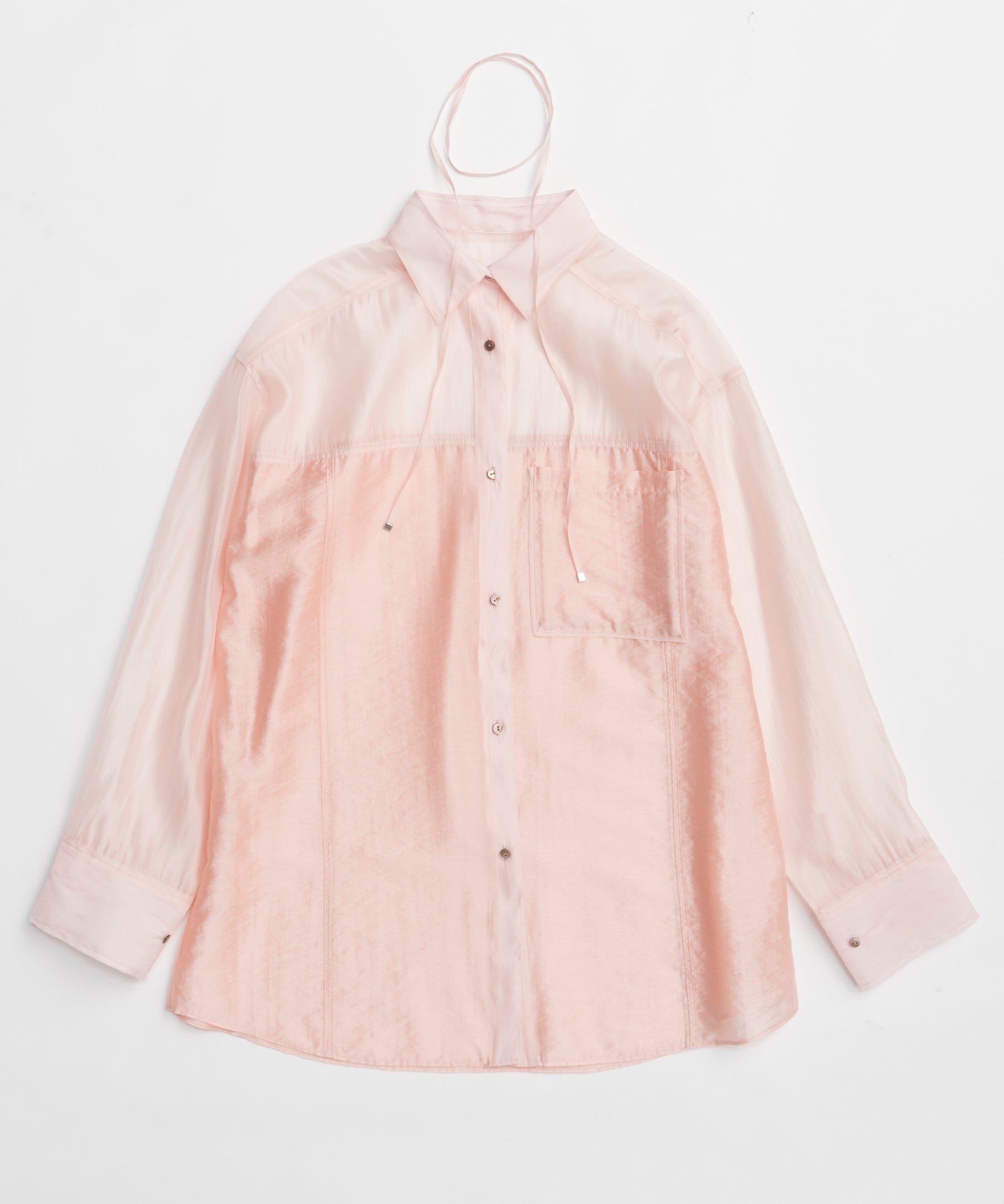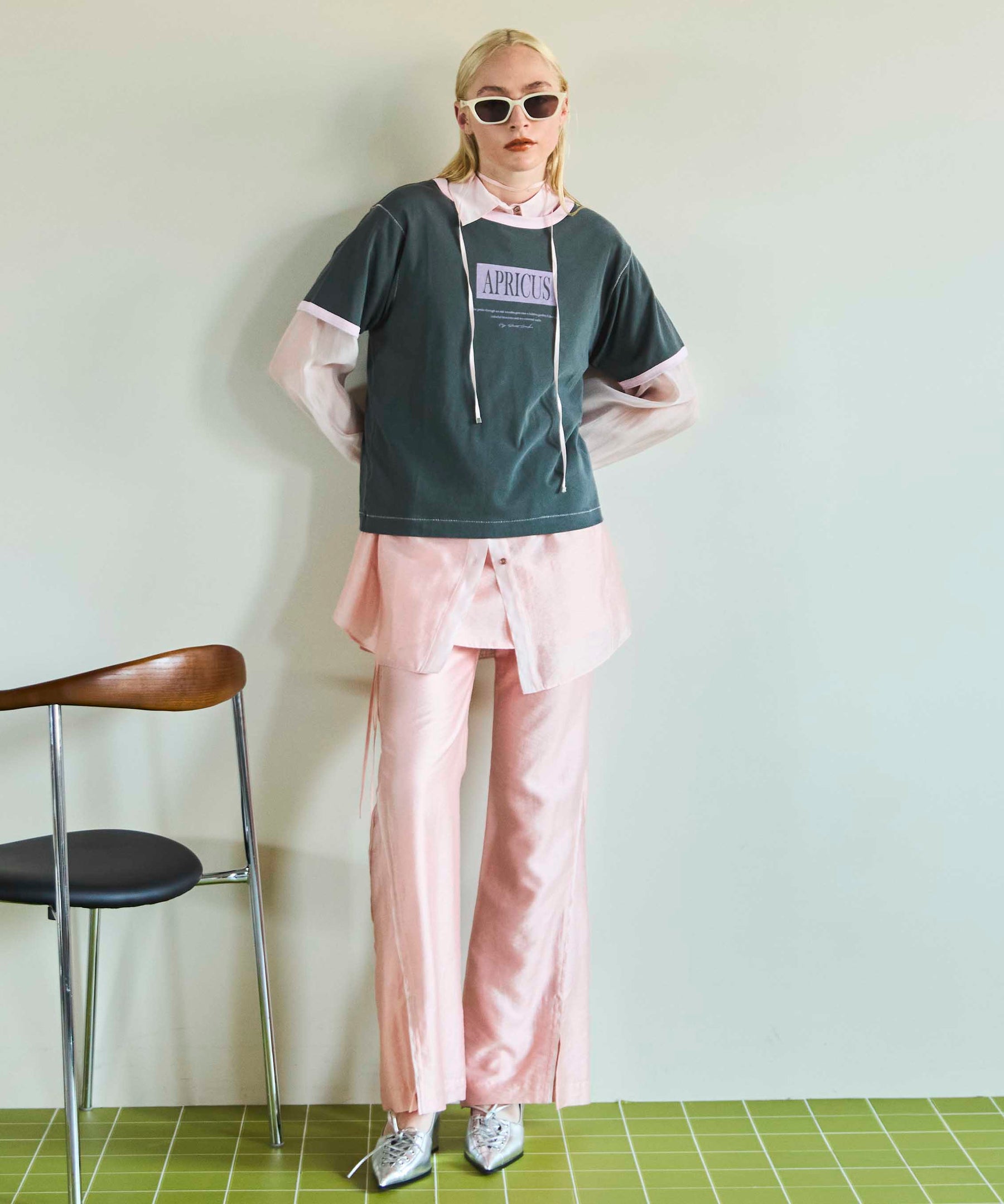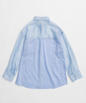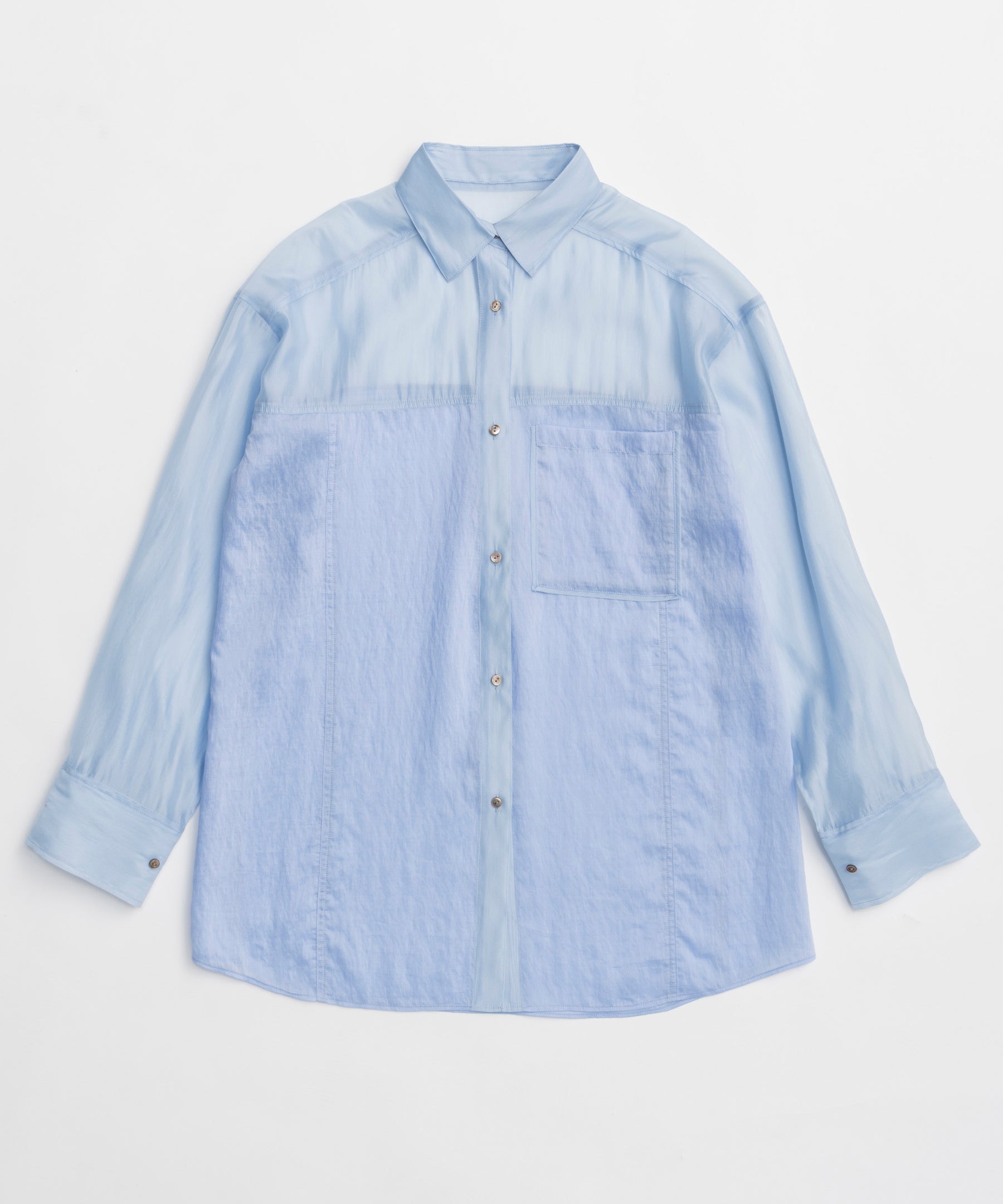 We docked sheer material with a firm feel and sheer material with a drape feel. The sheer material has a drape and is packed with Tencel at a high blend ratio, making it soft to the touch and extremely comfortable to wear. It is light and can be used as a measure to protect against air conditioning in the summer.