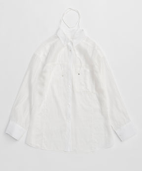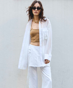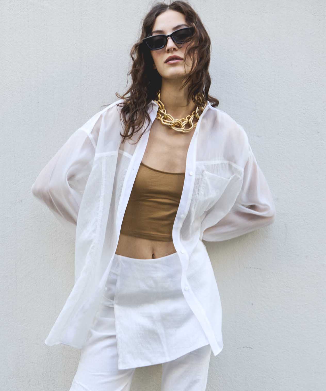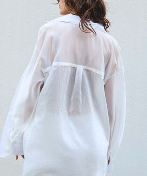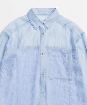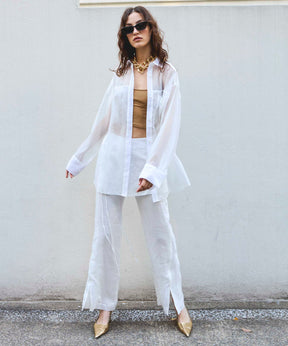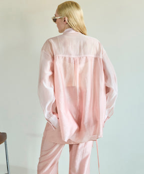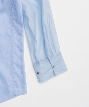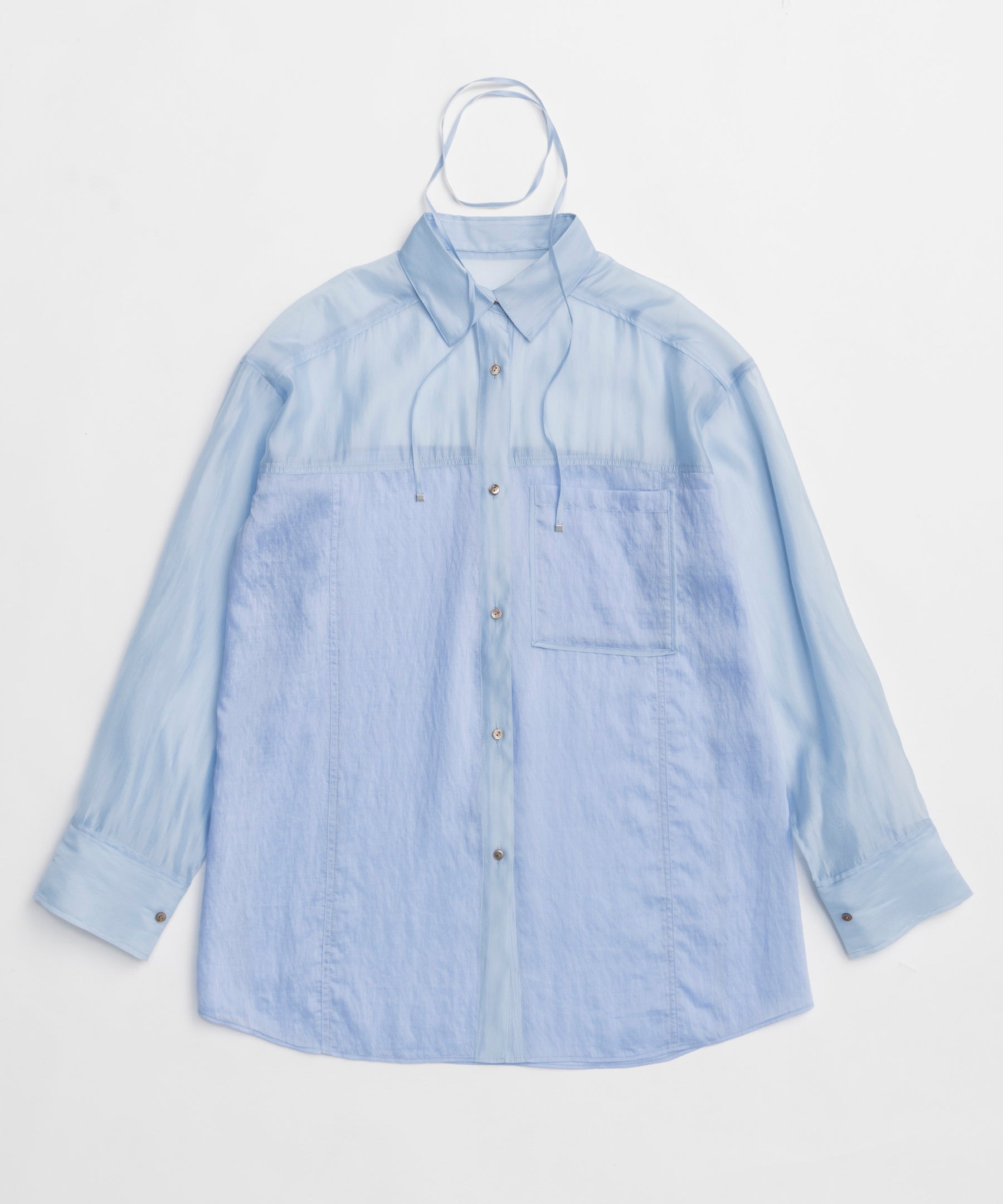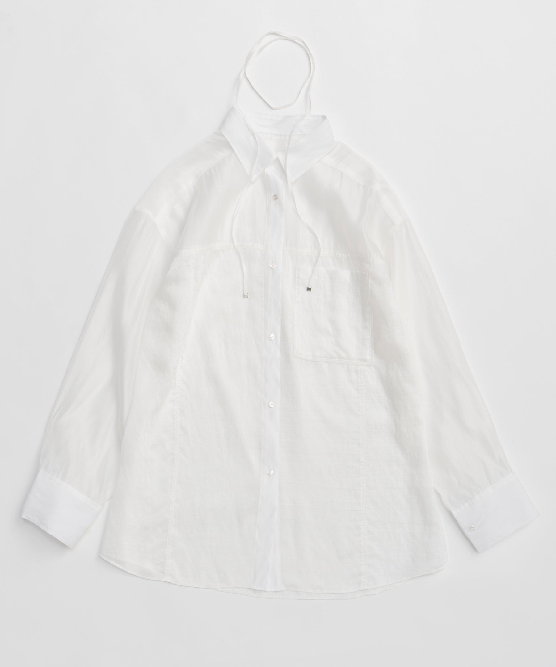 We docked sheer material with a firm feel and sheer material with a drape feel. The sheer material has a drape and is packed with Tencel at a high blend ratio, making it soft to the touch and extremely comfortable to wear. It is light and can be used as a measure to protect against air conditioning in the summer.