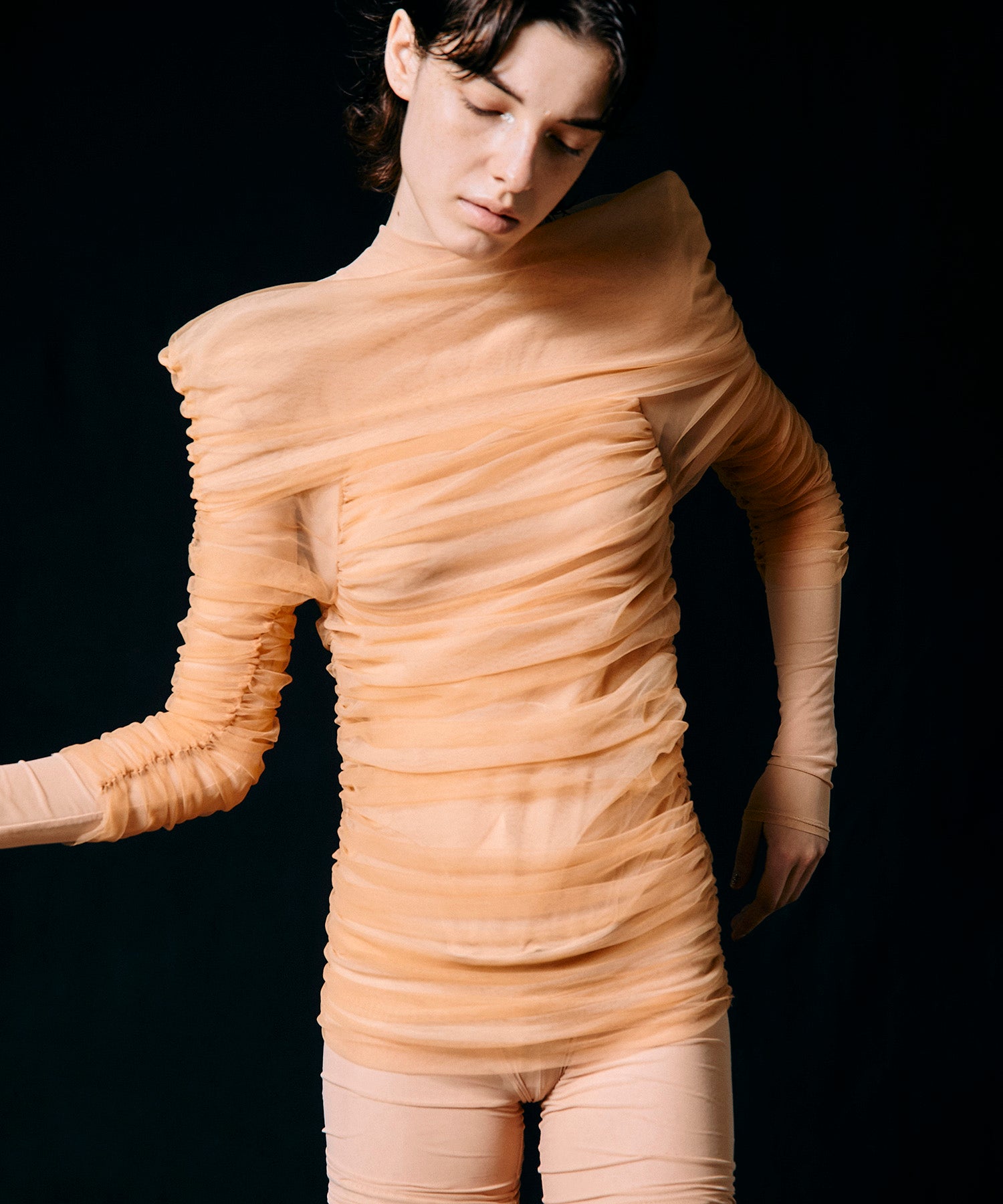 1枚で着るだけでなくインナーとして着用することで手持ちのアイテムに肩パットのシルエットを創り出しモードに着こなせます。