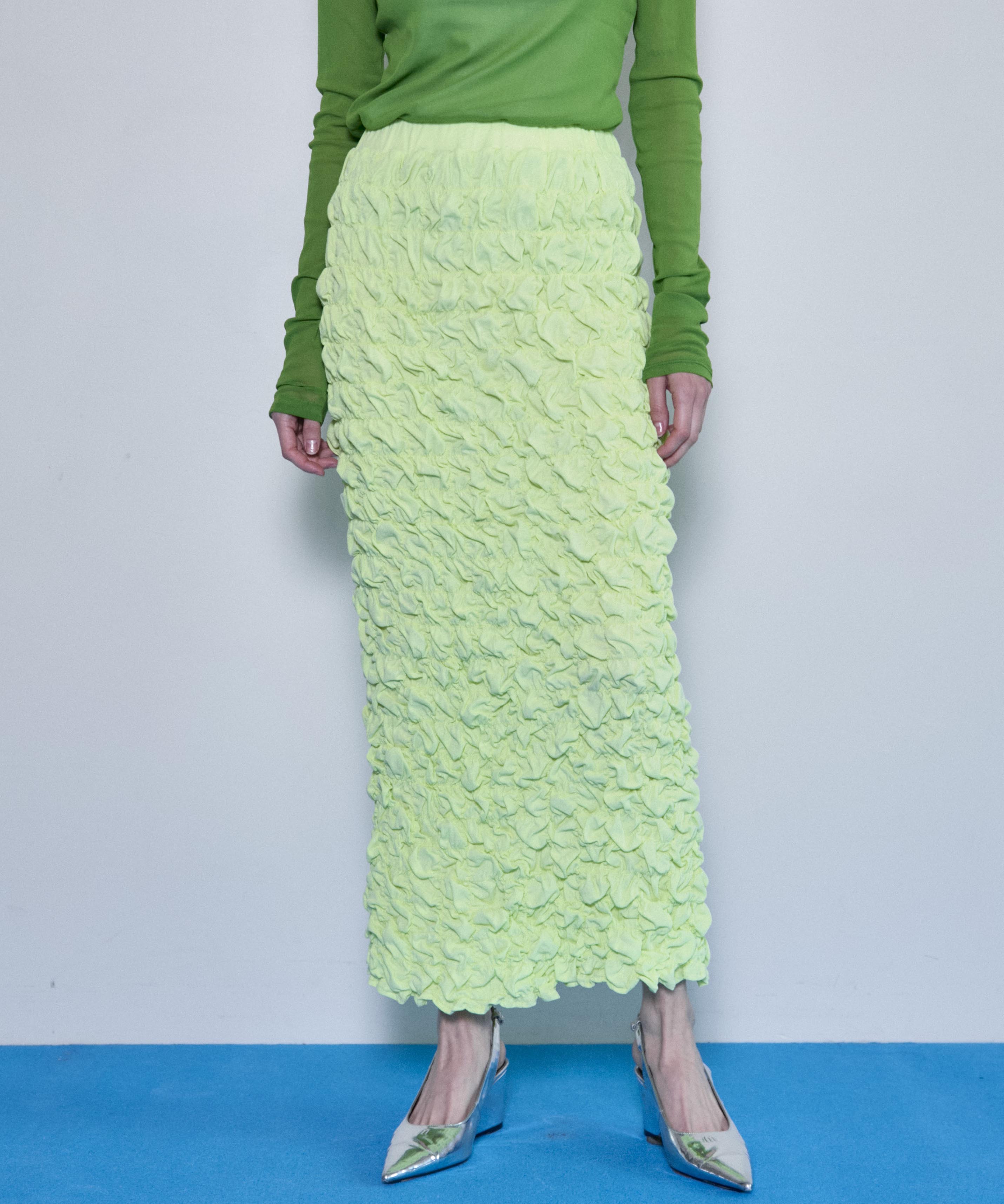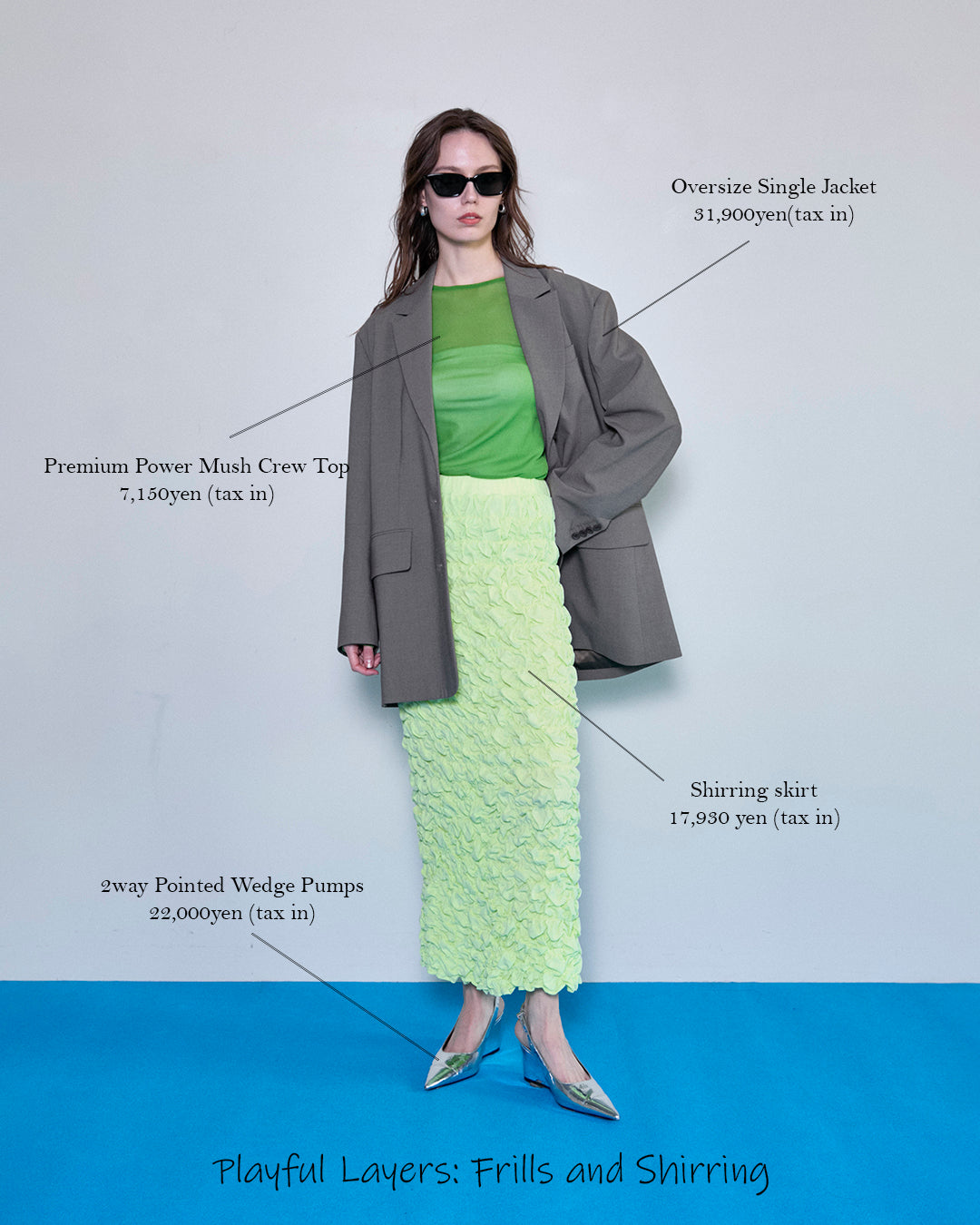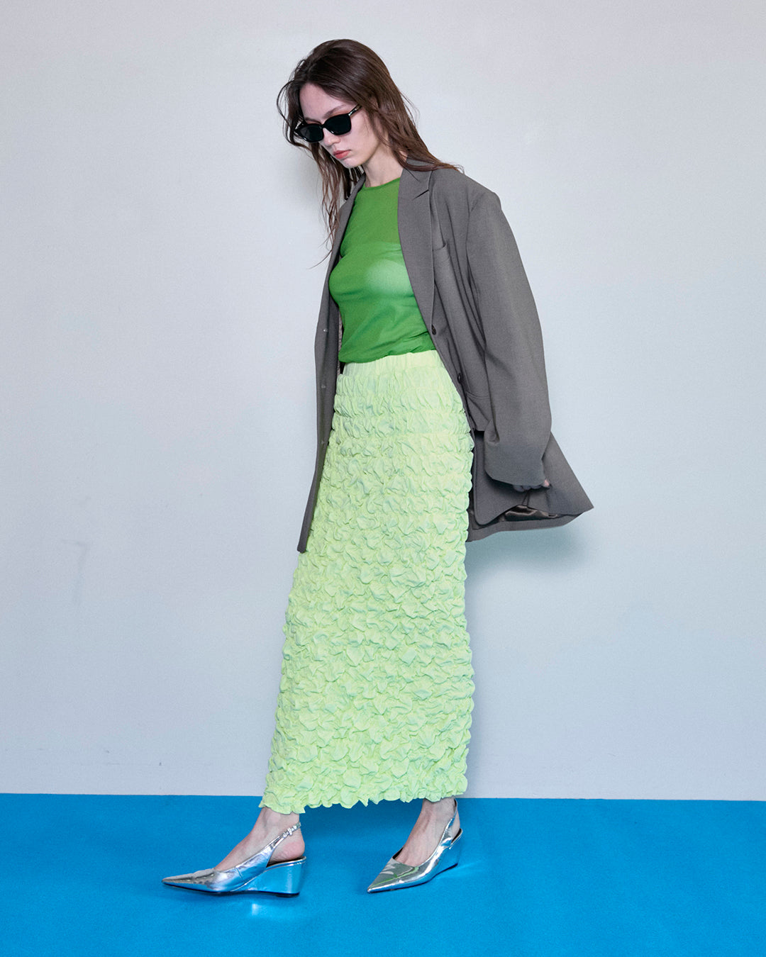 シャーリングを全面に施した美しいIラインのタイトスカート。春らしいグリーンをメインカラーに上品なジャケットをプラス。カラーで遊びつつも大人らしさを意識したスタイリング。