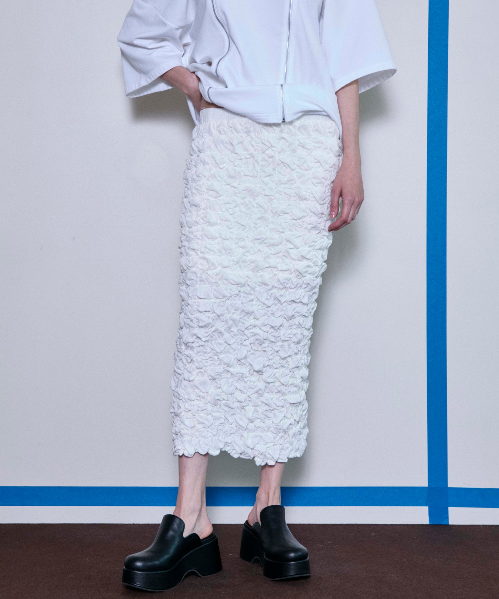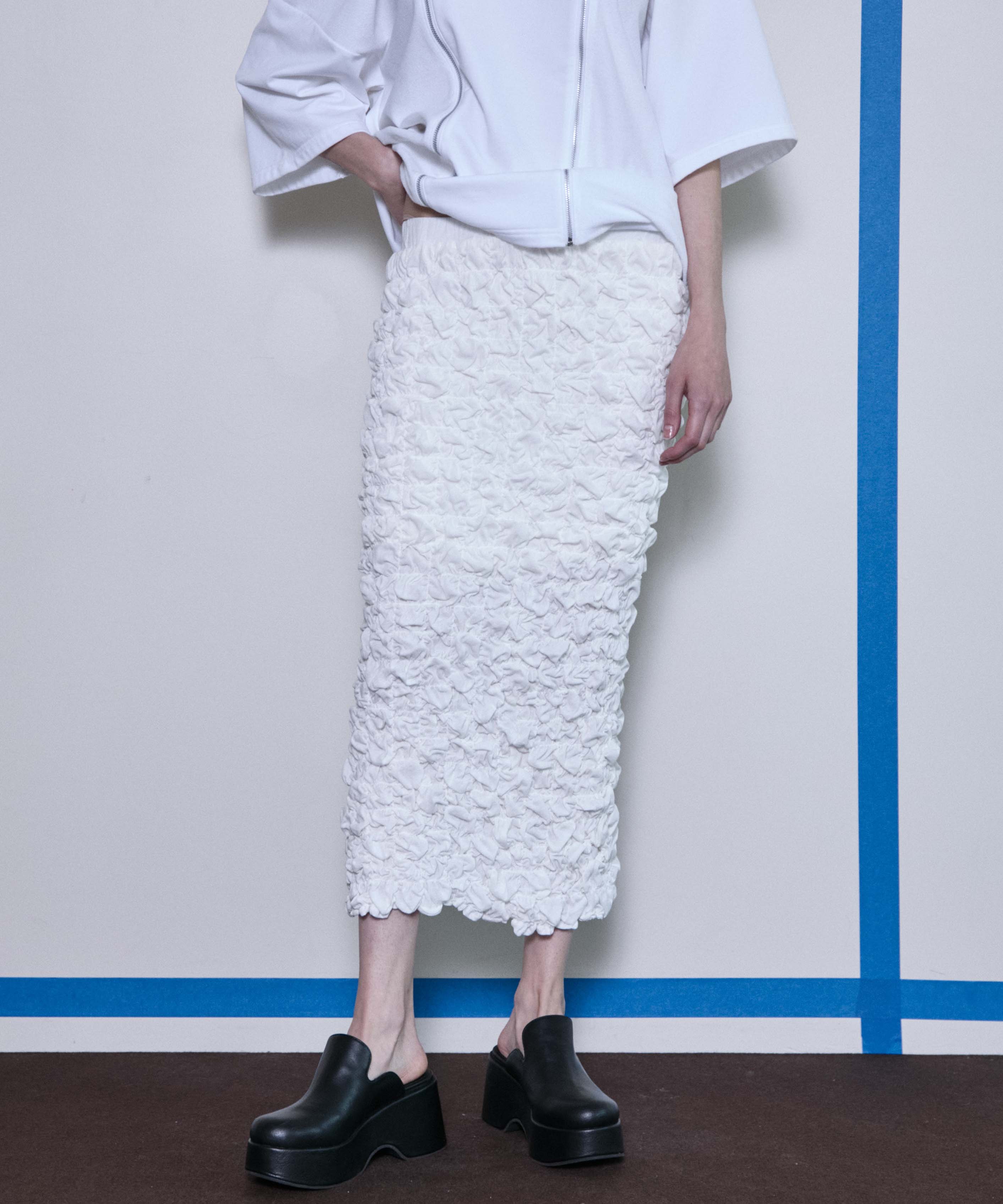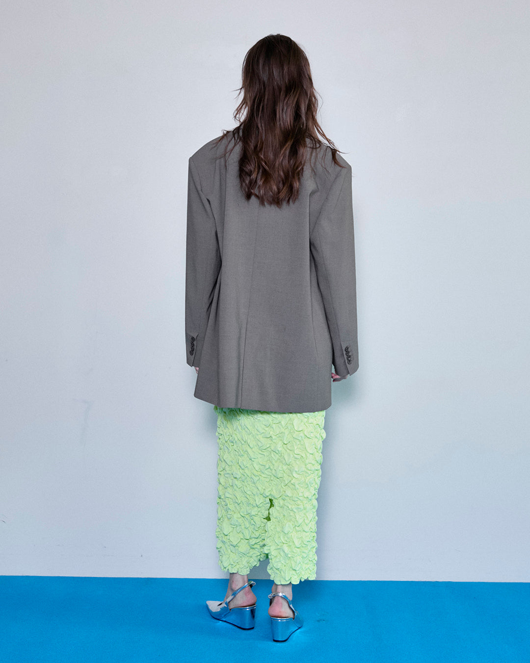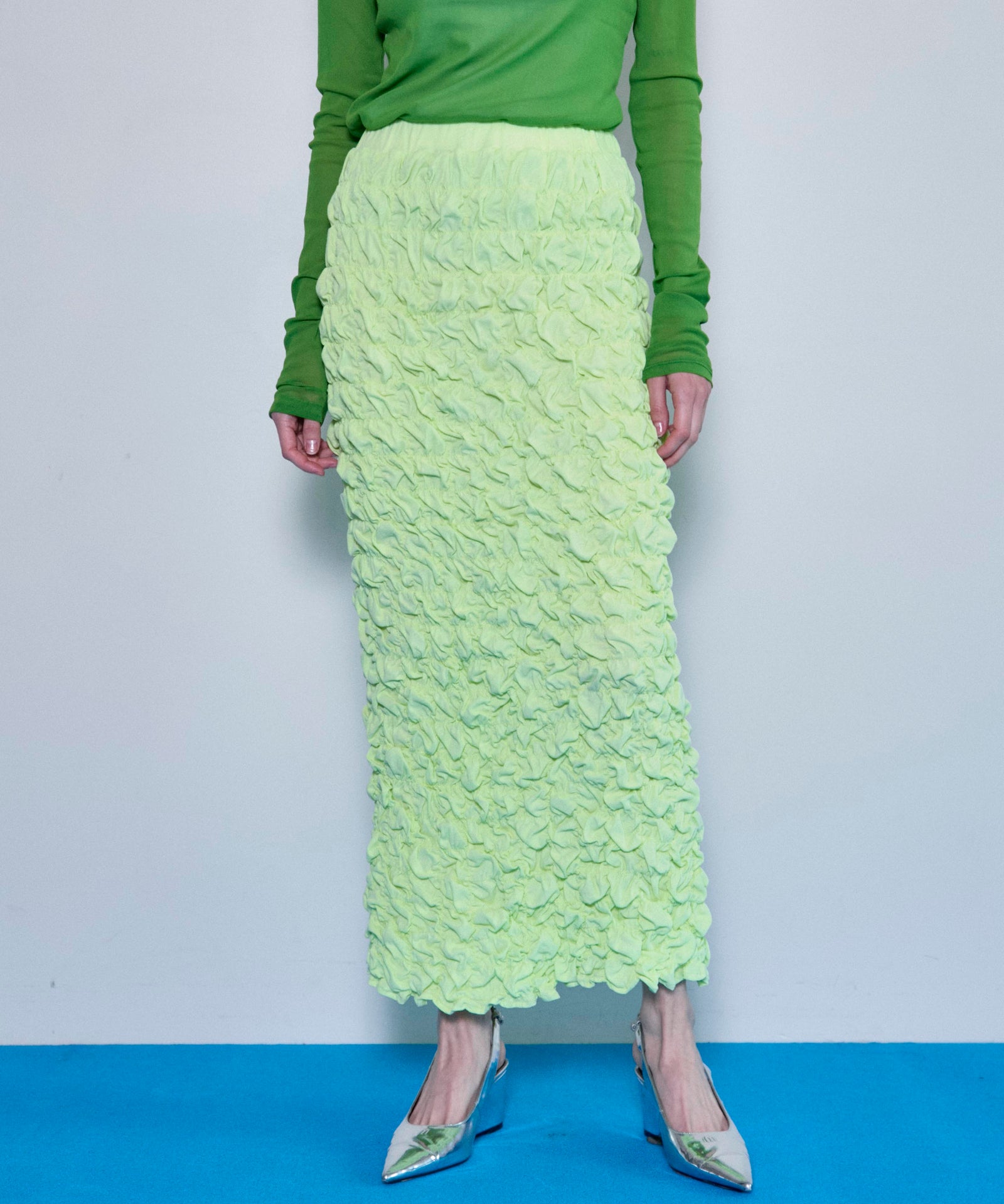 シャーリングを全面に施した美しいIラインのタイトスカート。春らしいグリーンをメインカラーに上品なジャケットをプラス。カラーで遊びつつも大人らしさを意識したスタイリング。