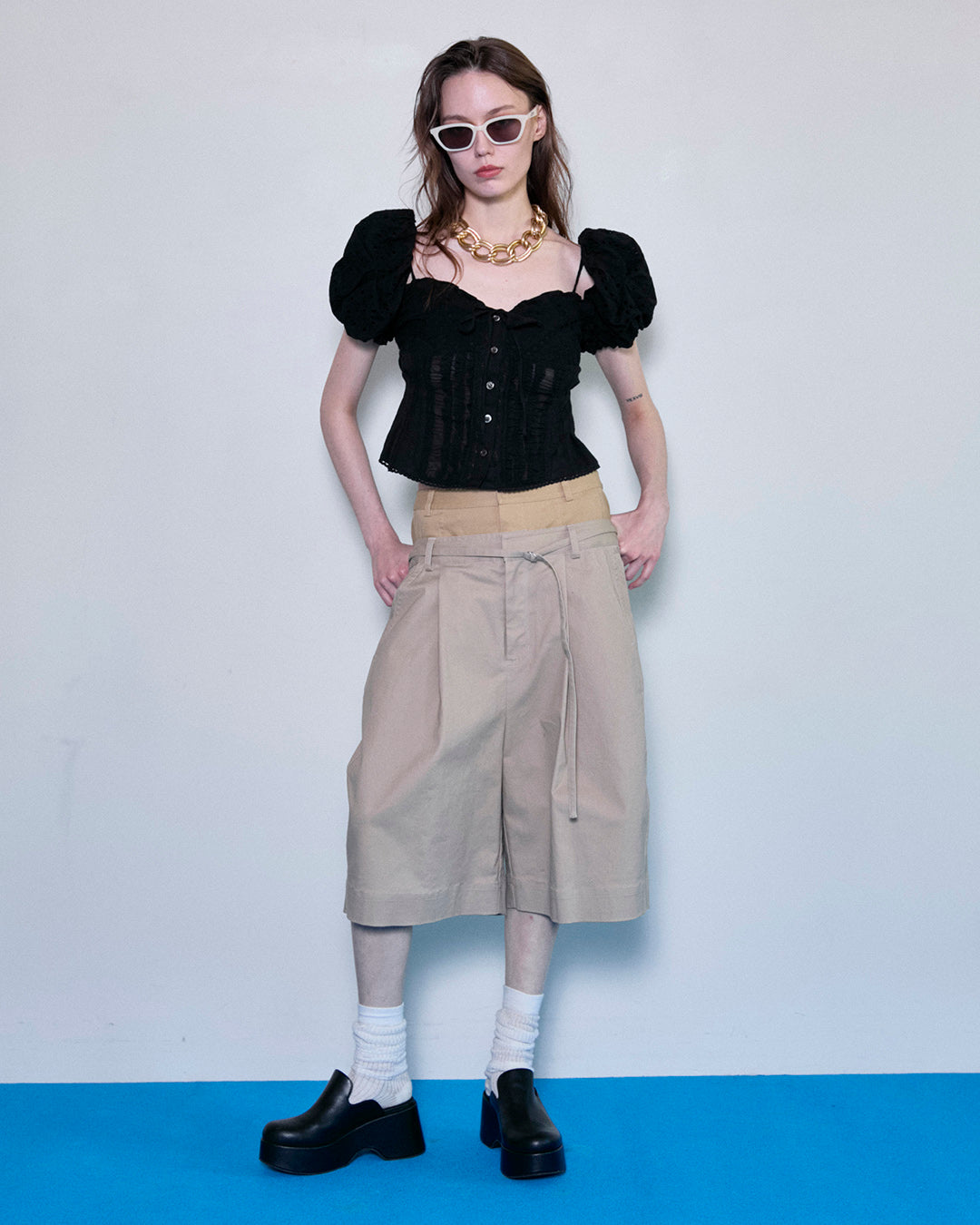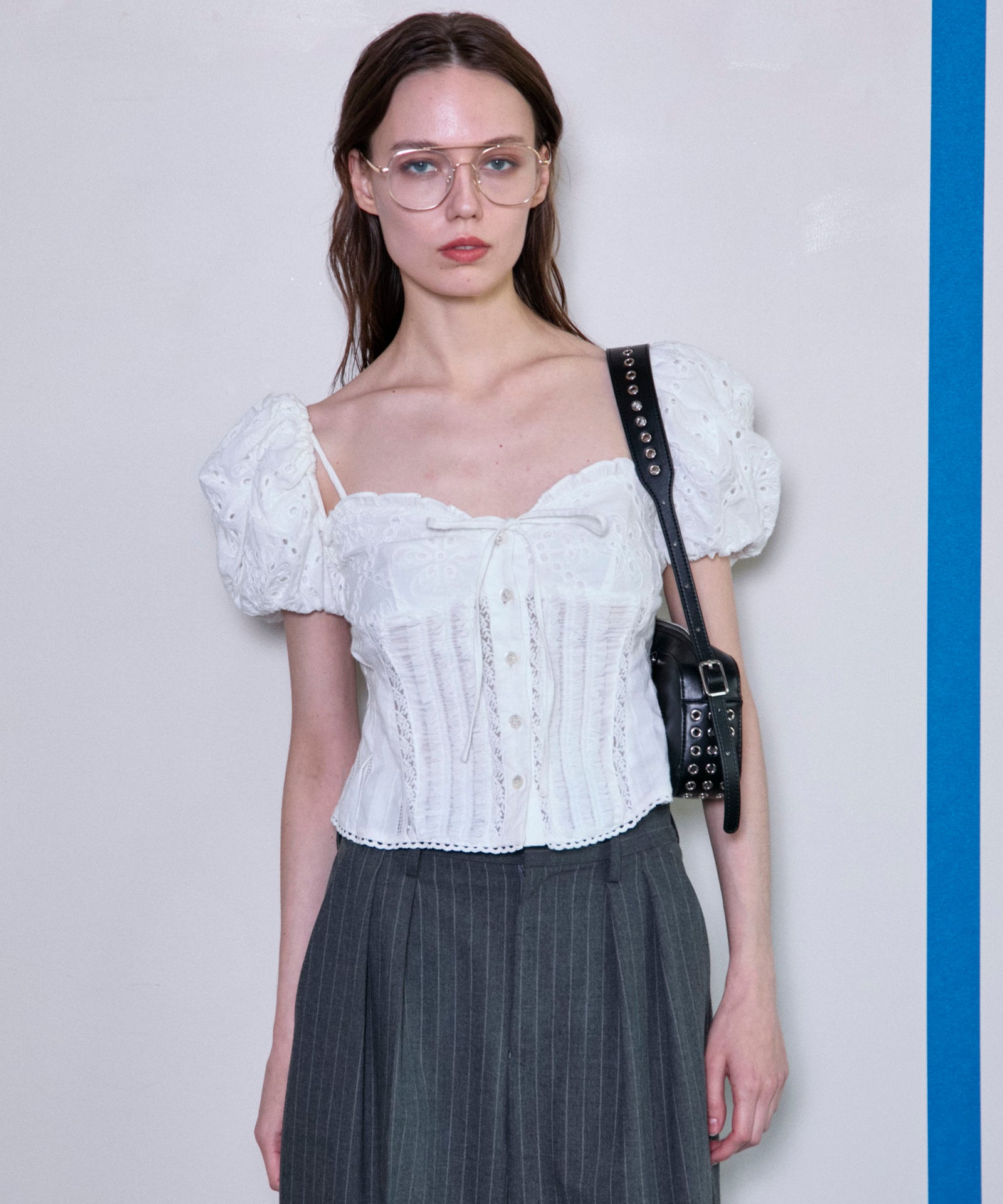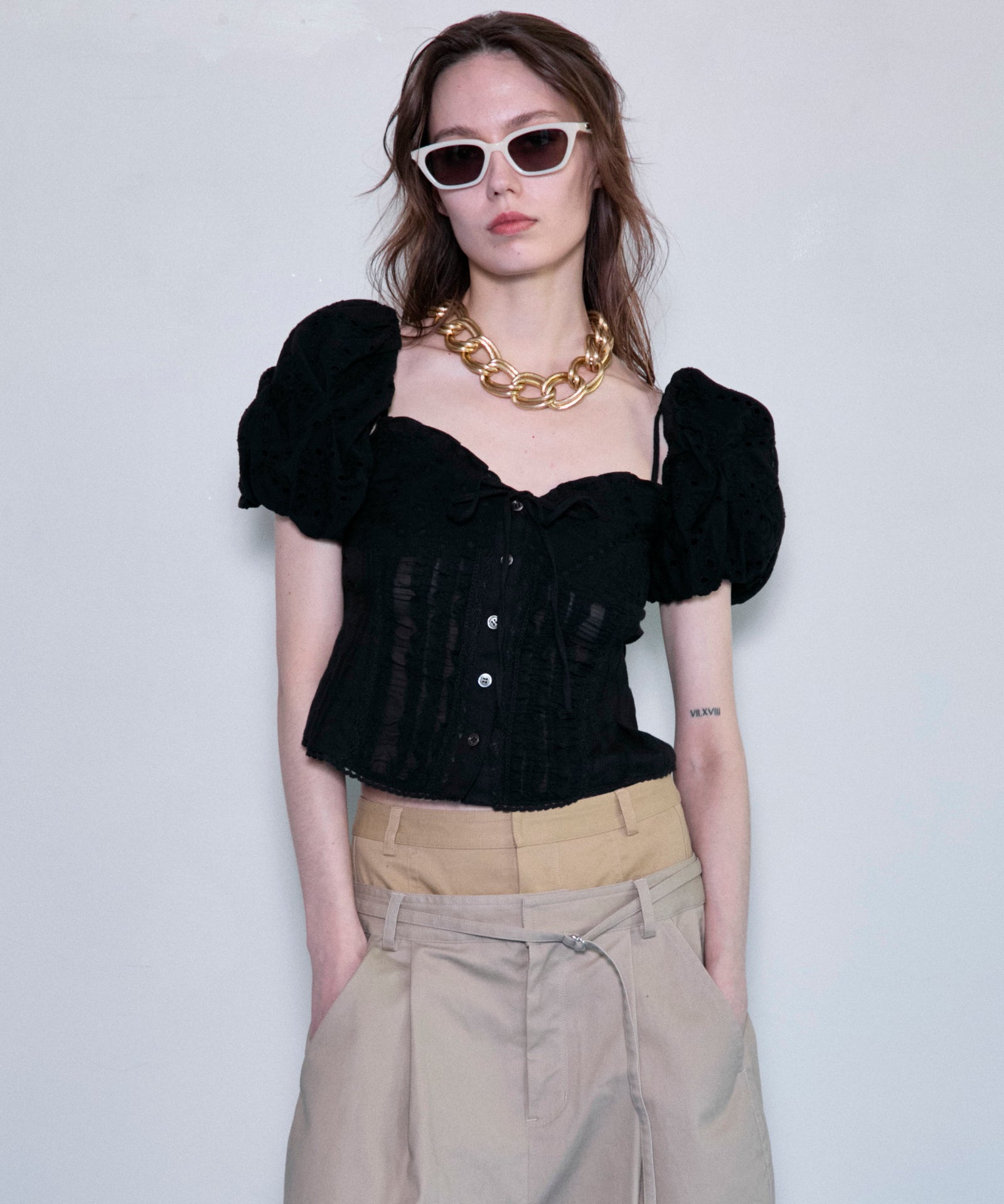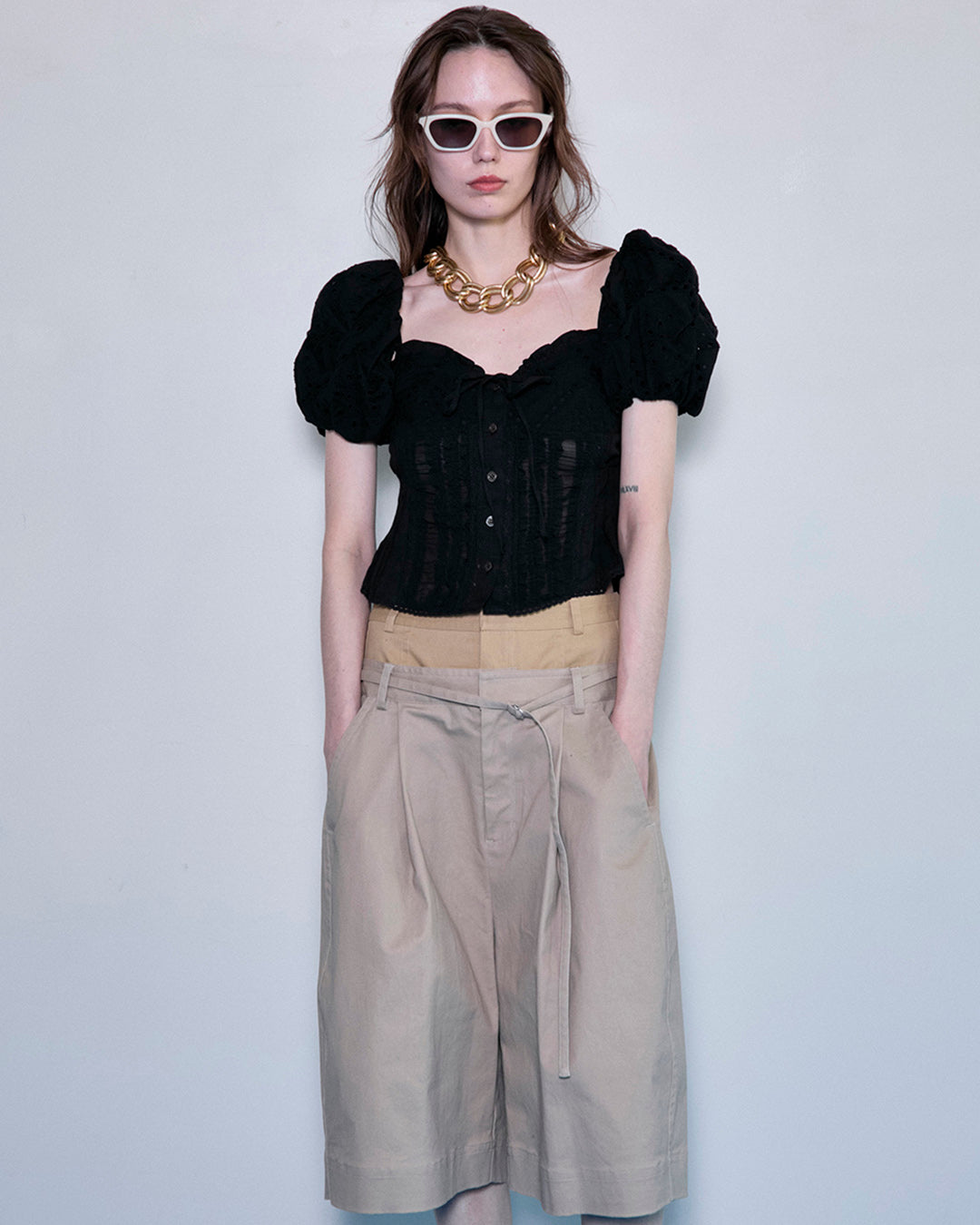 たっぷりギャザー入りのパフスリーブが印象的なビスチェ風ブラウス。カジュアルなハーフパンツを合わせて。合わせるボトムにより甘め辛め両方楽しめるマストバイアイテム!