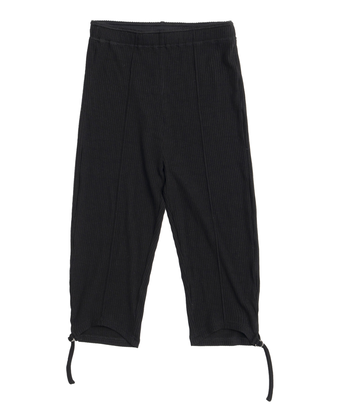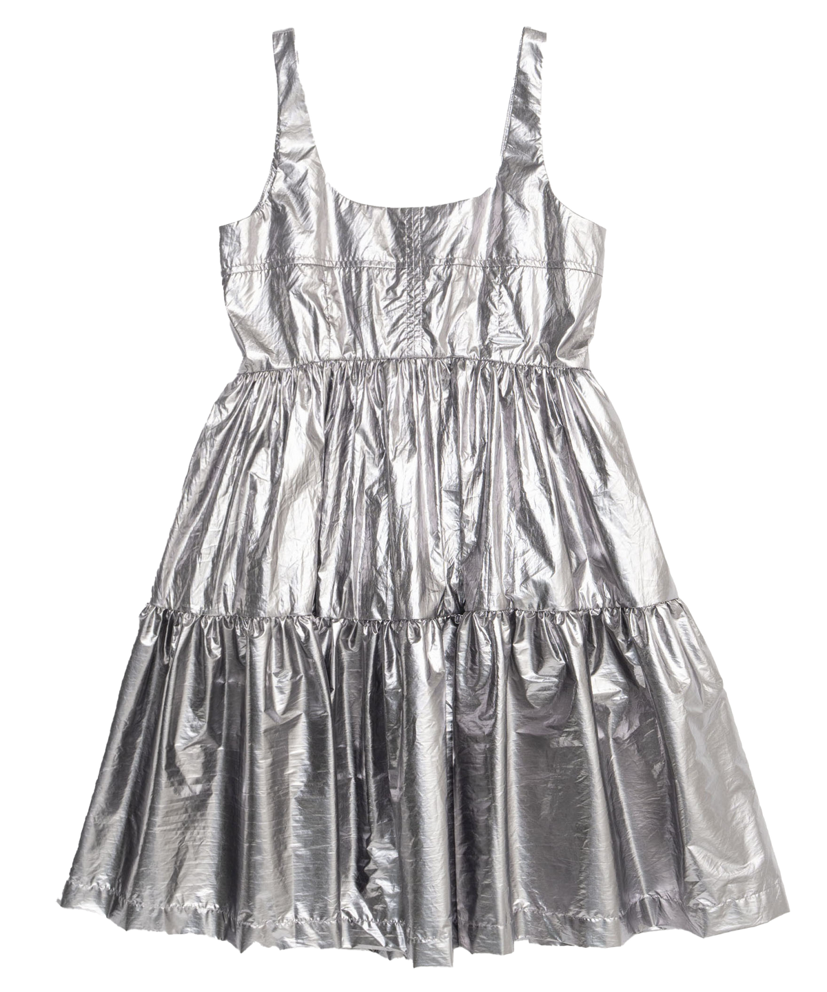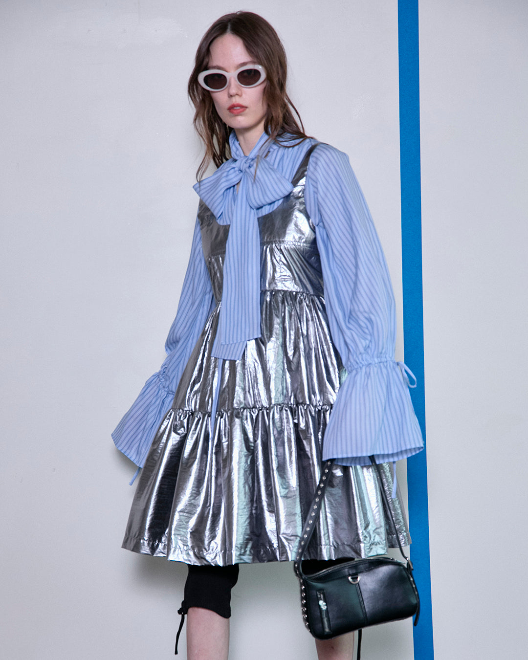 フロントの大きなリボンタイが印象的なとろみブラウスには相反するメタリック素材のワンピースをレイヤード。今年らしいカプリパンツ、小物は全てブラックで統一。