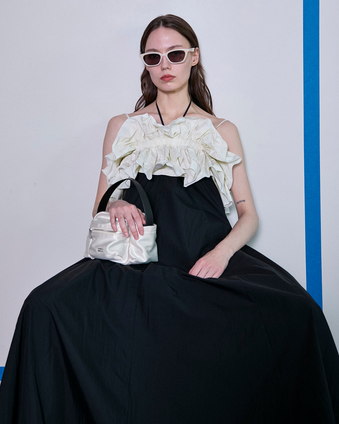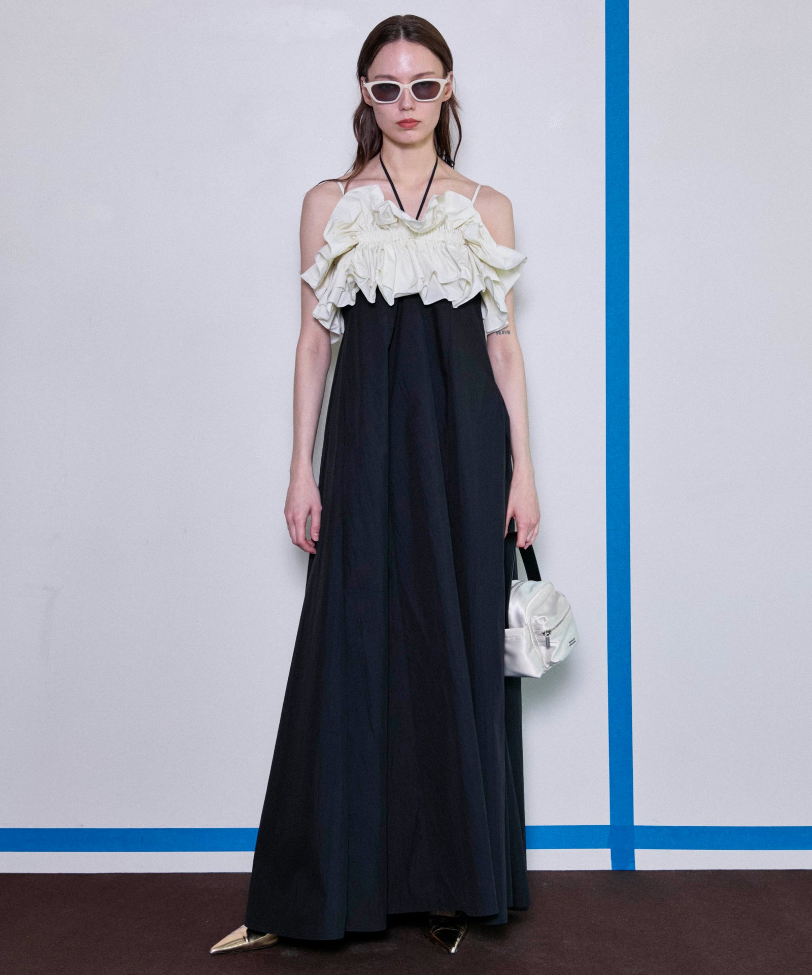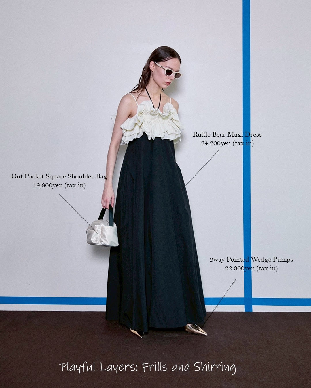 大胆なフリルギャザーが目を惹くビスチェとベアワンピースのレイヤードアイテム。たっぷりとしたフレアは動く度に揺れ上品さも。ビスチェは他のスタイリングにもおすすめ。