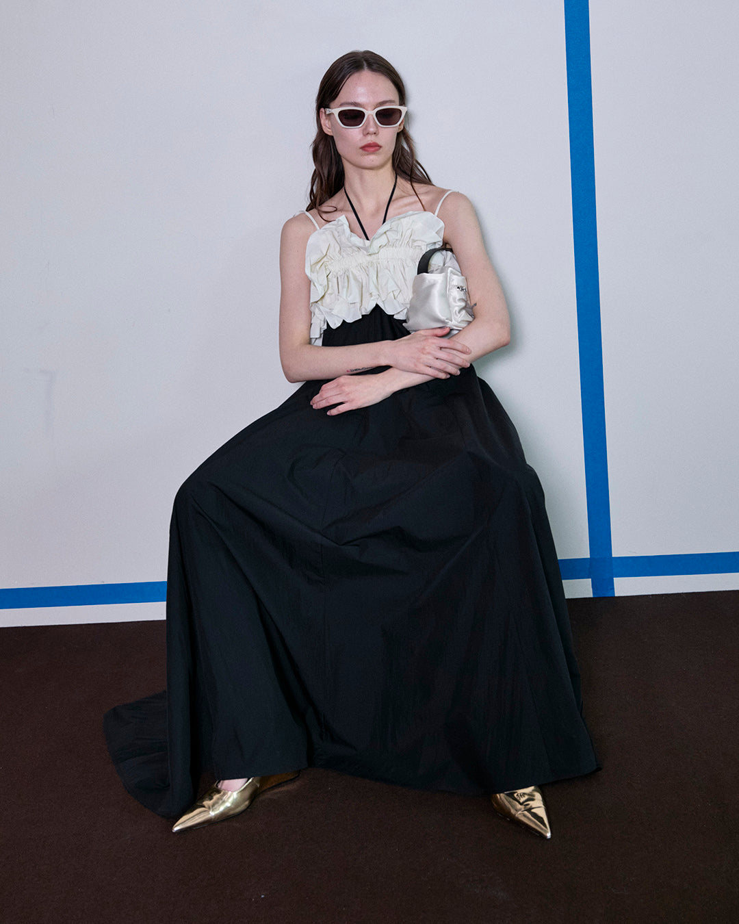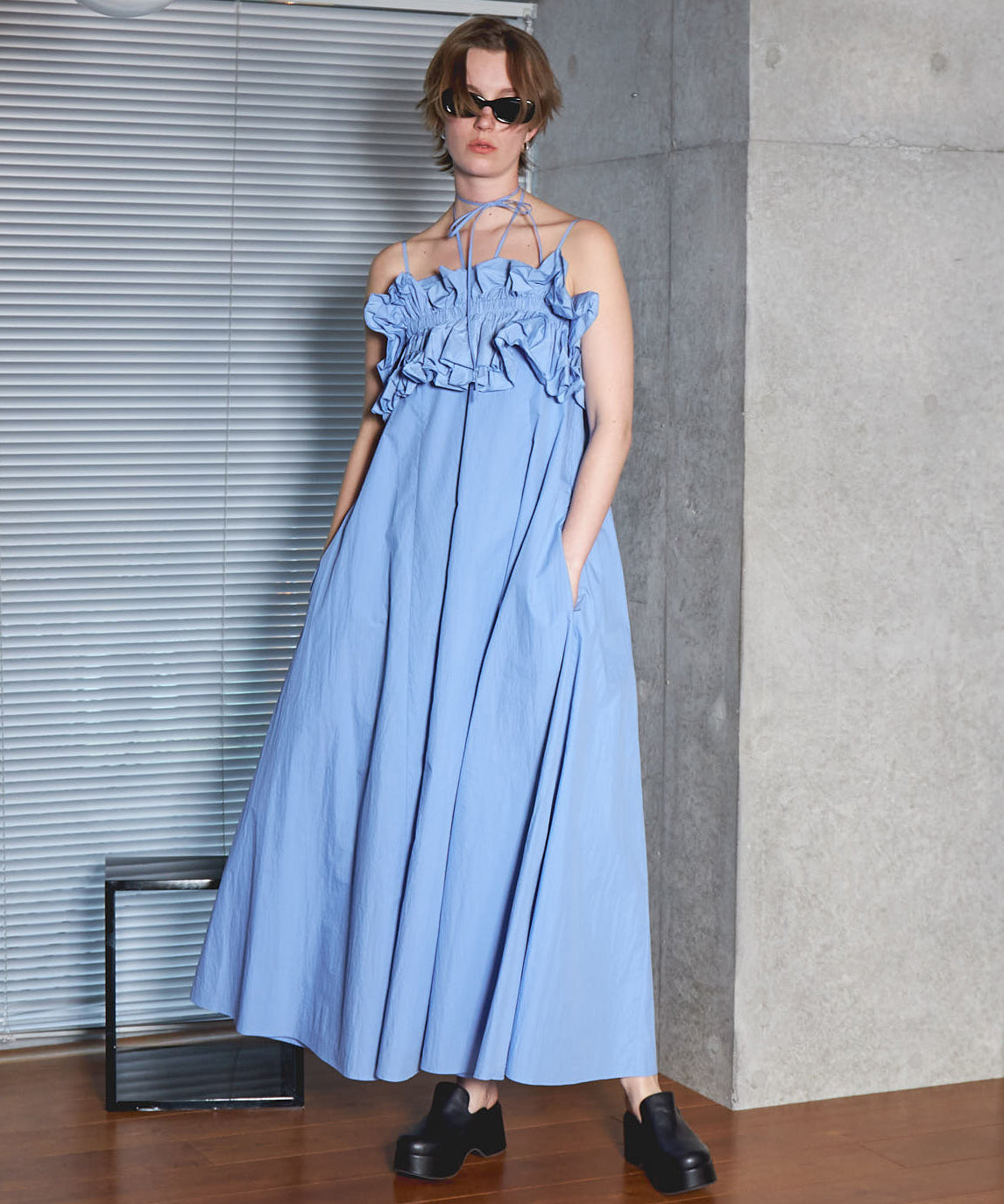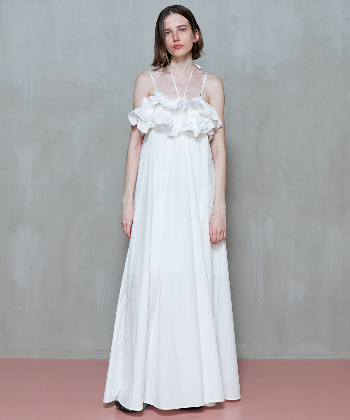 大胆なフリルギャザーが目を惹くビスチェとベアワンピースのレイヤードアイテム。たっぷりとしたフレアは動く度に揺れ上品さも。ビスチェは他のスタイリングにもおすすめ。