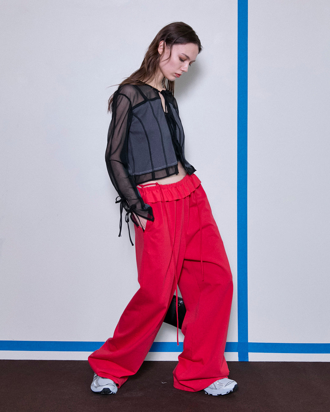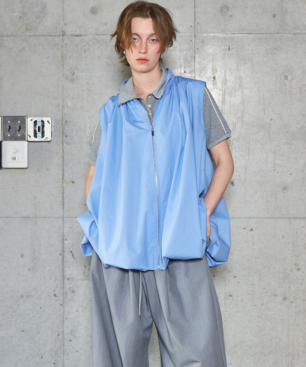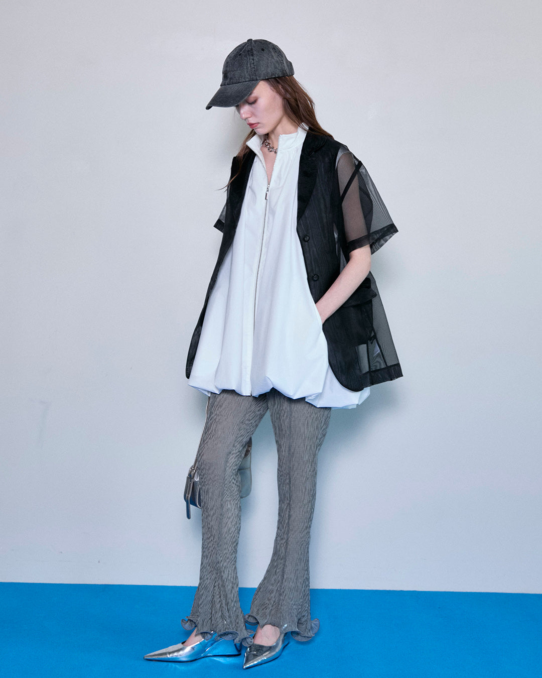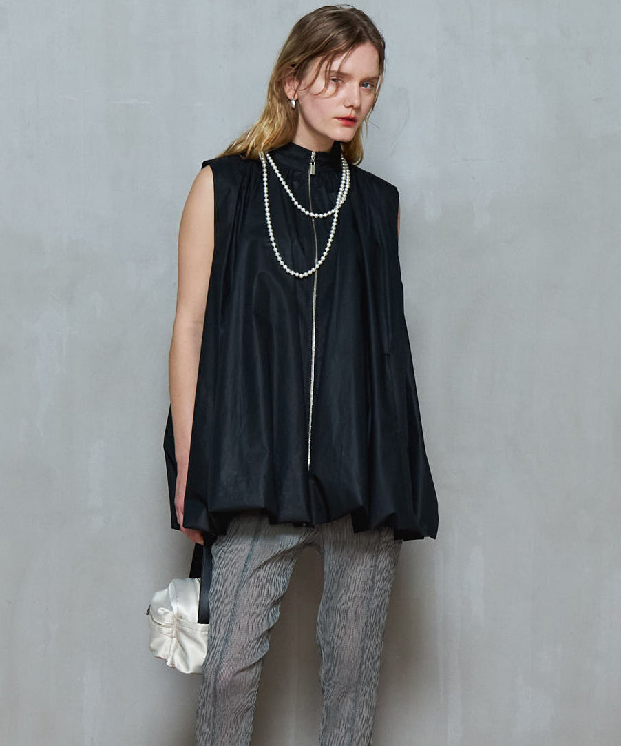 ふわっとしたバルーンシルエットが印象的なノースリーブブラウブラウス。細身のパンツを合わせシルエットにメリハリをもたせたスタイリング。裾がラッフルのパンツは美脚効果抜群。