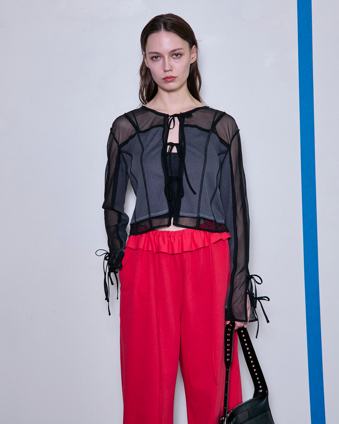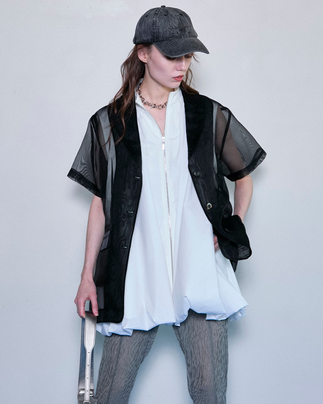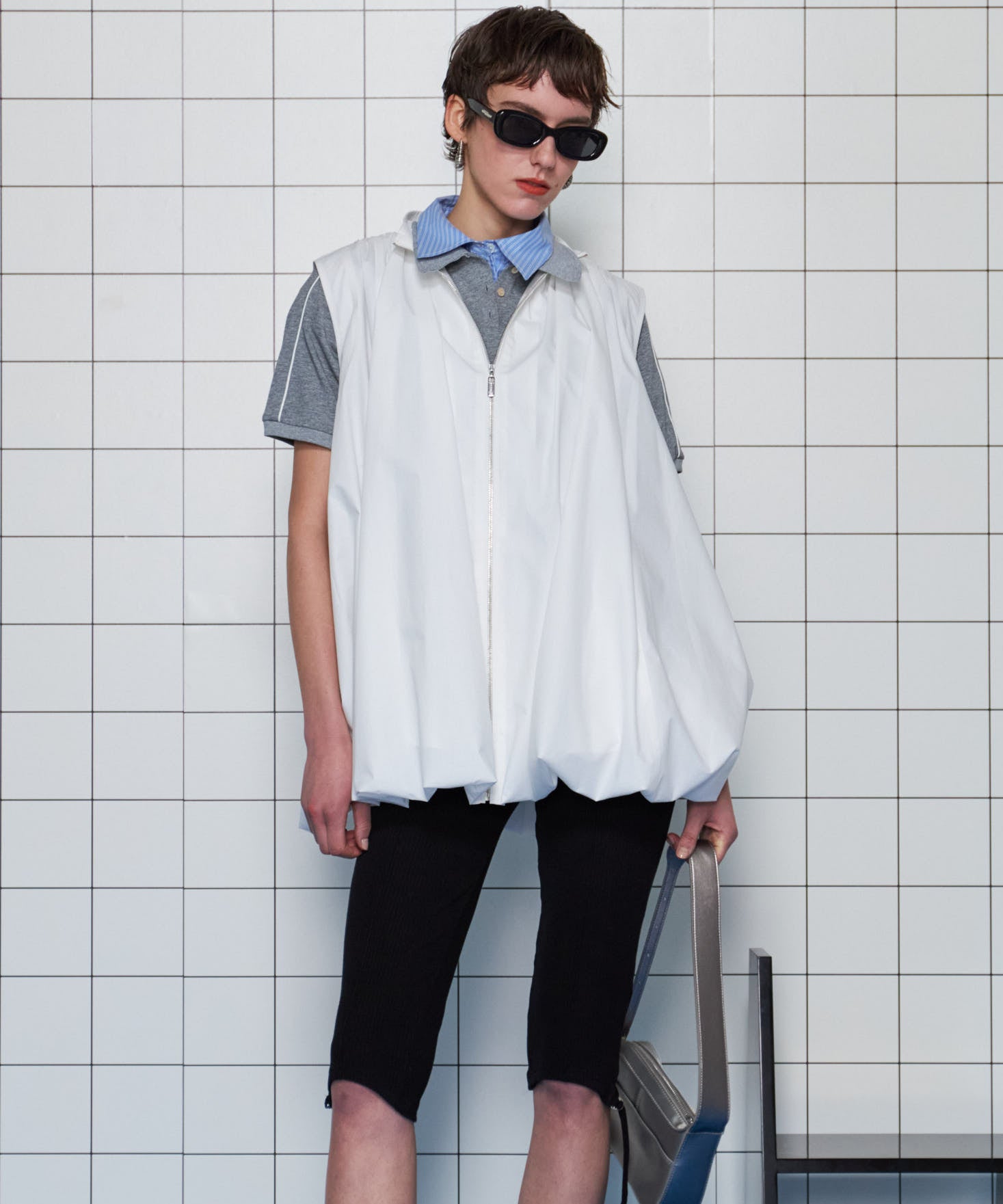 ふわっとしたバルーンシルエットが印象的なノースリーブブラウブラウス。細身のパンツを合わせシルエットにメリハリをもたせたスタイリング。裾がラッフルのパンツは美脚効果抜群。