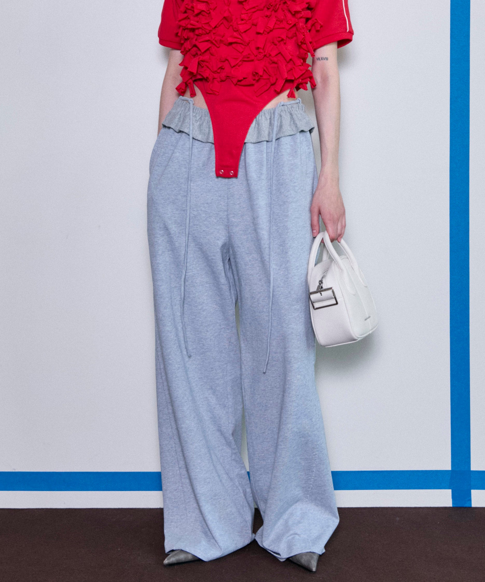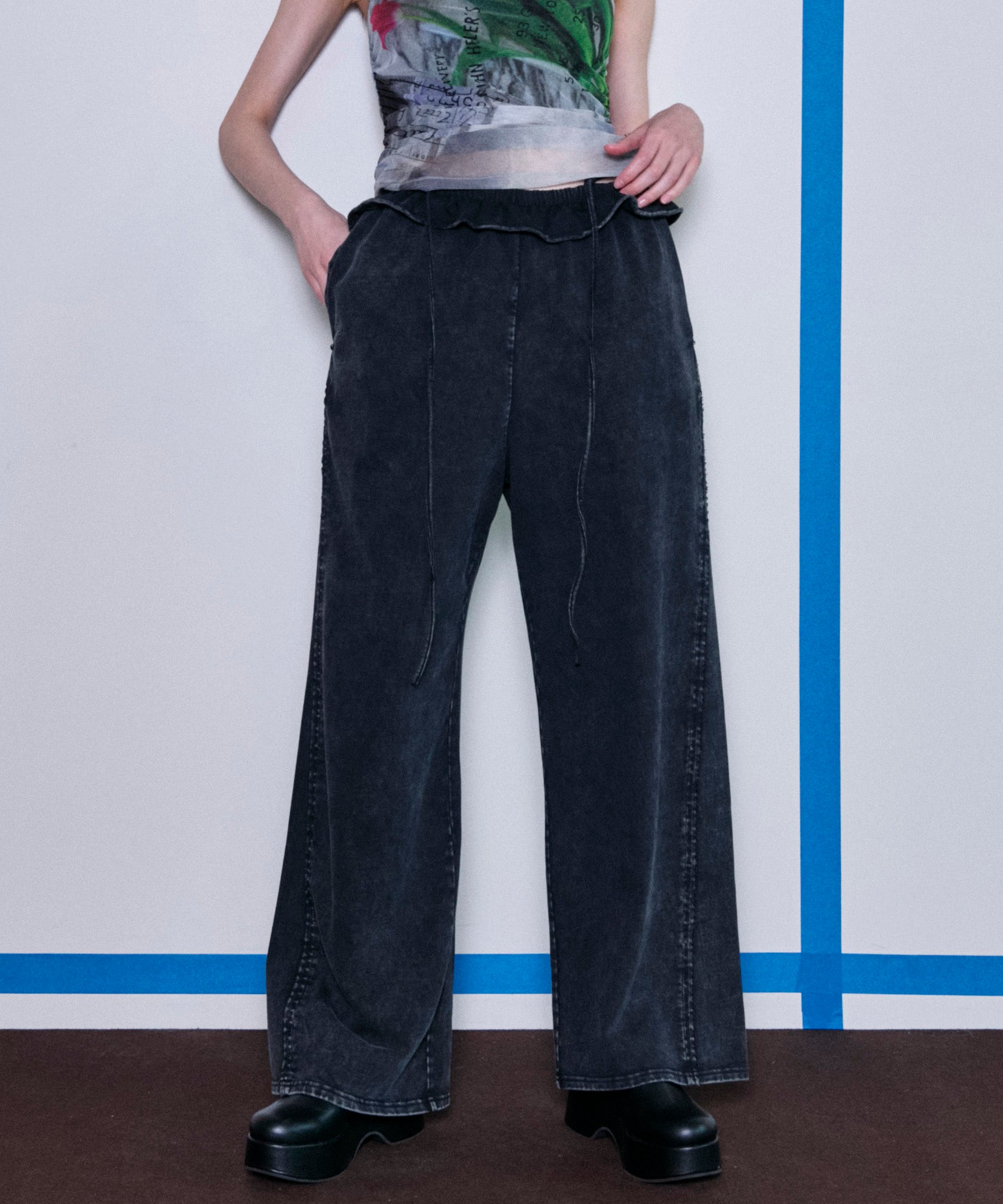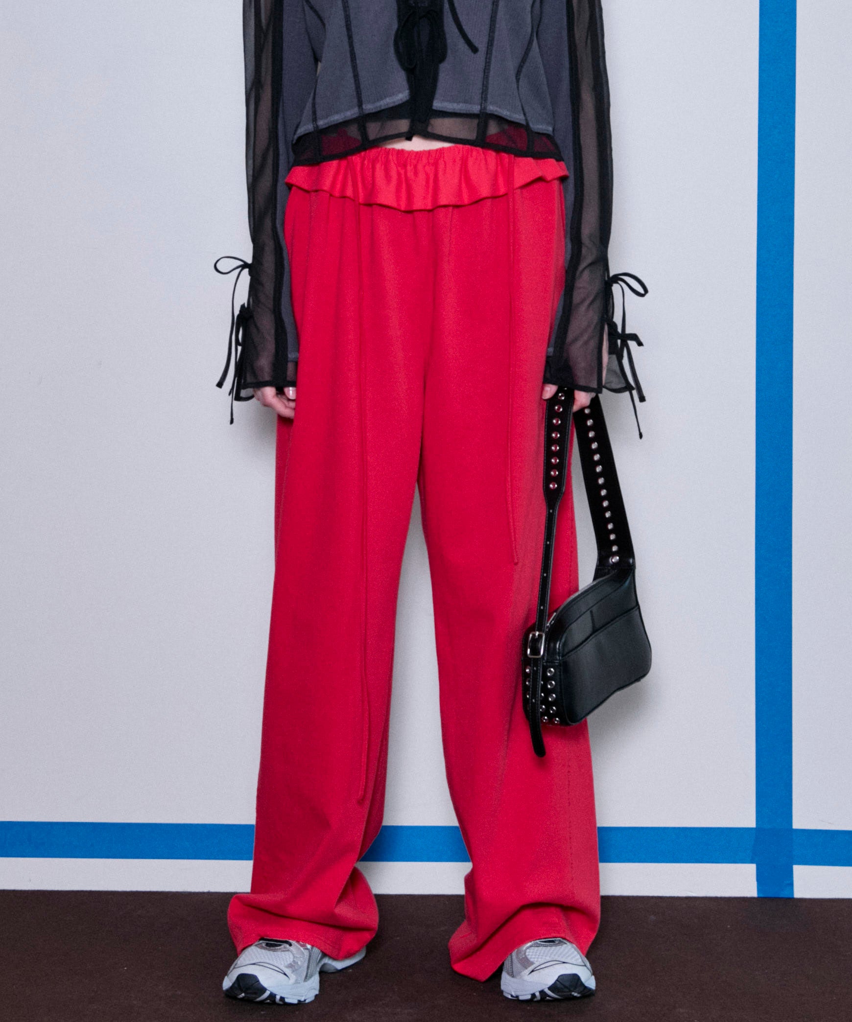 ウエストのさり気なくいフリルがポイントのスウェットパンツ。カジュアルな印象のアイテムもフリル一つでレディな印象に。リラックス感漂うスタイリングの中にフリル・リボンディティールを。