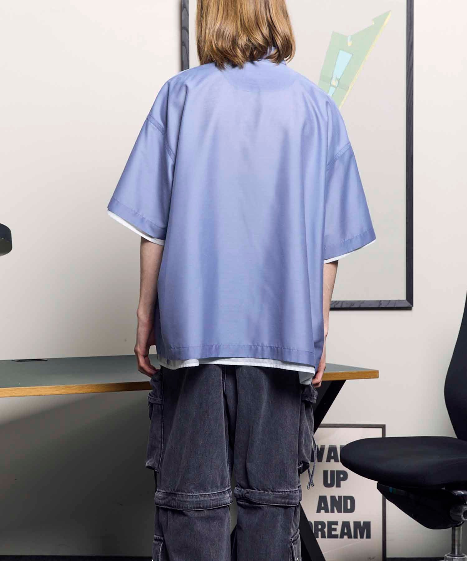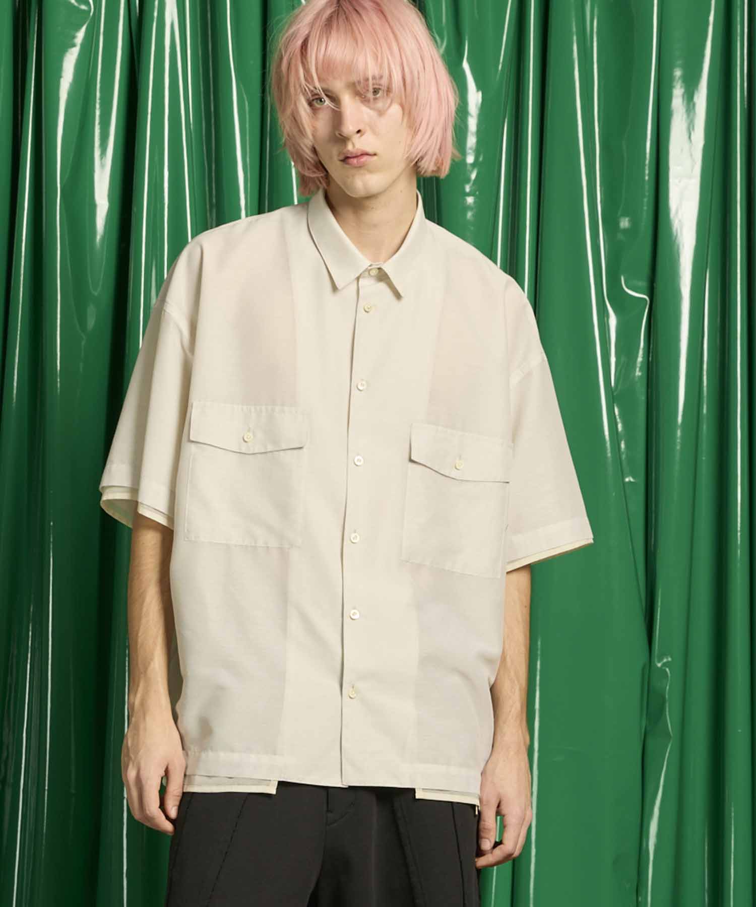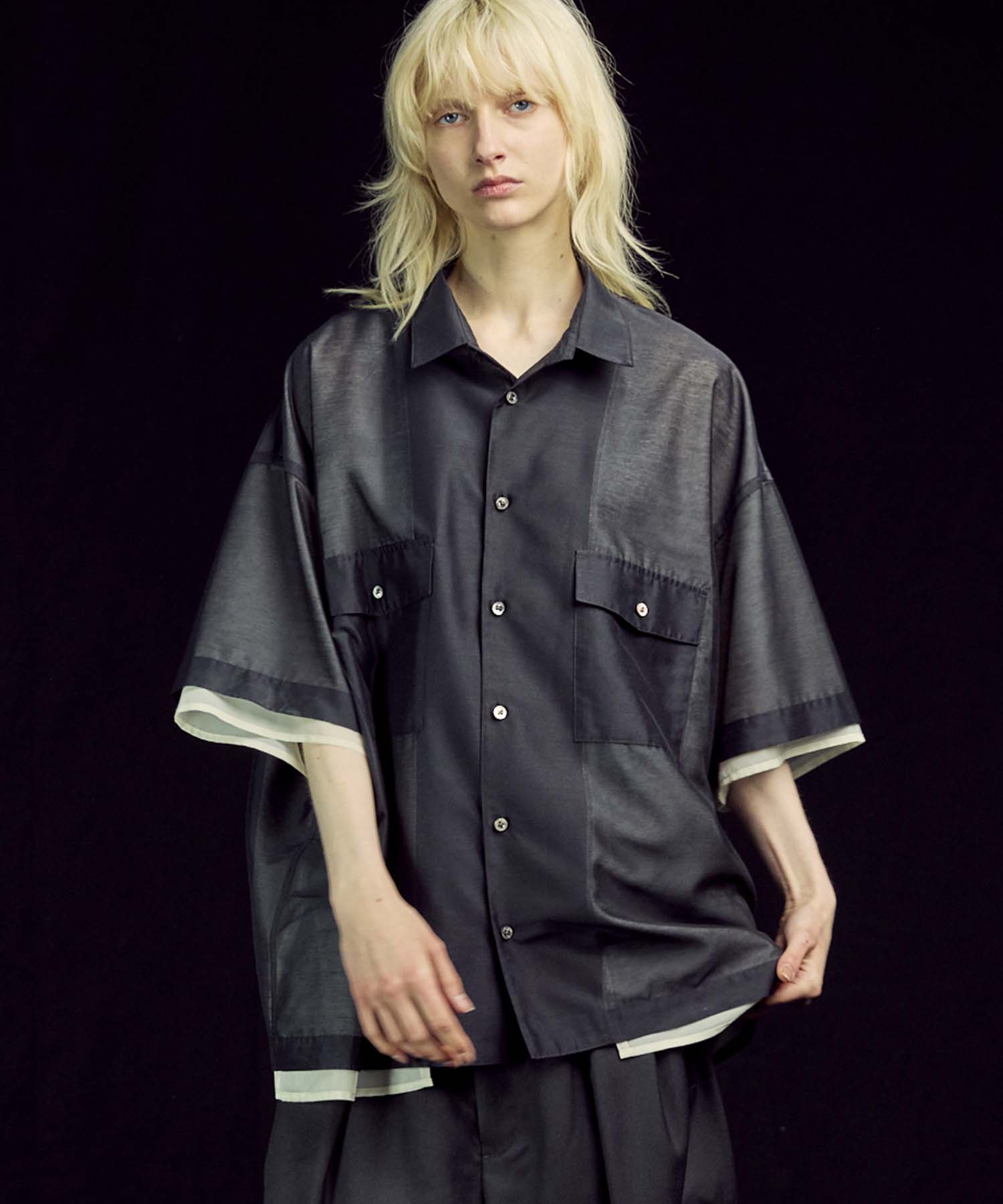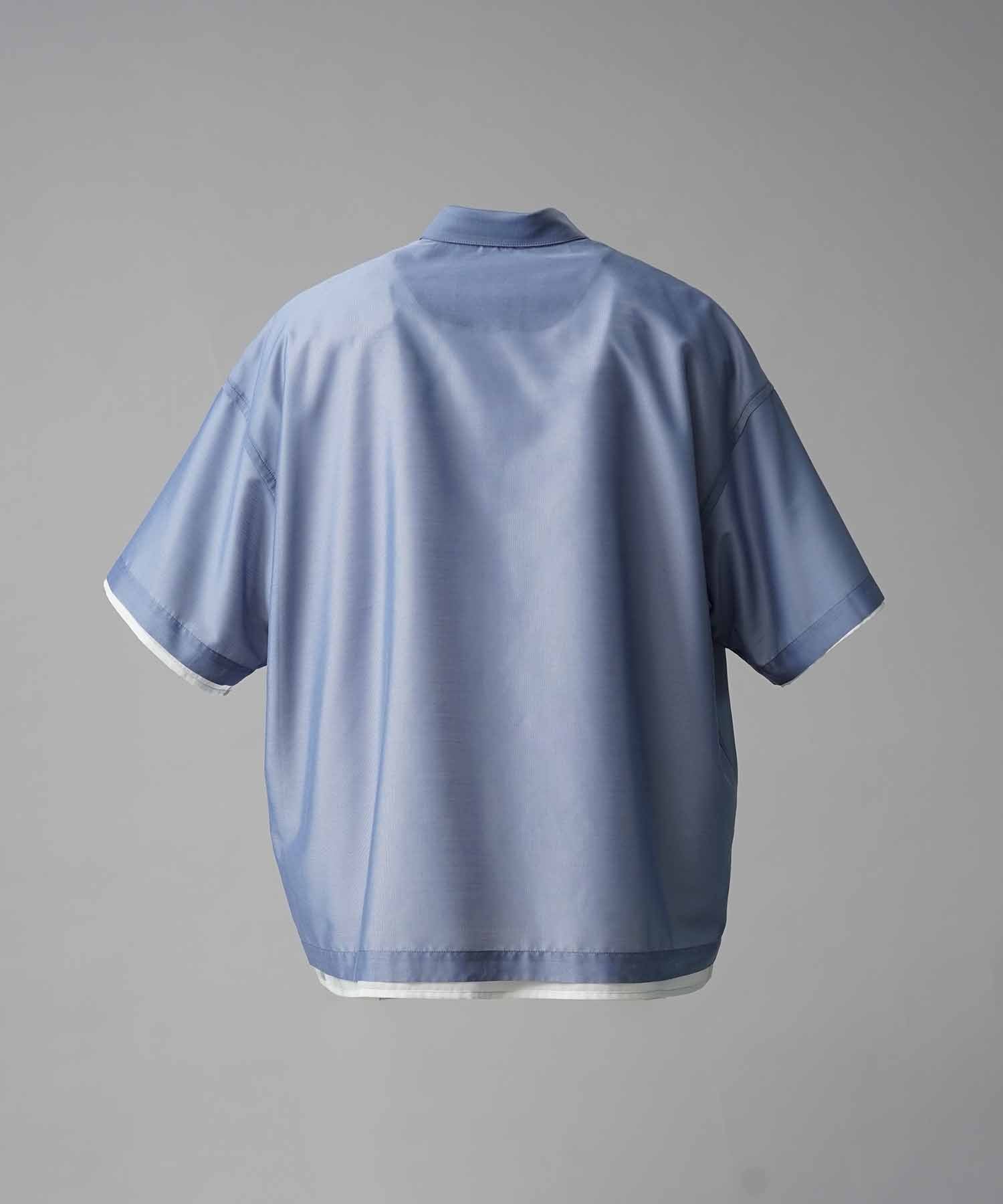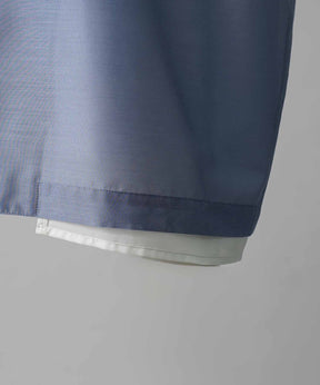 ドイツのカールマイヤー機を使用した、軽量かつ薄いシアーなポリエステル素材と、光沢のあるポリエステル素材を裏側に組み合わせ、袖と裾から出るよう設定し1枚でレイヤードしたデザインを表現。