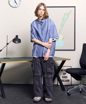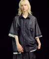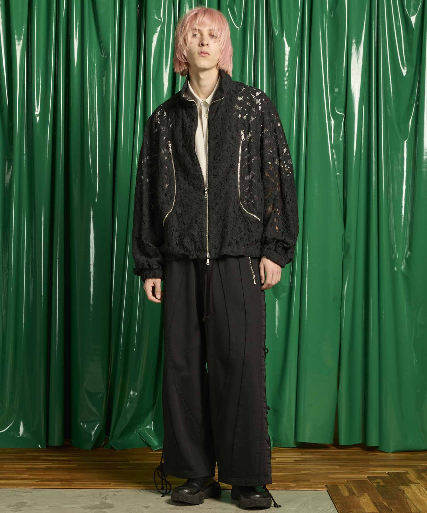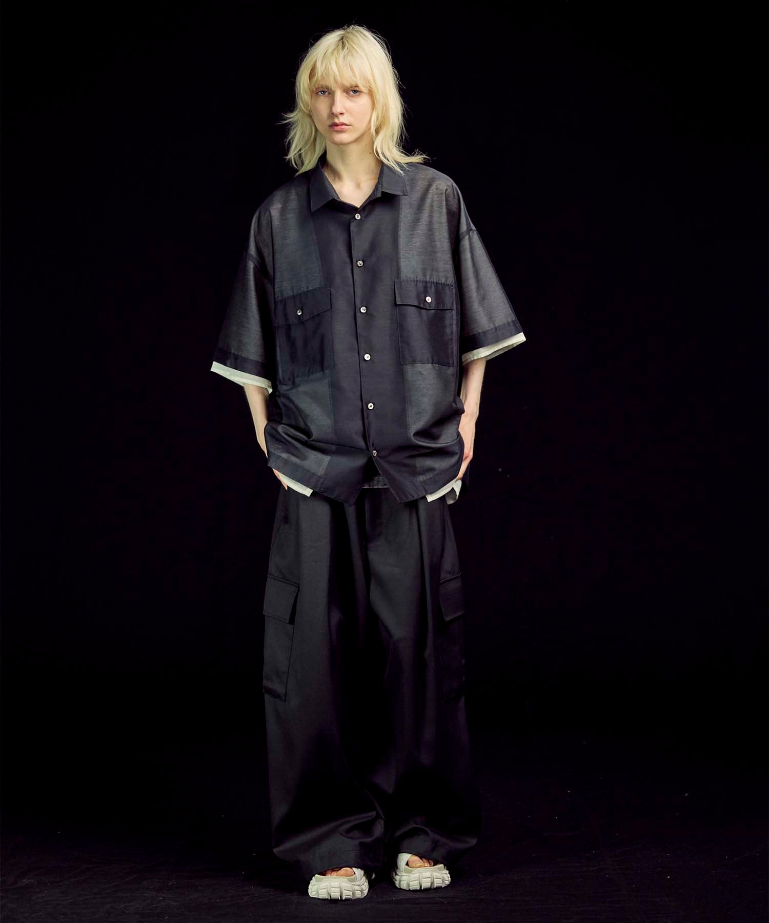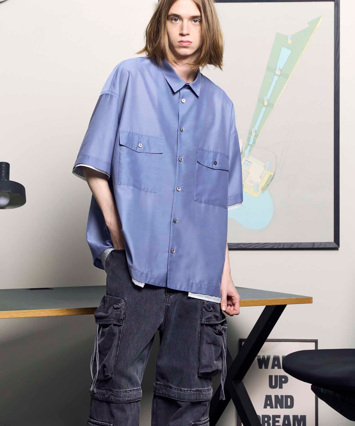 ドイツのカールマイヤー機を使用した、軽量かつ薄いシアーなポリエステル素材と、光沢のあるポリエステル素材を裏側に組み合わせ、袖と裾から出るよう設定し1枚でレイヤードしたデザインを表現。