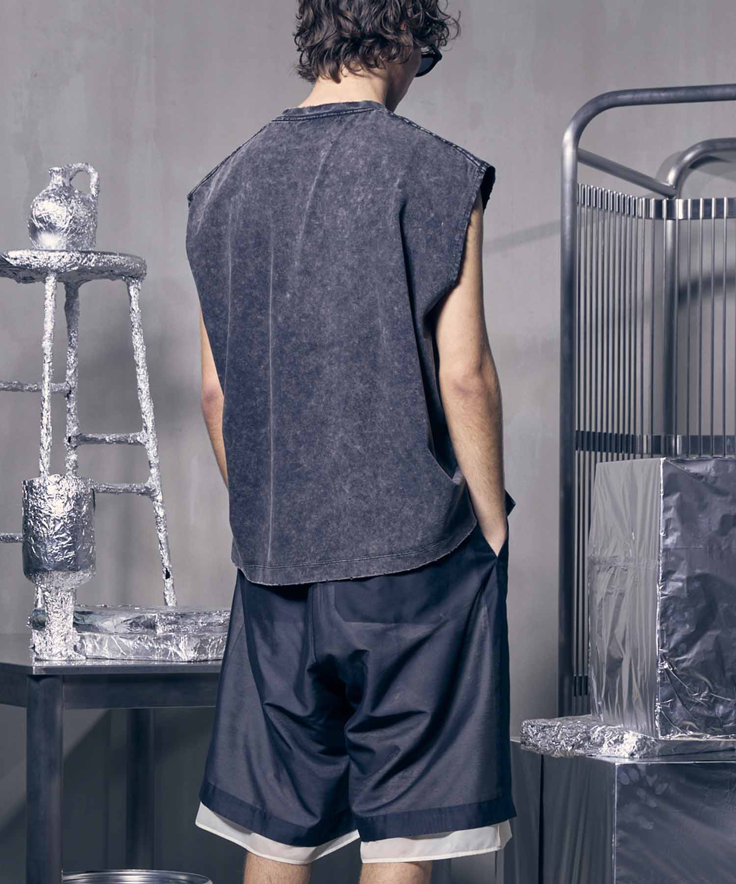 1枚で着てさまになるよう、アームも広げ過ぎず、腕が綺麗に収まるよう調整したノースリーブ。