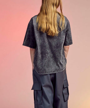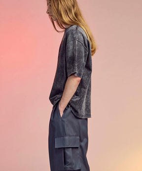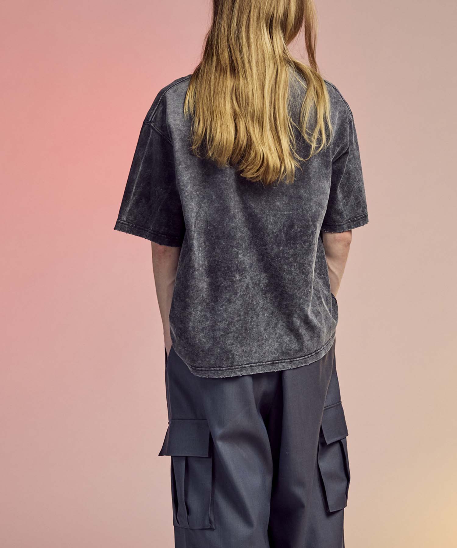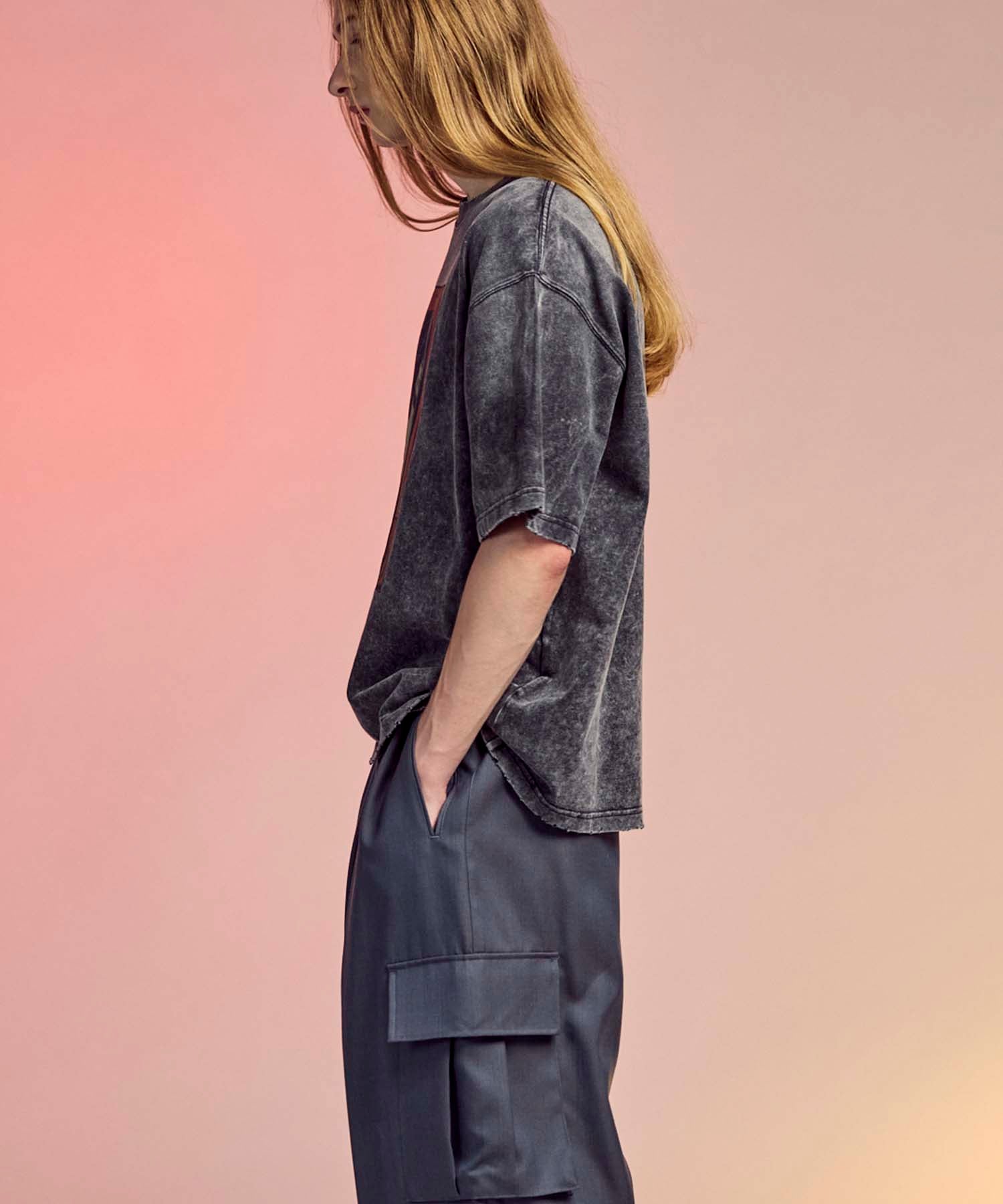 ヘビーウェイトながら着心地を意識した糸番手にすることで、ごわつきを軽減し、気軽に着用出来るよう縫製後に硫化染めを行い、更にフロスト加工を重ねることで、長年着込んで洗いざらした様なリアルなユーズド感のある色と風合いを表現しております。