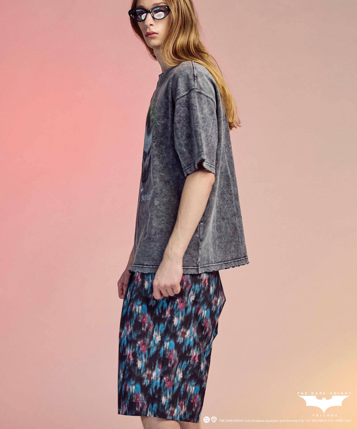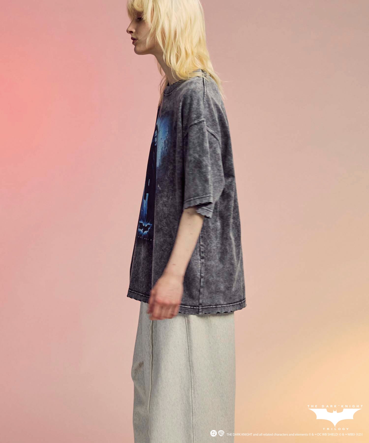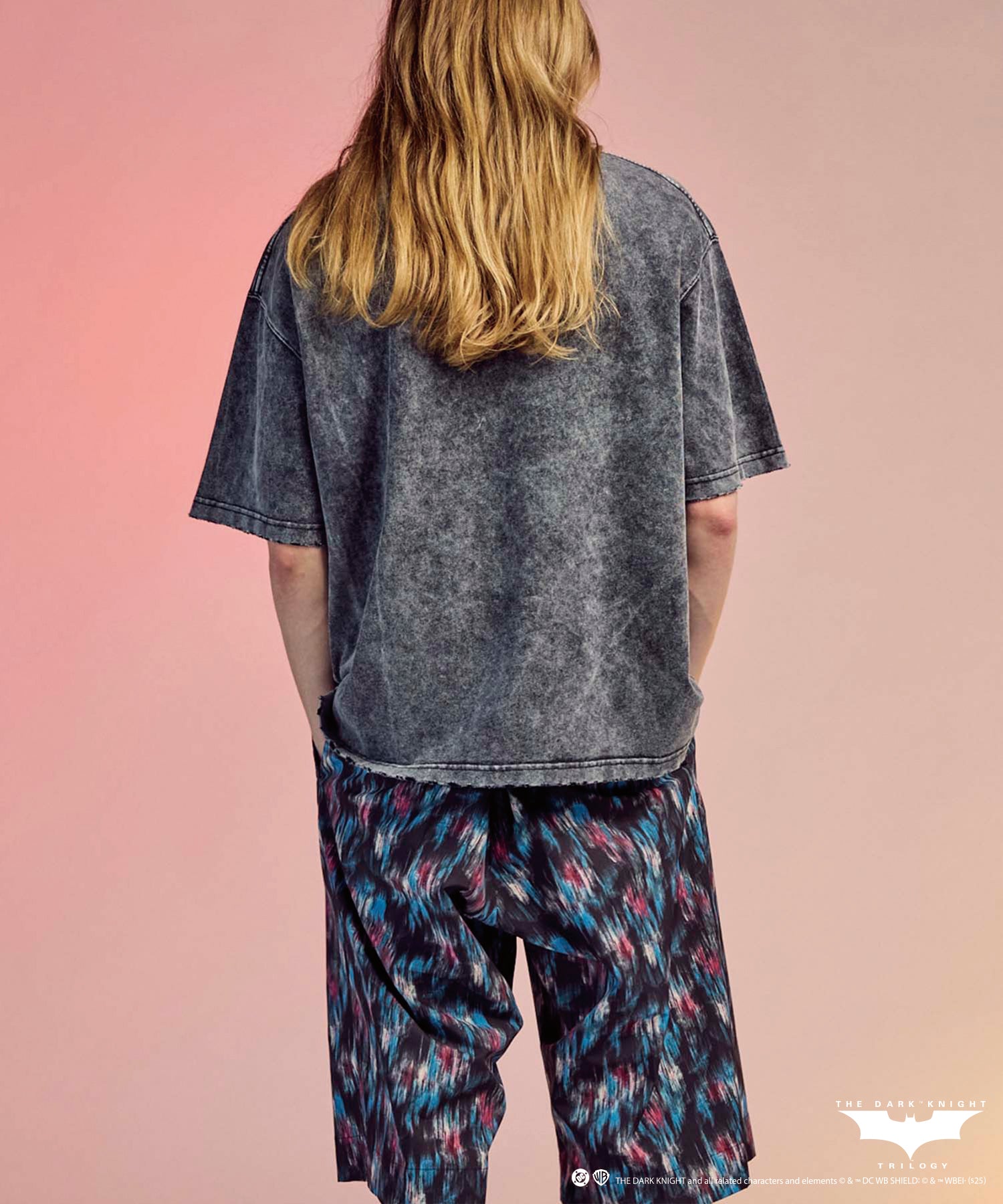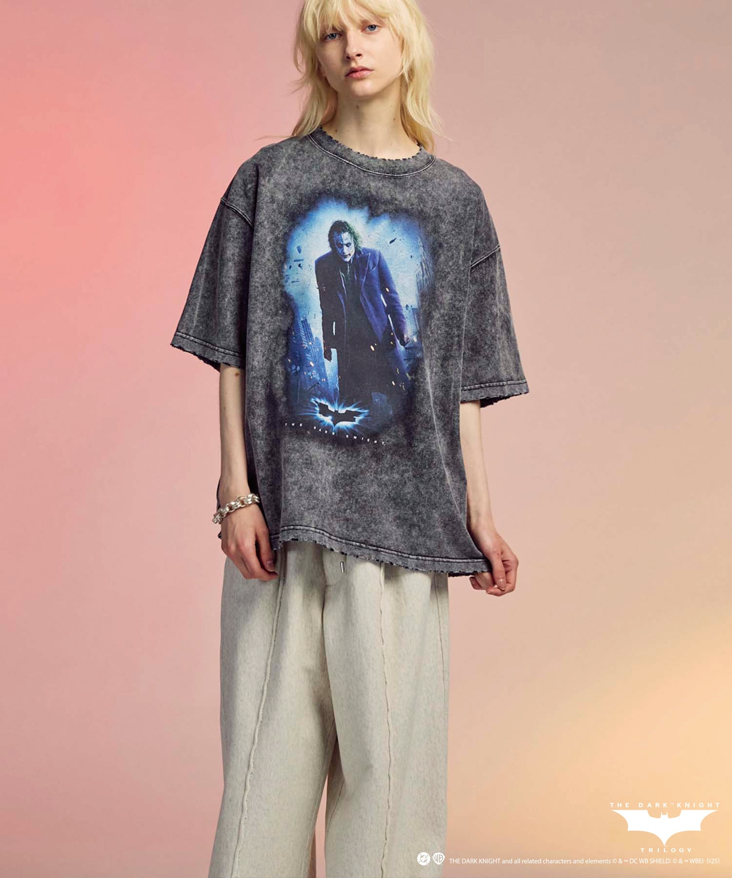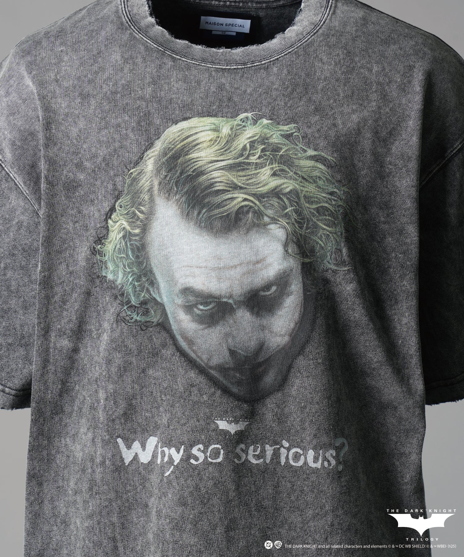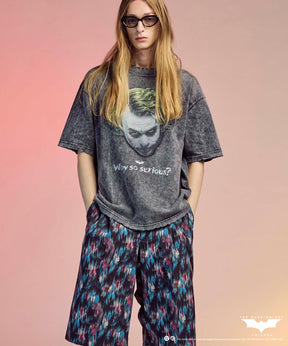 DCを代表するヒーロー、バットマンを描く映画作品『ダークナイト』より、ジョーカーのアイコニックなグラフィックをプリント。