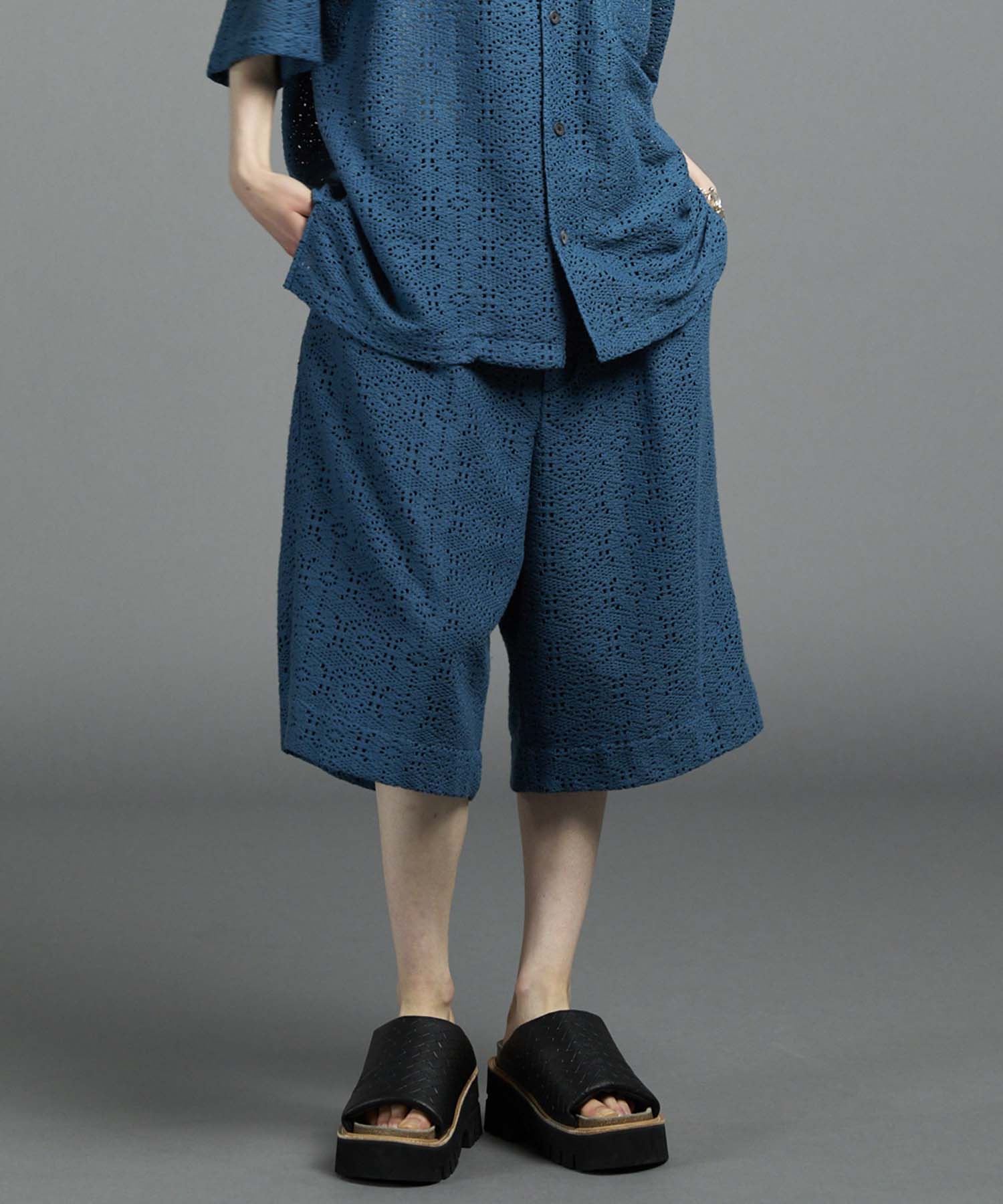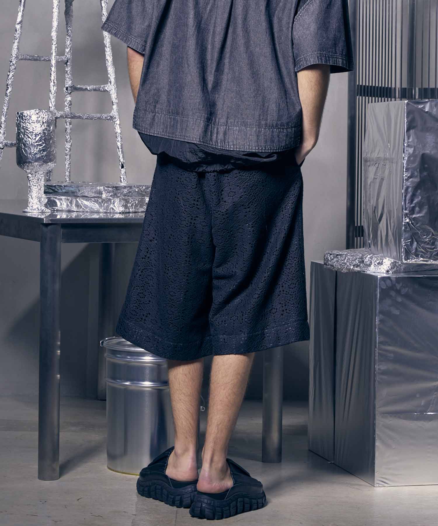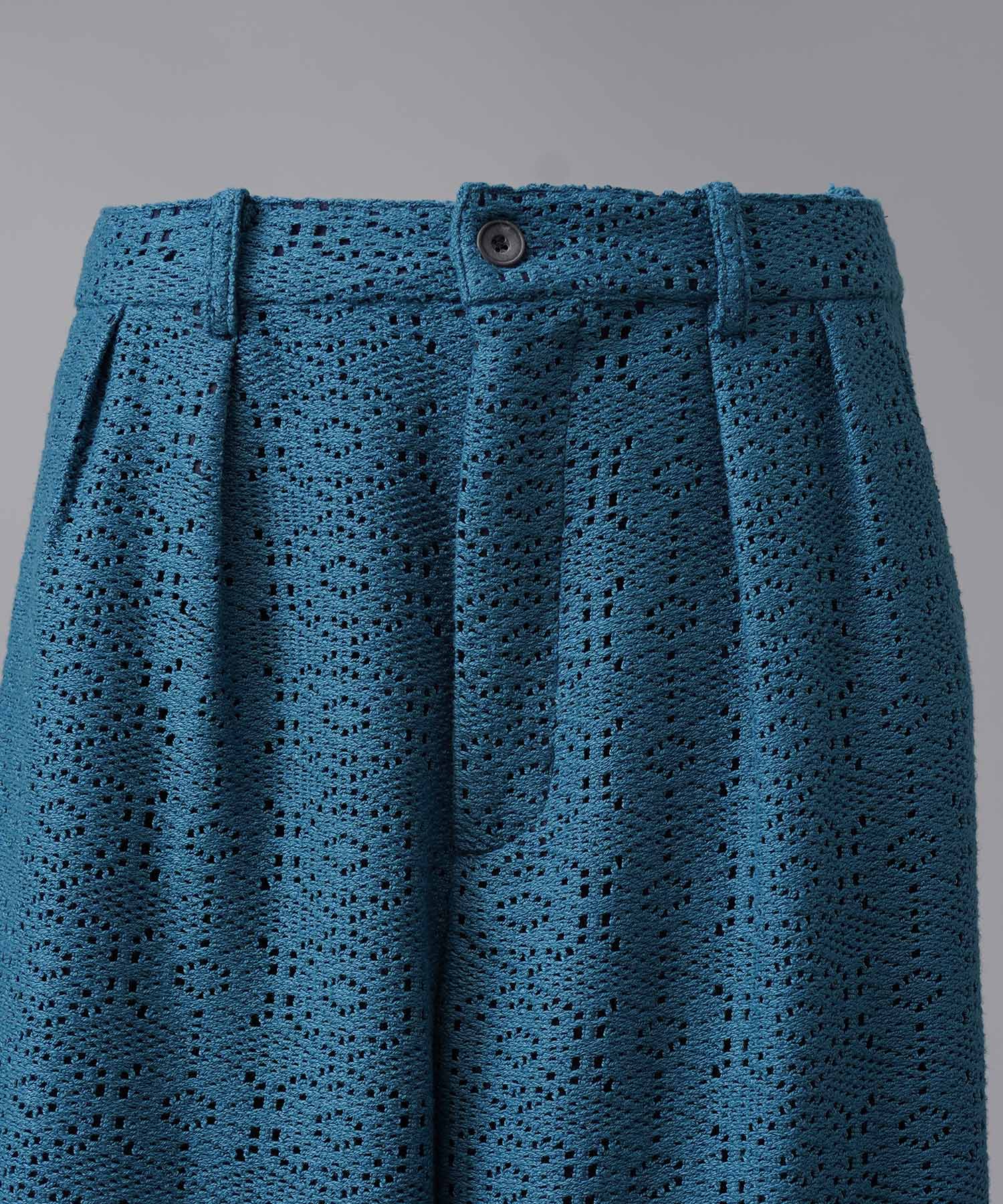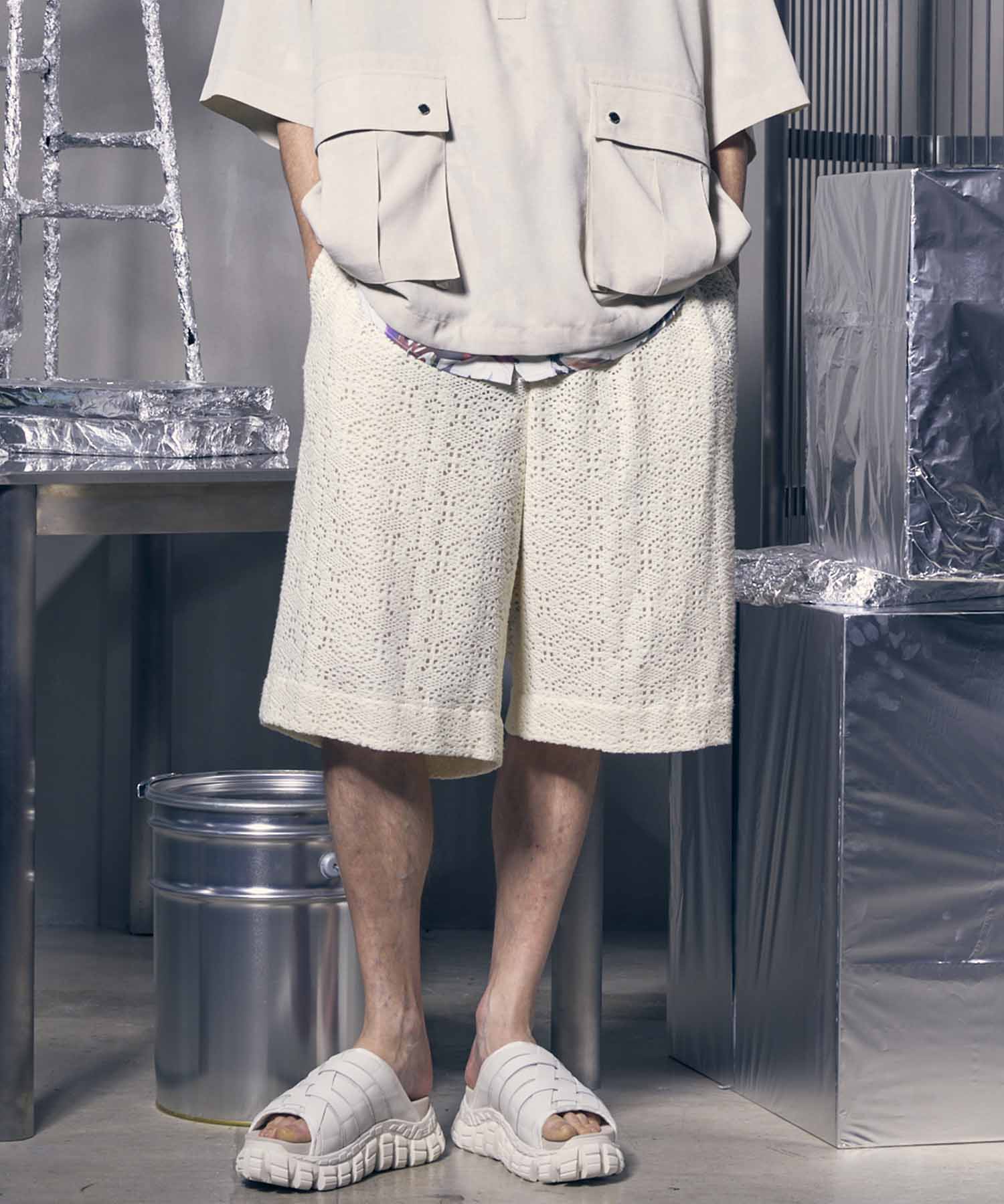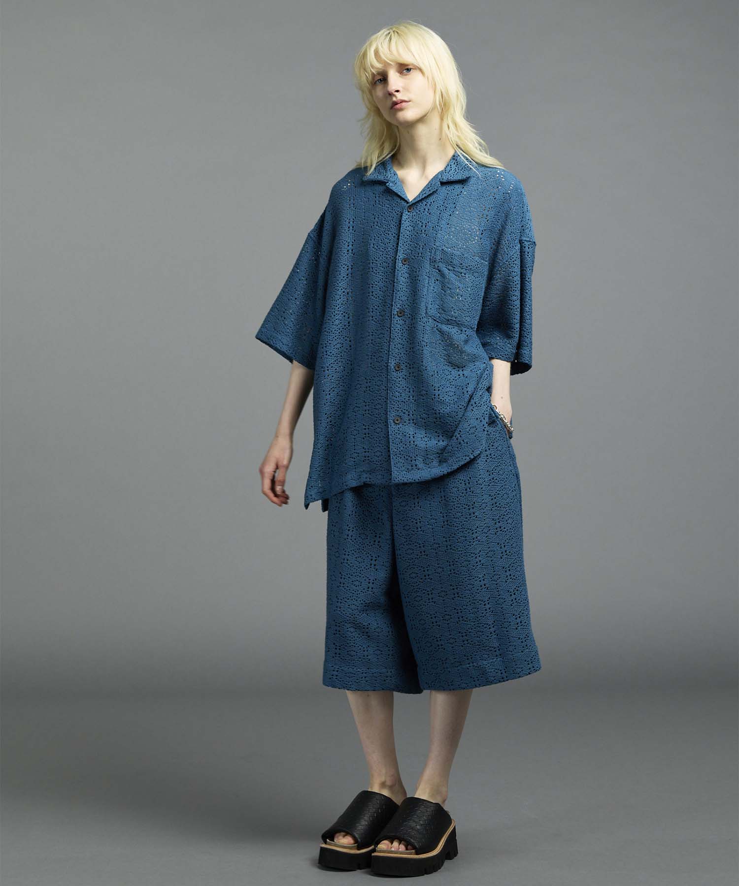 ■幾何学模様のクロシェ編みのような編地で、立体感と透け感がポイントのアイテム。