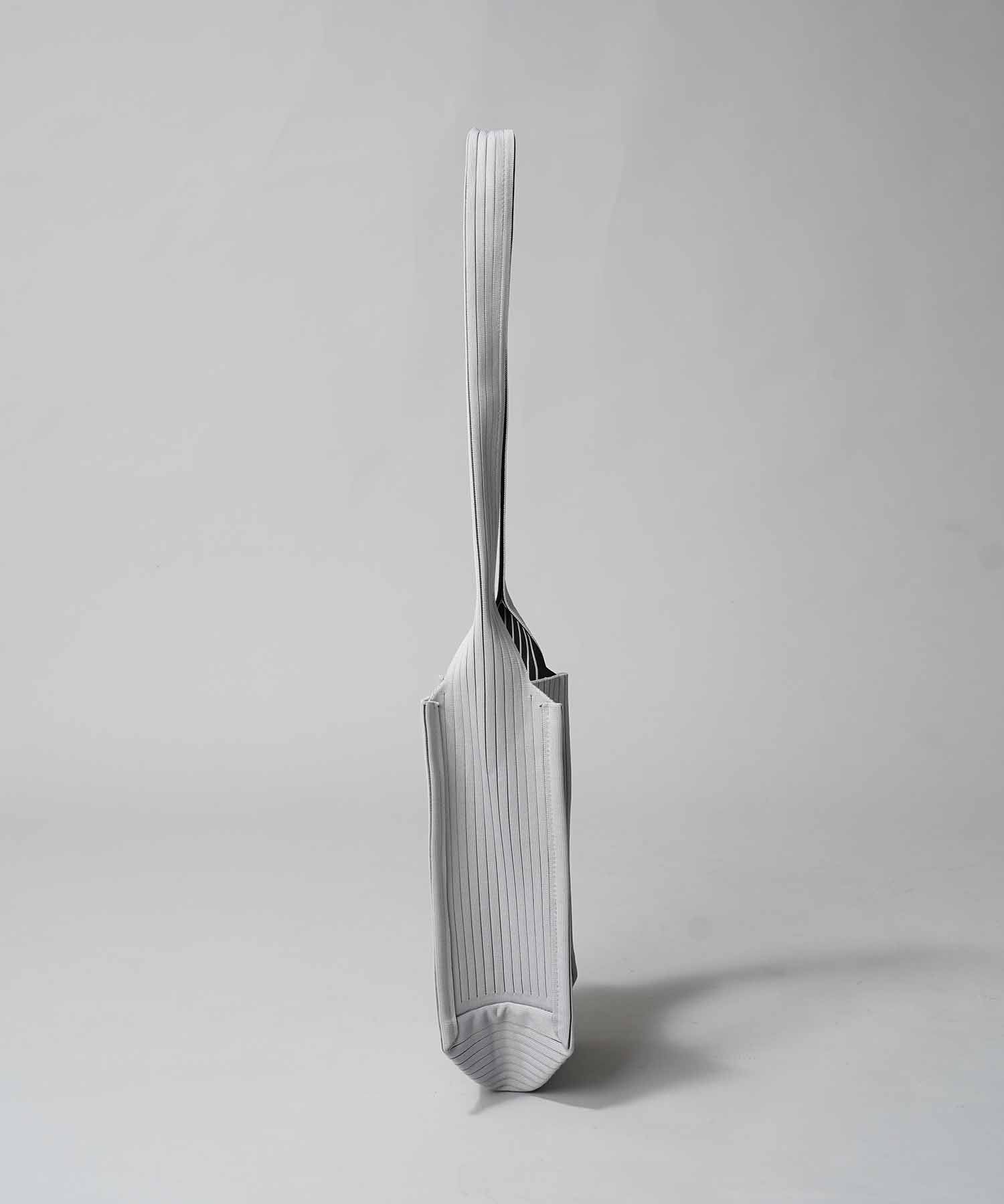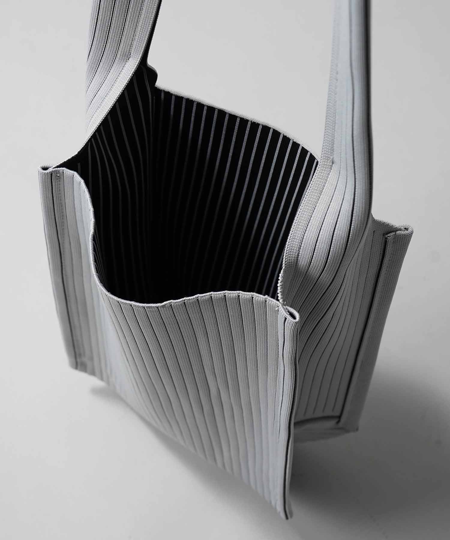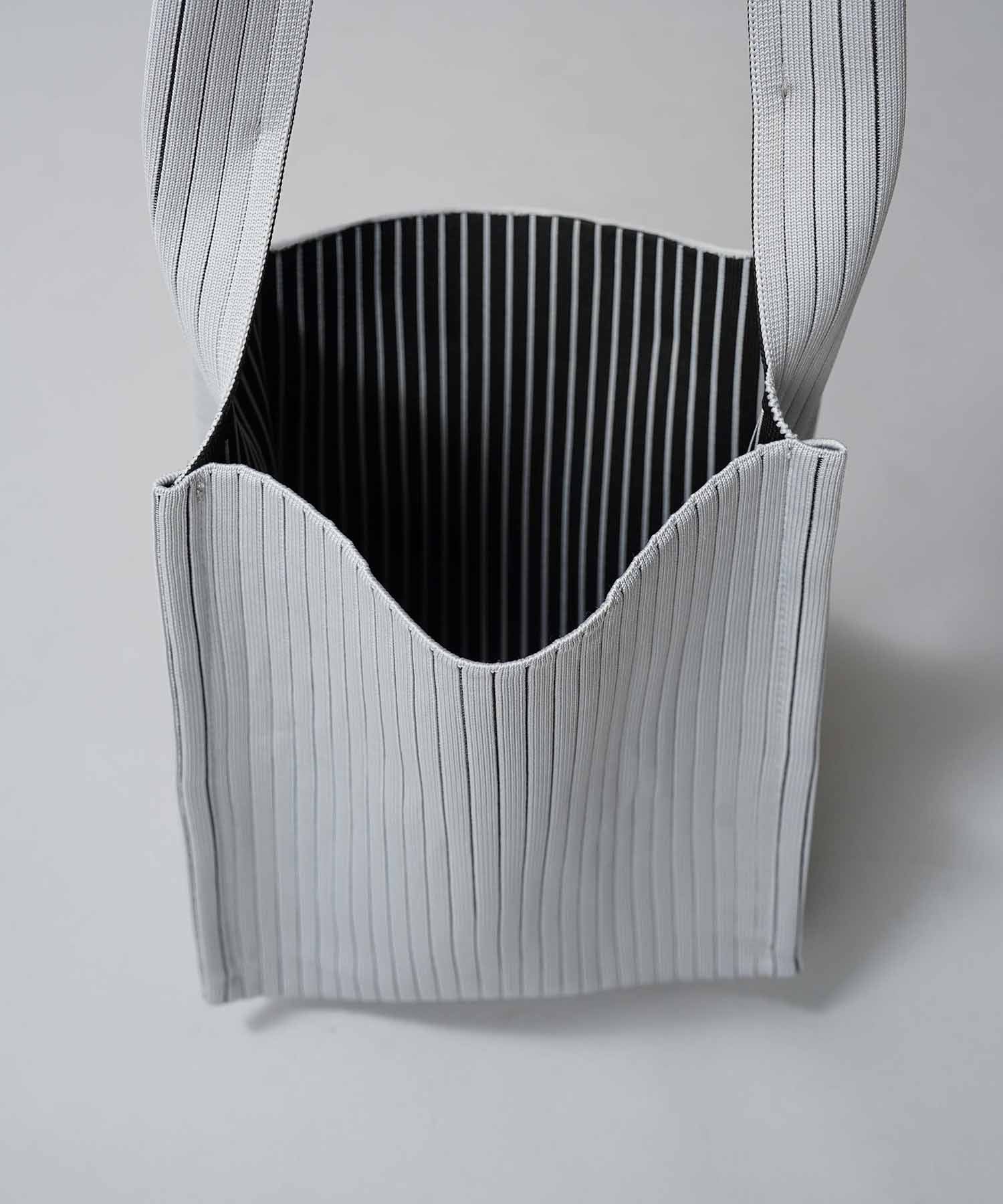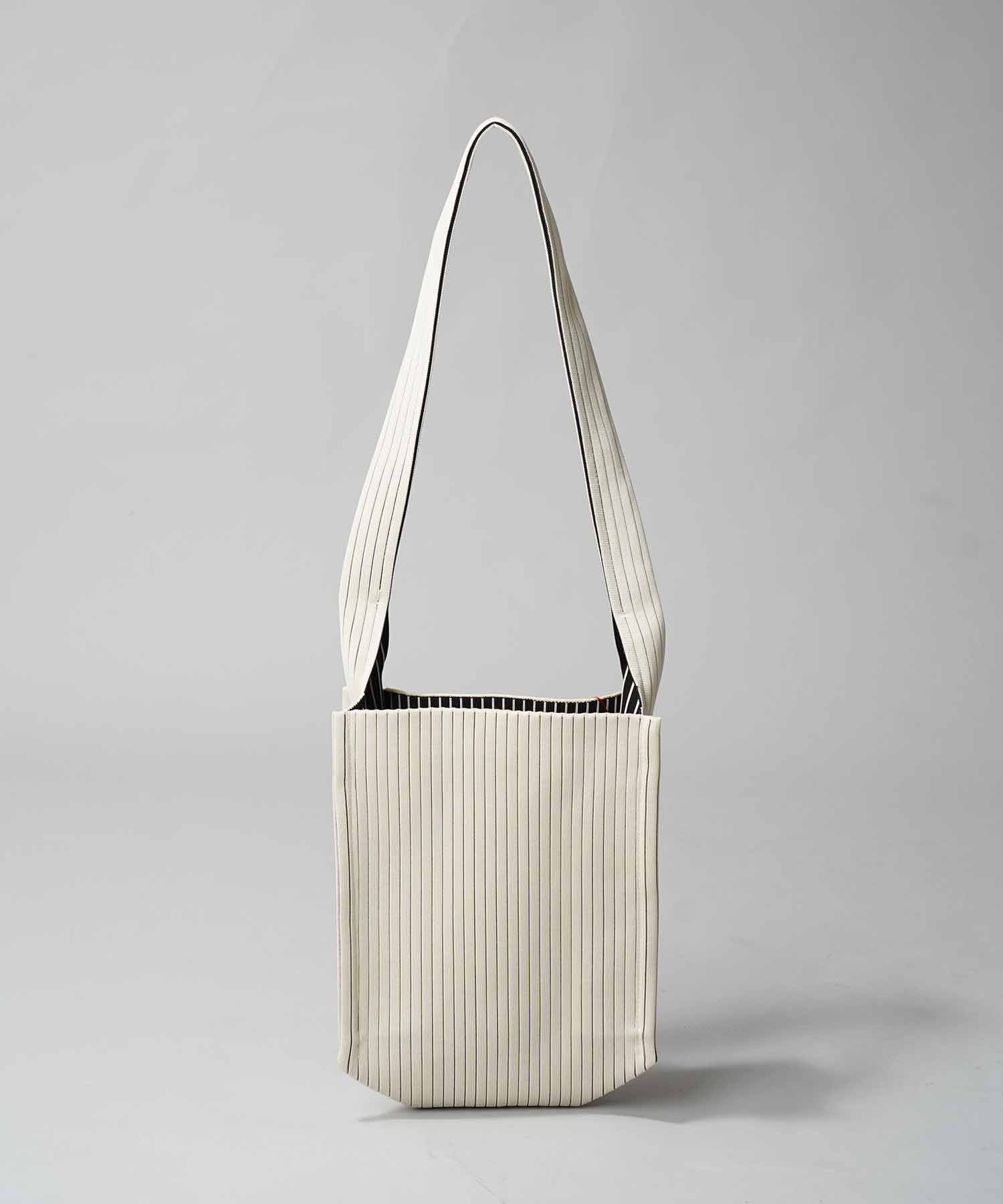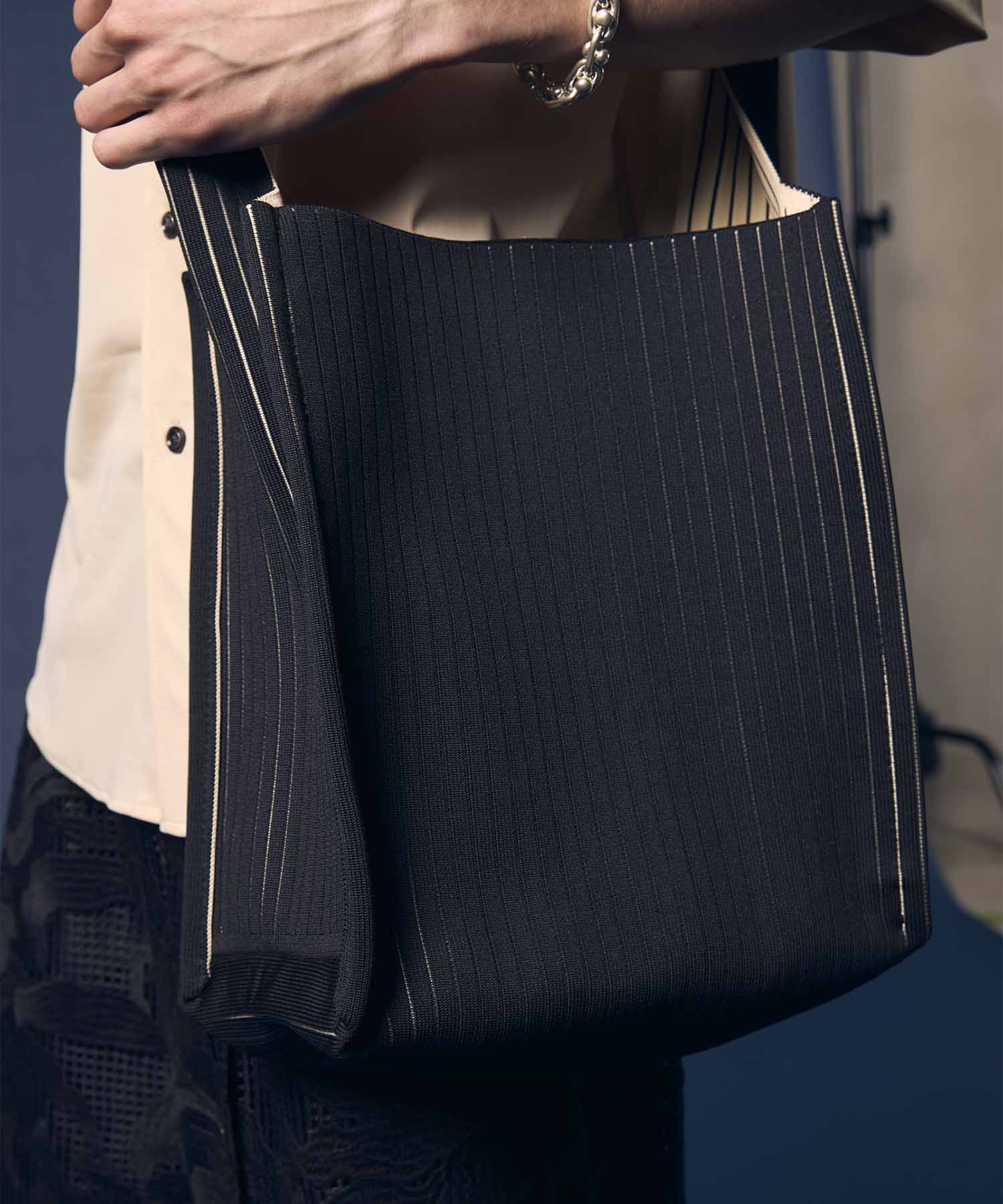 ソリッドなベースにピンストライプを効かせた、しっかりとした編み地のニットバッグ。