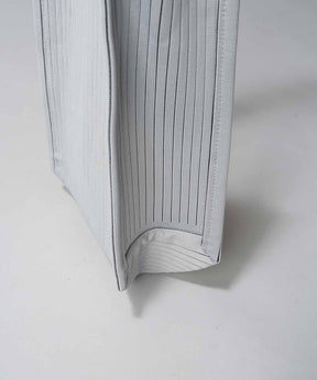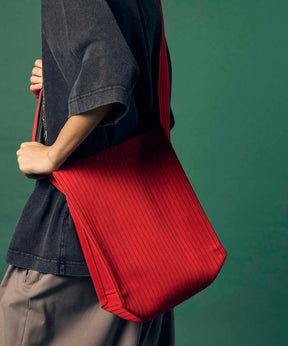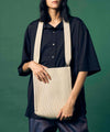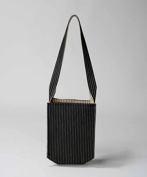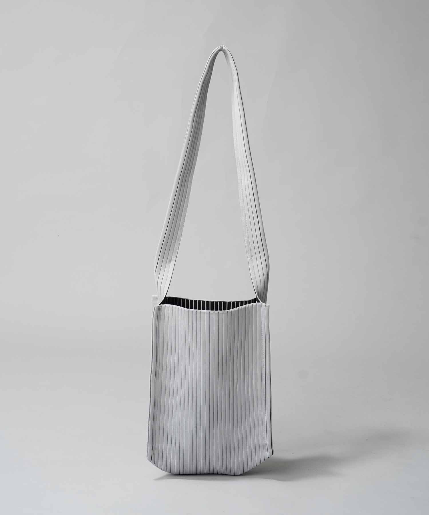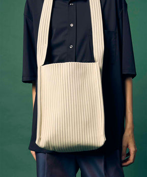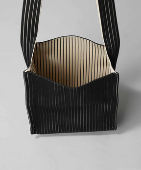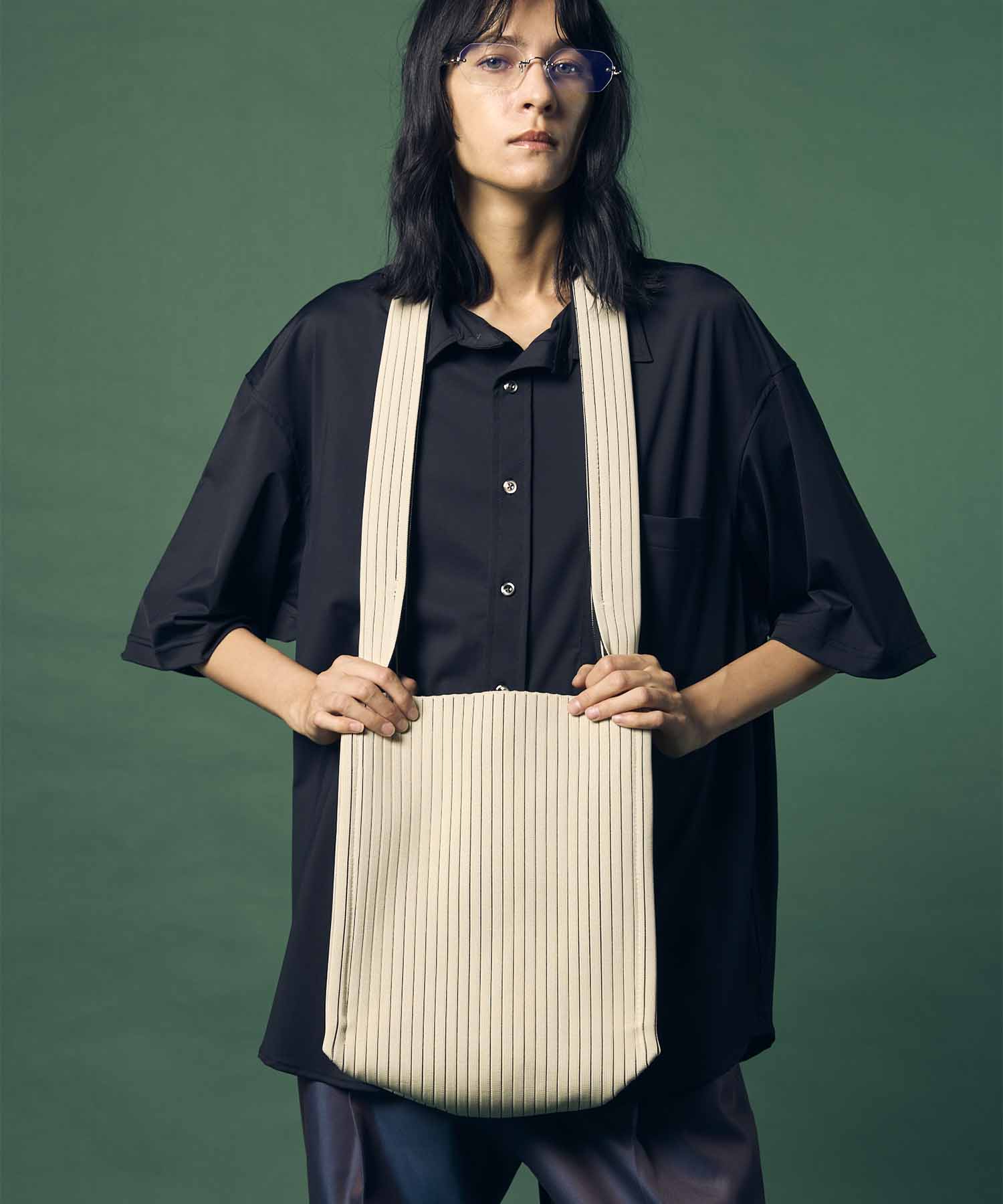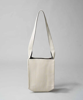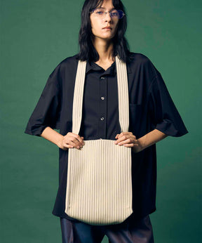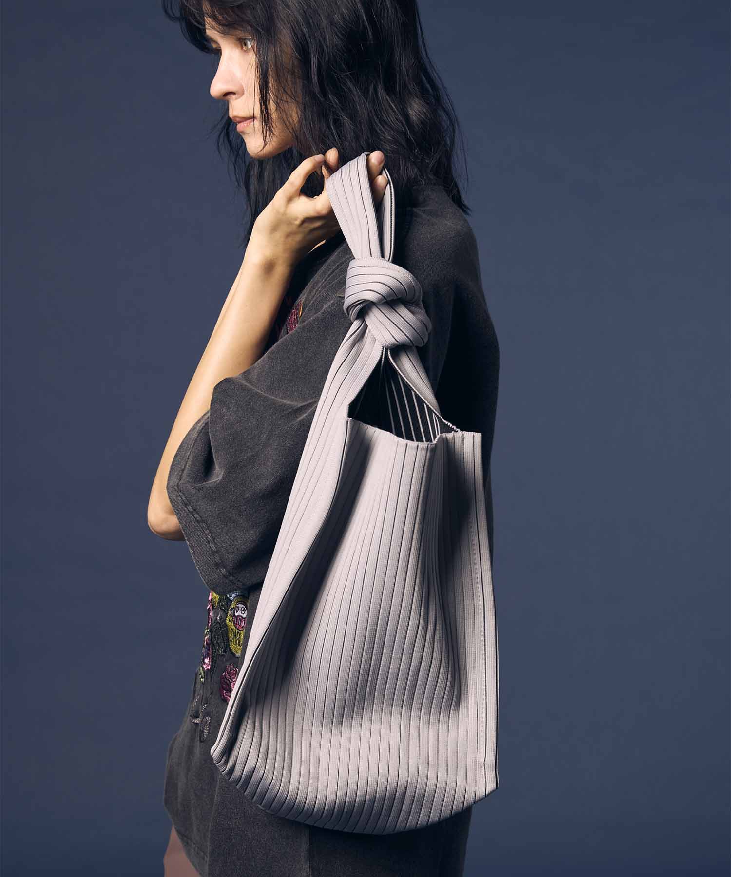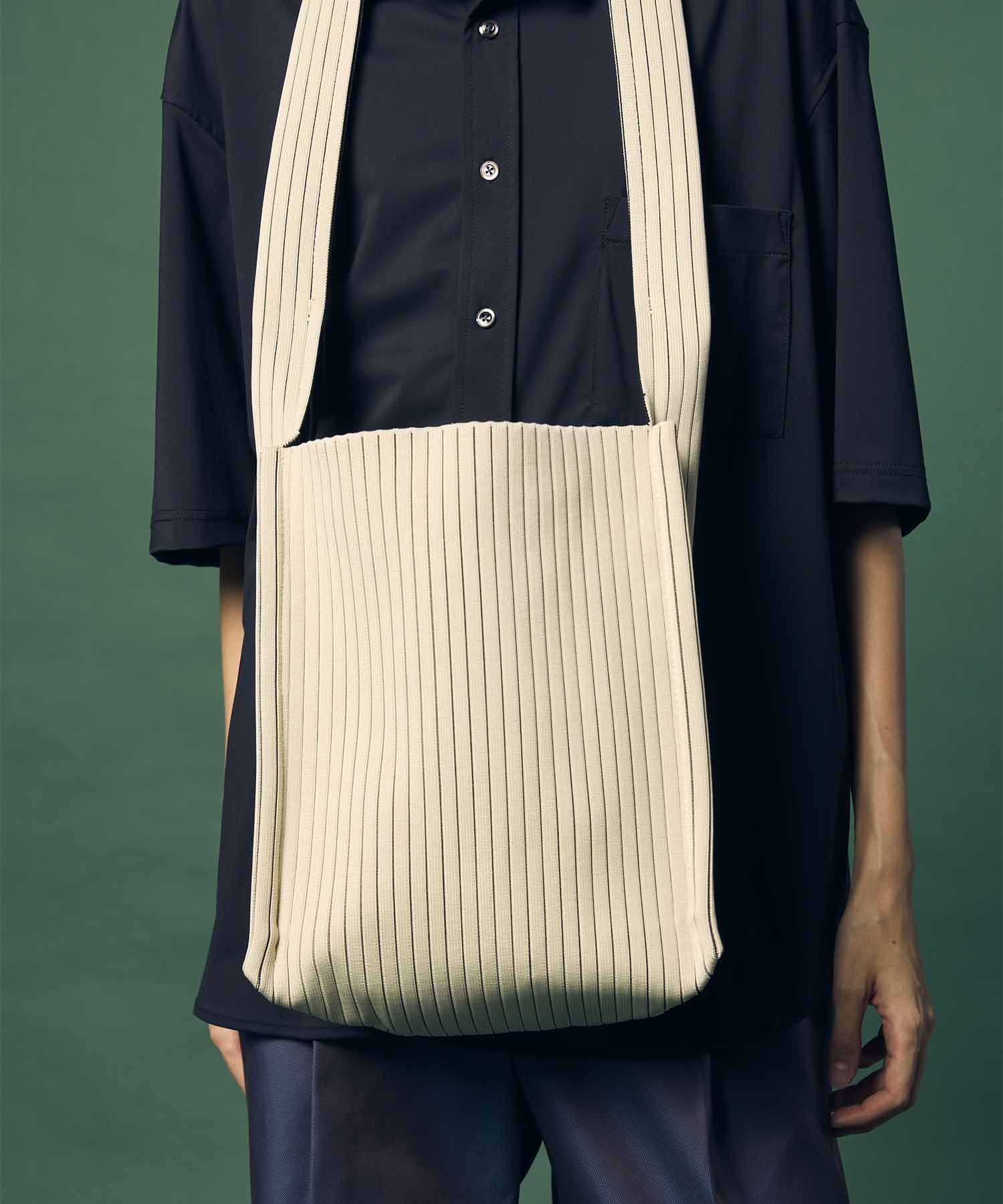 ソリッドなベースにピンストライプを効かせた、しっかりとした編み地のニットバッグ。