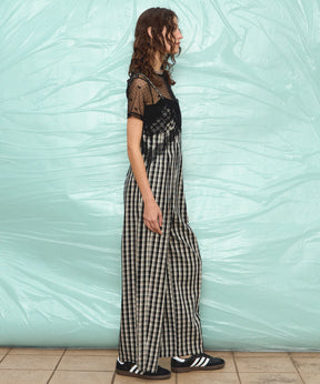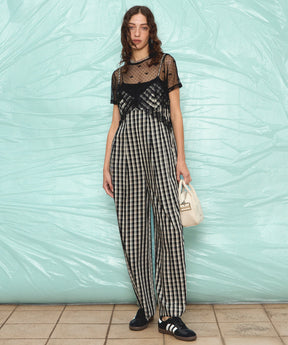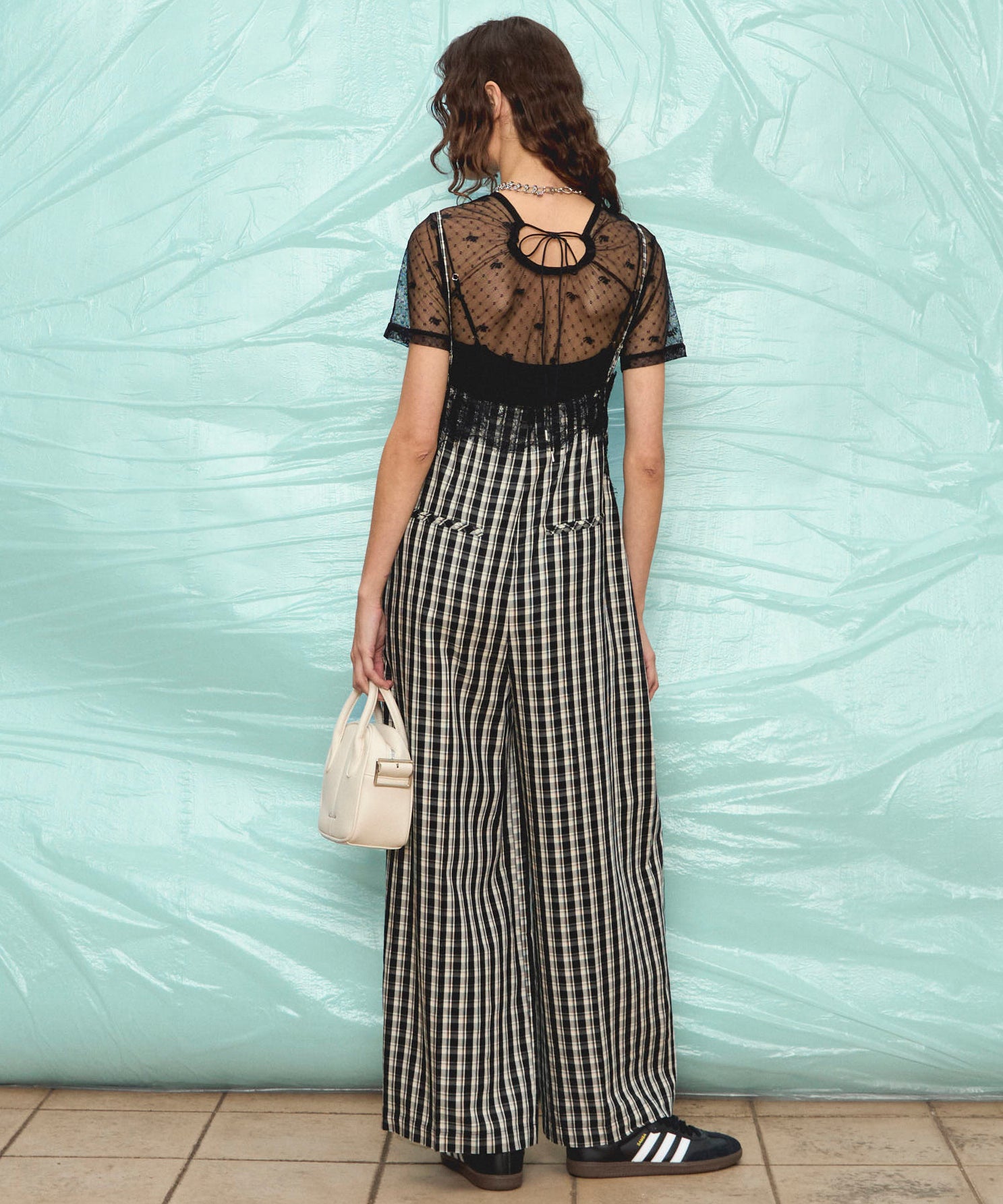 ・チェックにレースのトリムと、Vネックのラインで上品な印象に仕上げたオールインワン。