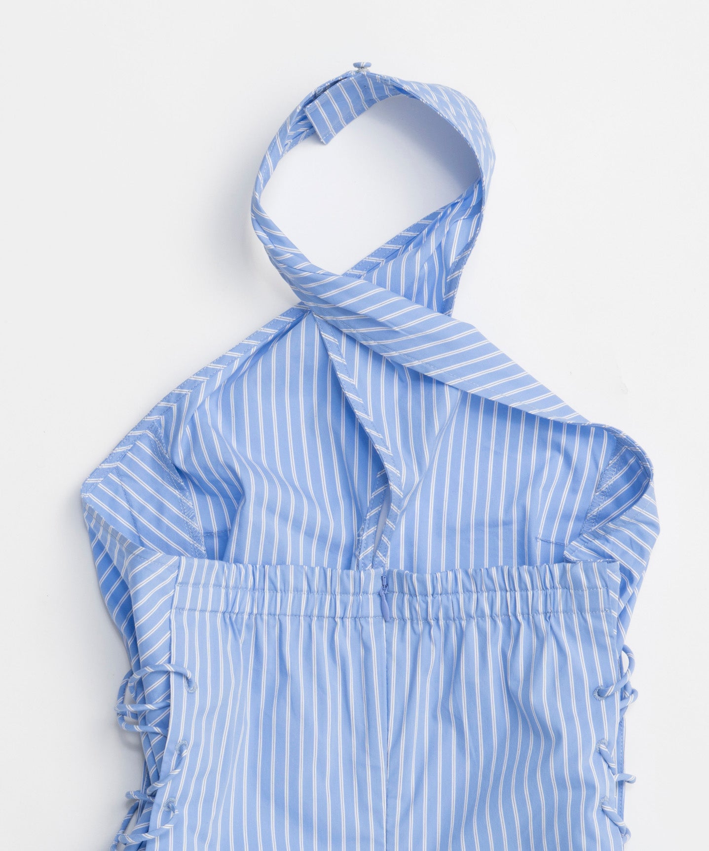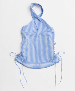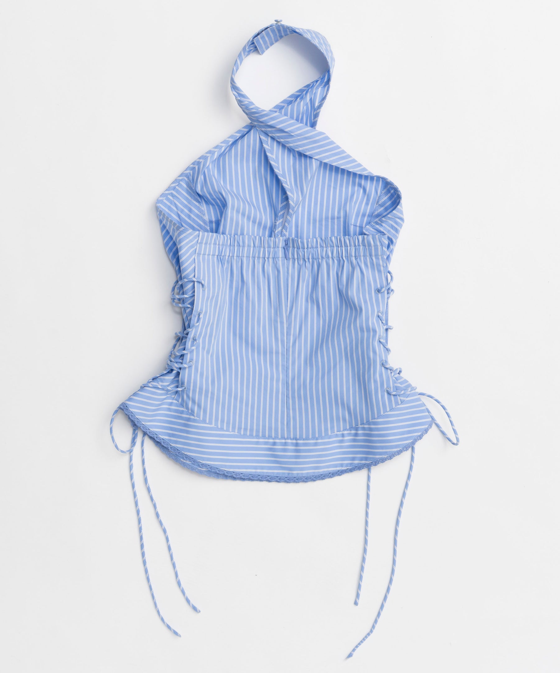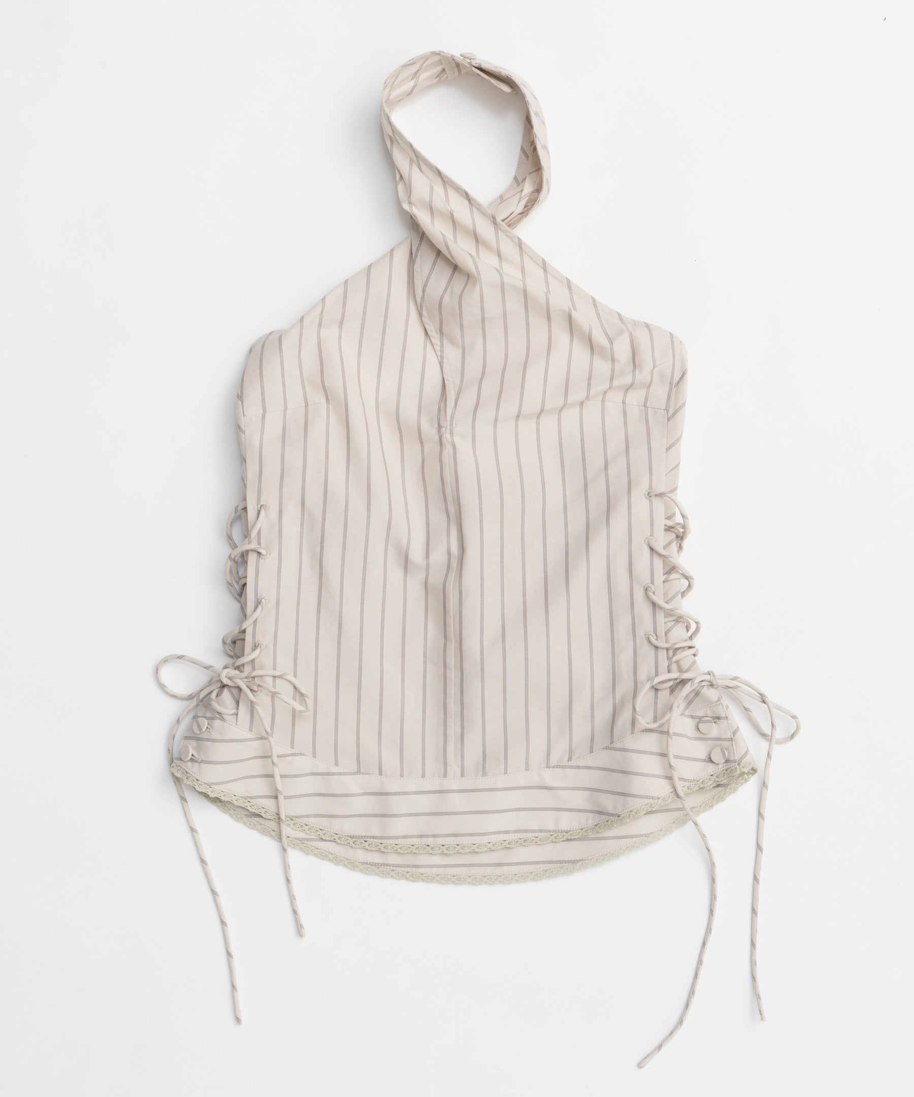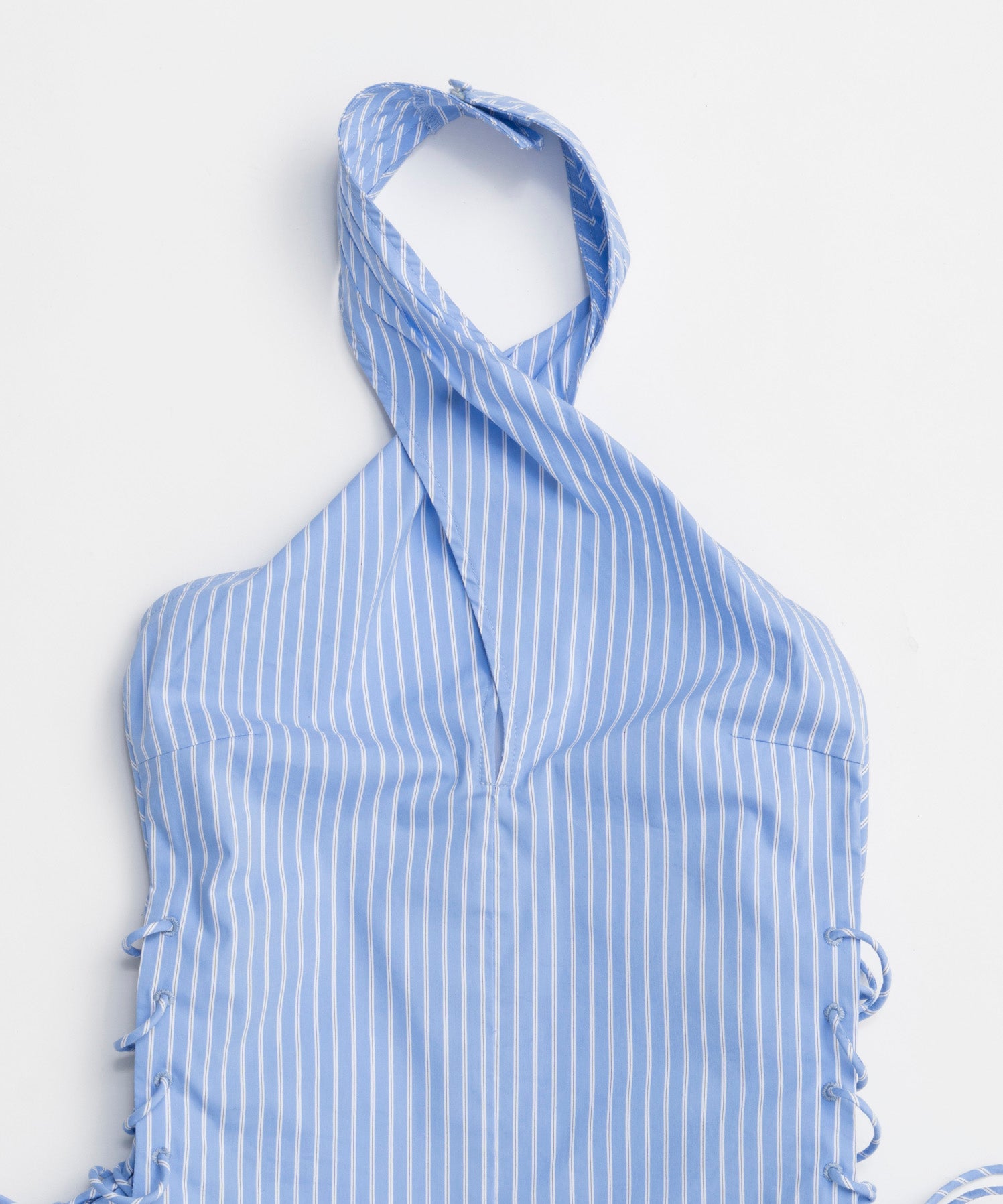 首元をシャープに演出するホルターネックに、サイドのレースアップデザインがアクセントをプラス。