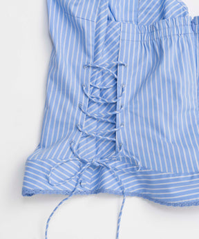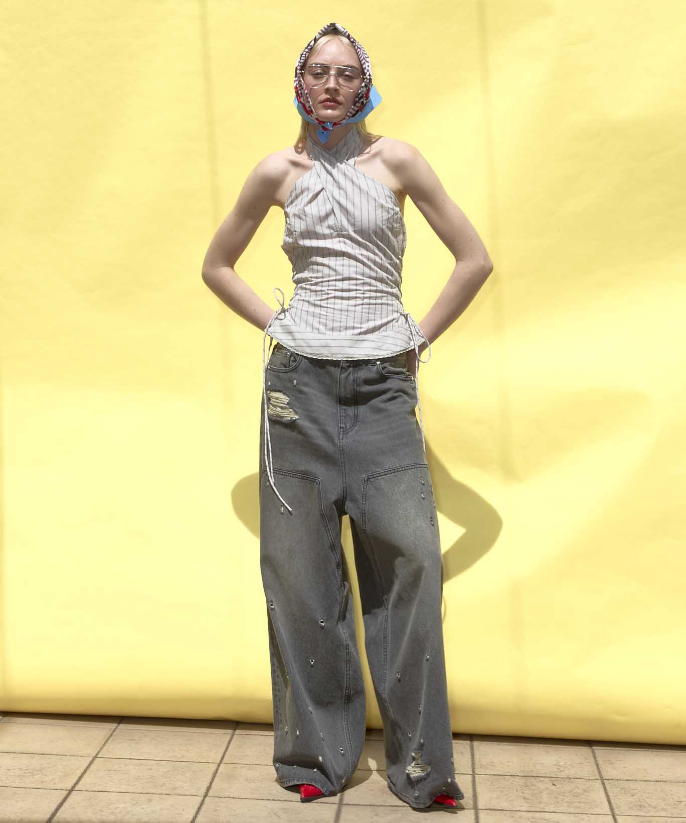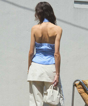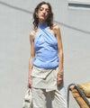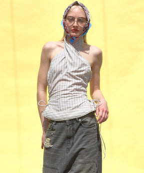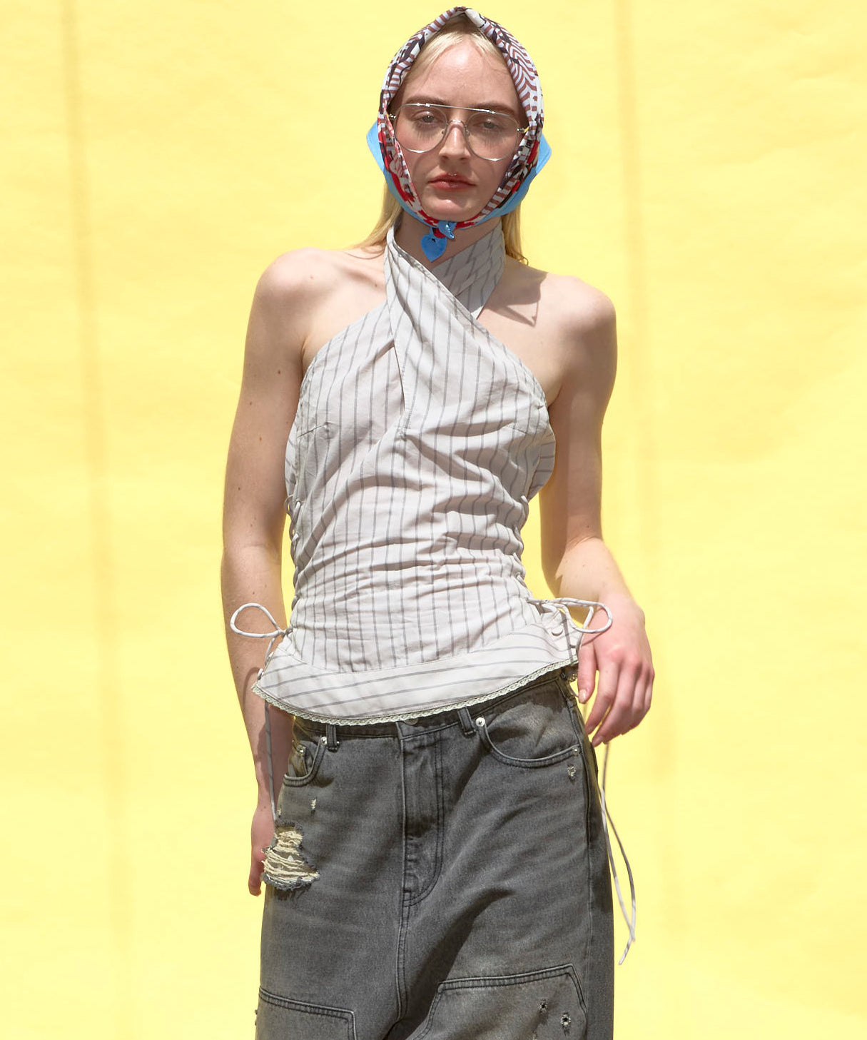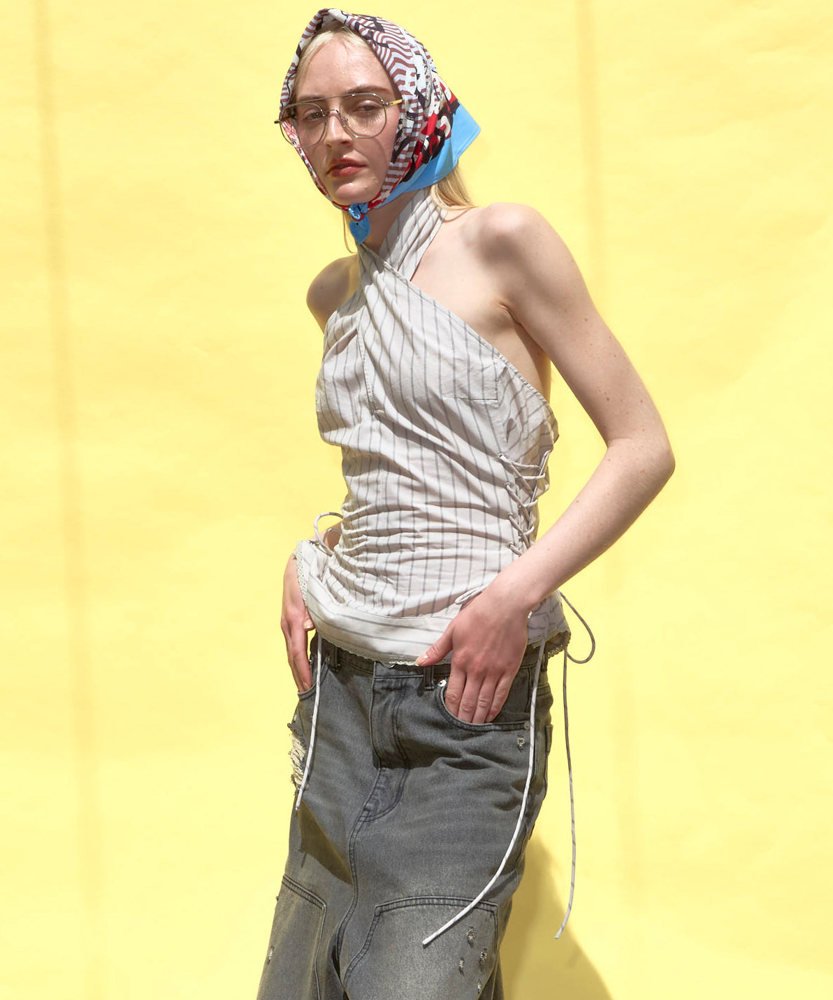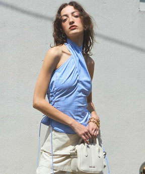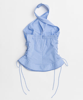 首元をシャープに演出するホルターネックに、サイドのレースアップデザインがアクセントをプラス。