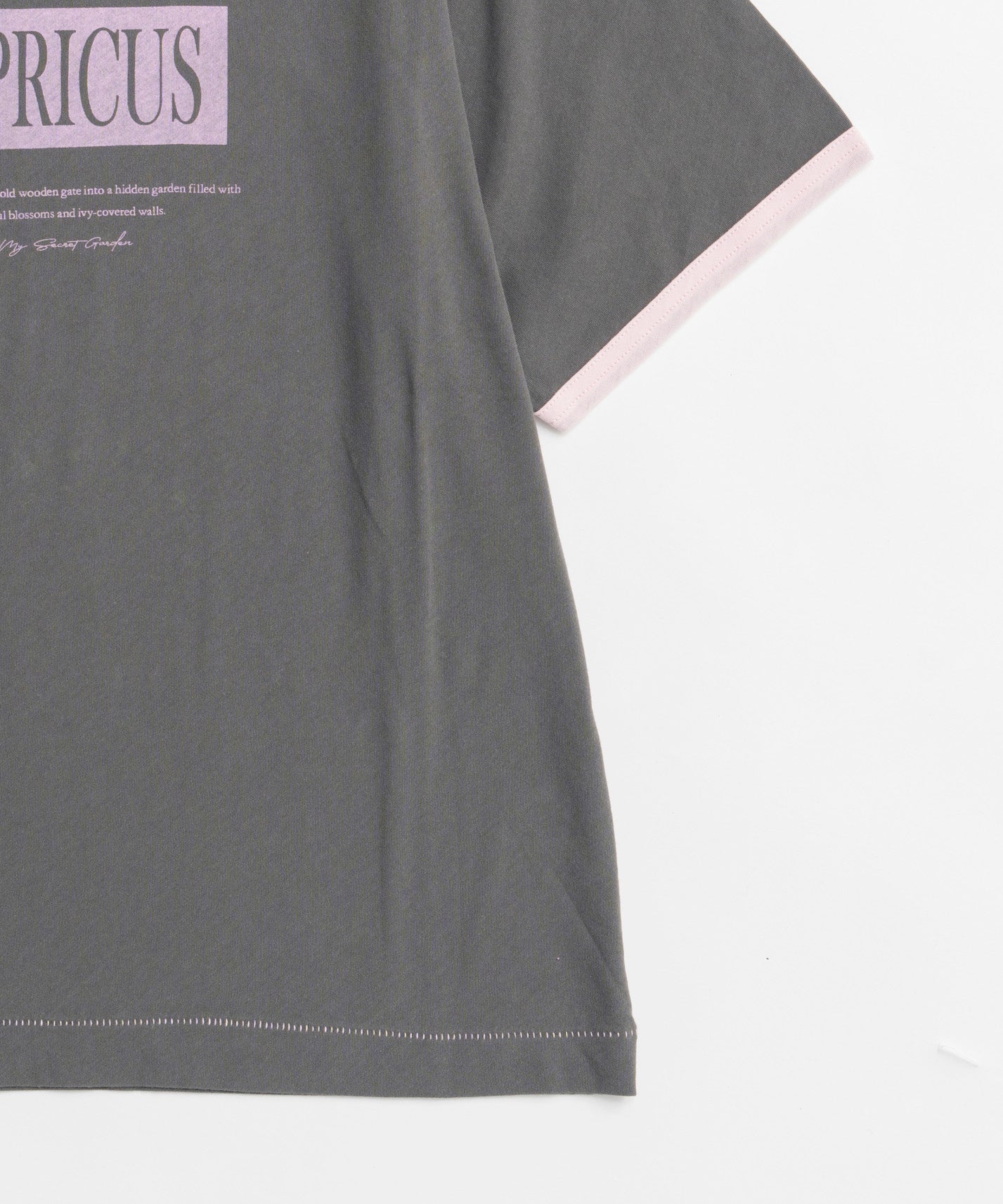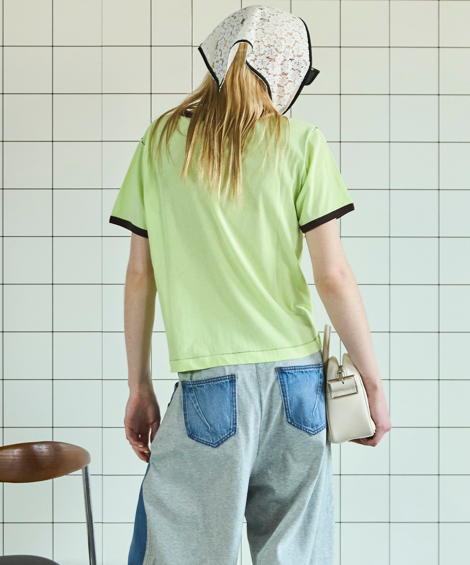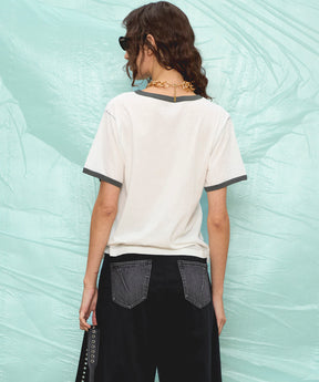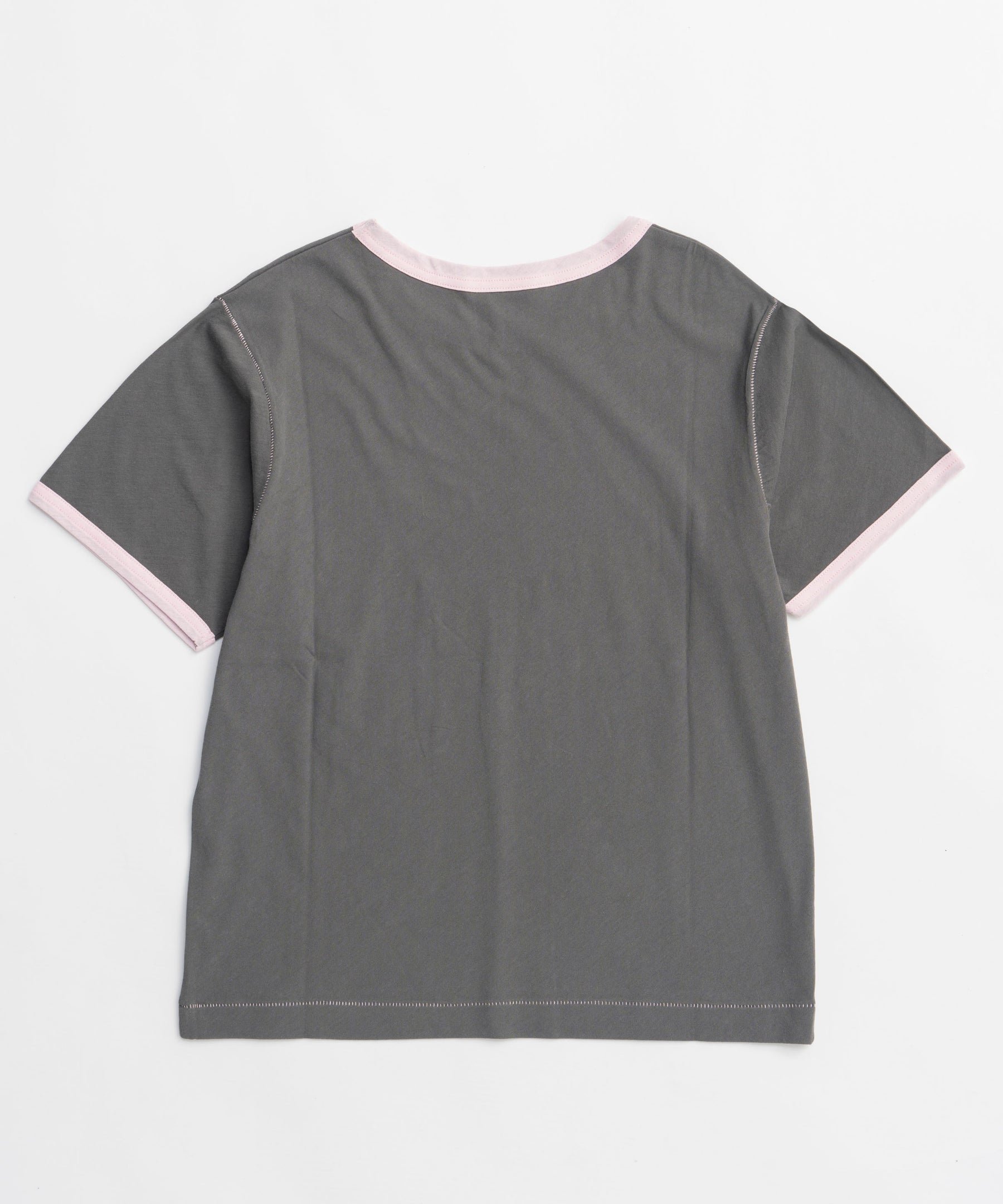 ・襟と袖口が配色にトリミングされたリンガーTEE。