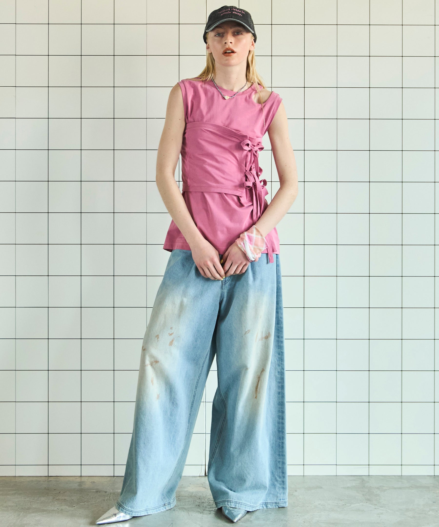 リボンを施したベアトップスはフェミニンながらも甘すぎず、程よくラフな仕上がりなので大人カジュアルにも着こなしていただけます。