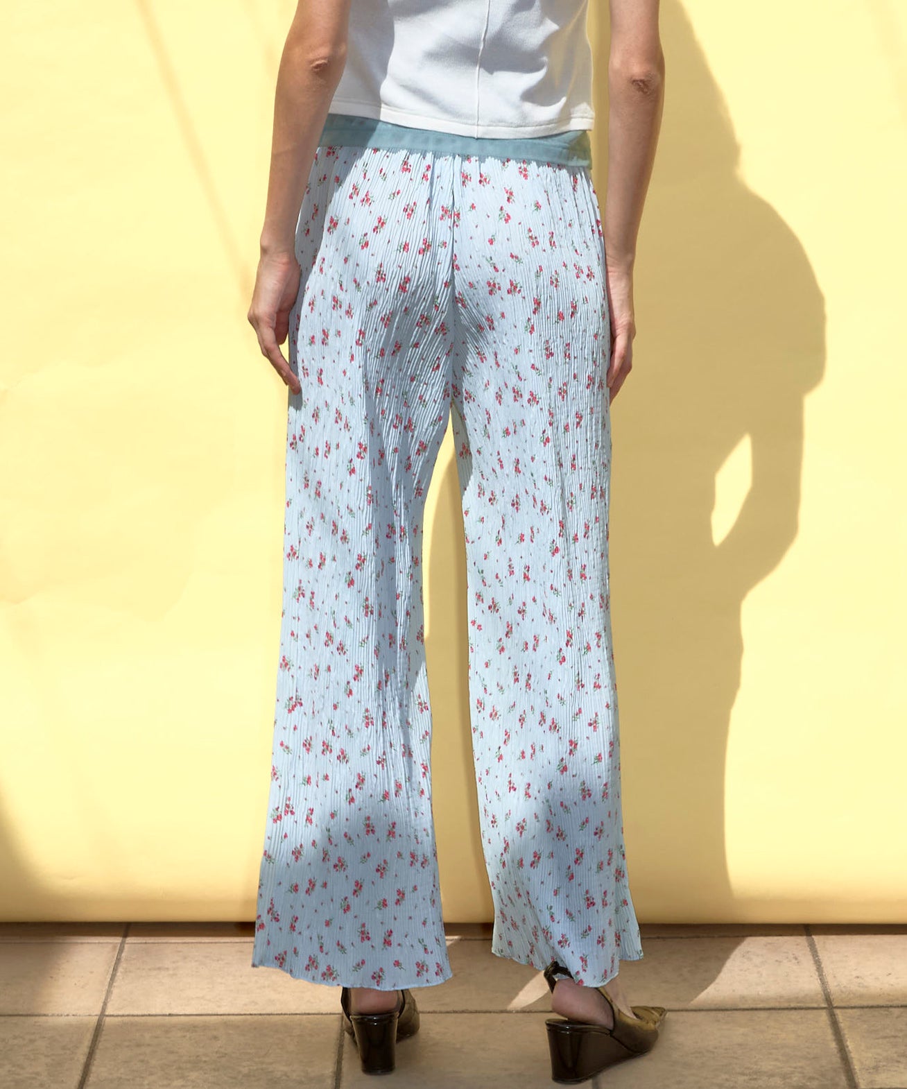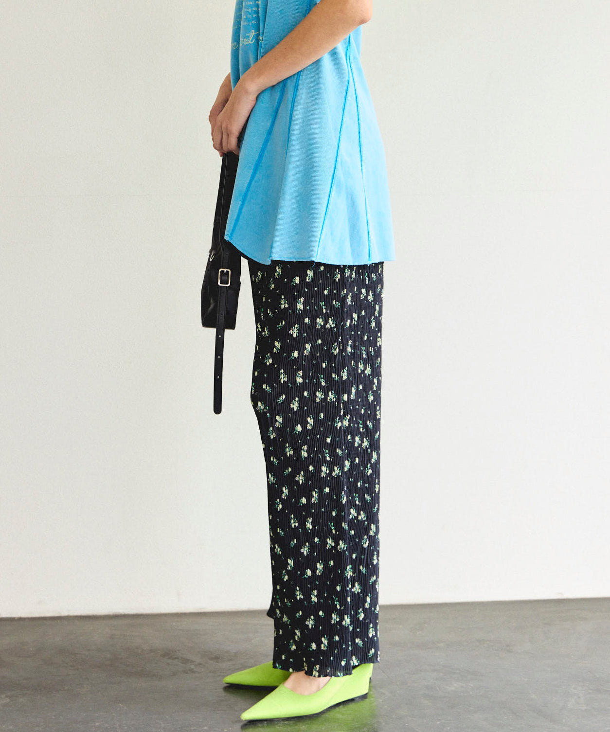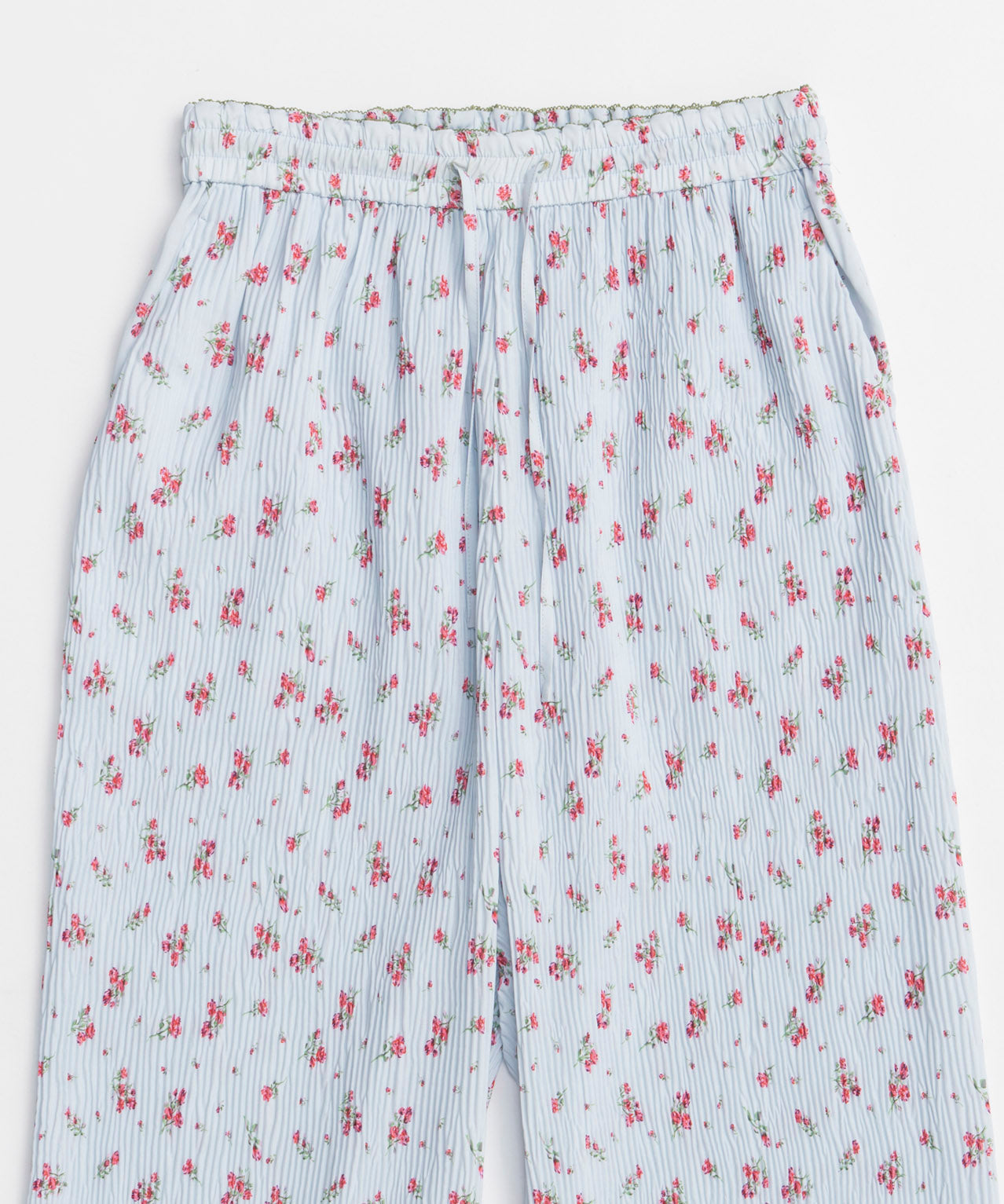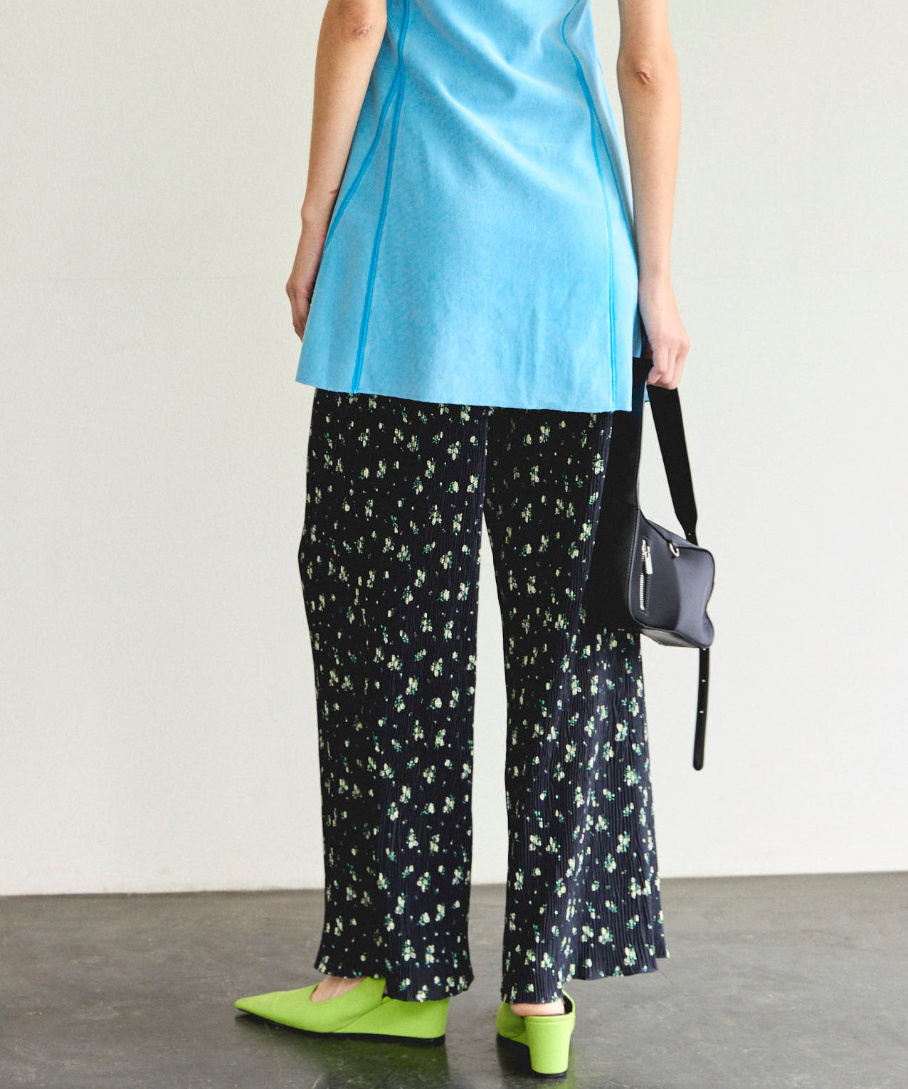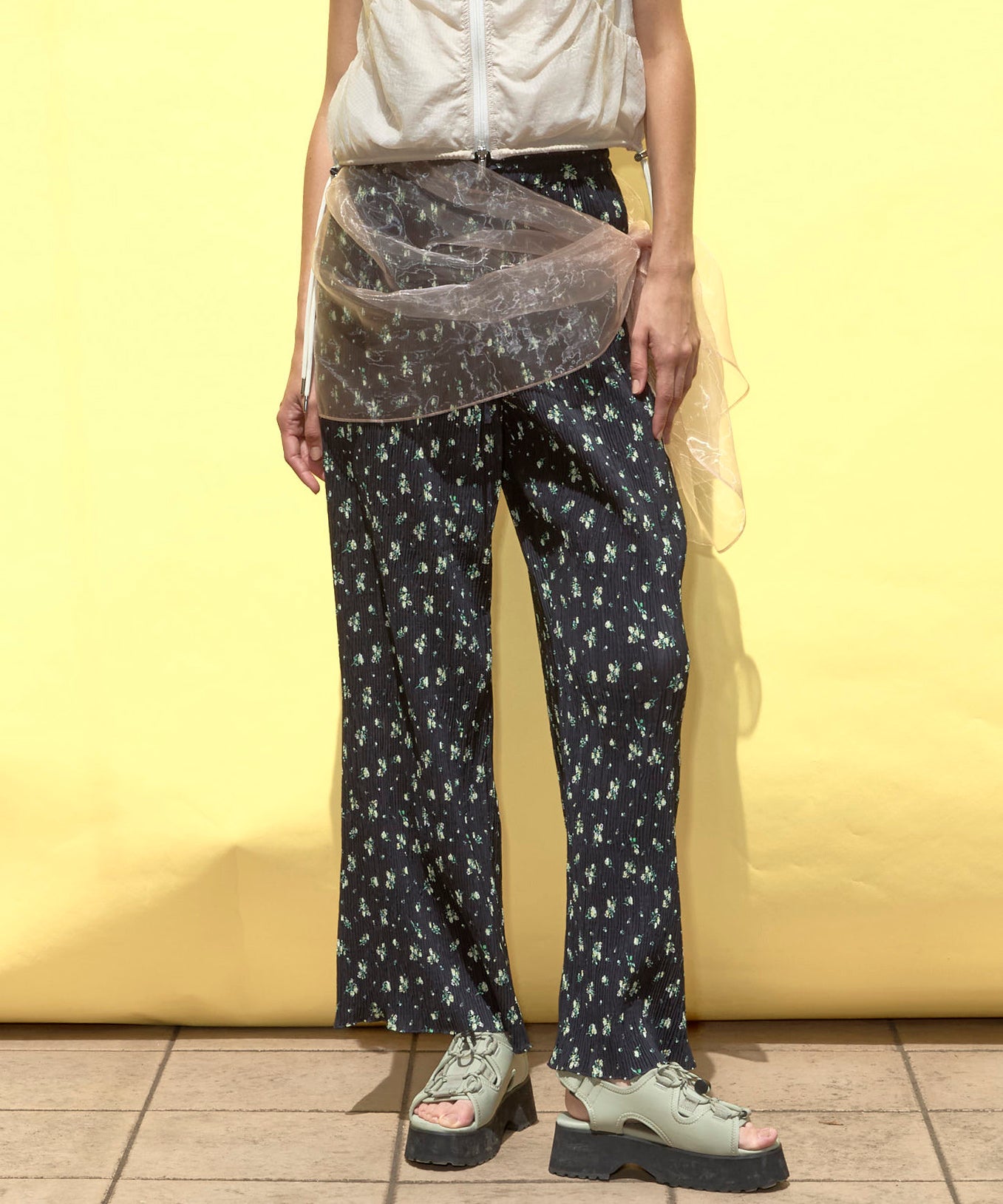 薄手のデシンにオリジナルの花柄プリントをし、クリスタルプリーツをかけています。