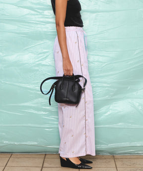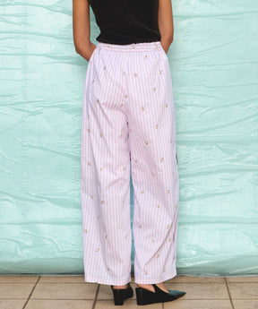 【ピンク/ブルー】ストライプのややハリ感のあるシャツ生地に、小花柄の刺繍が施された素材を使用。