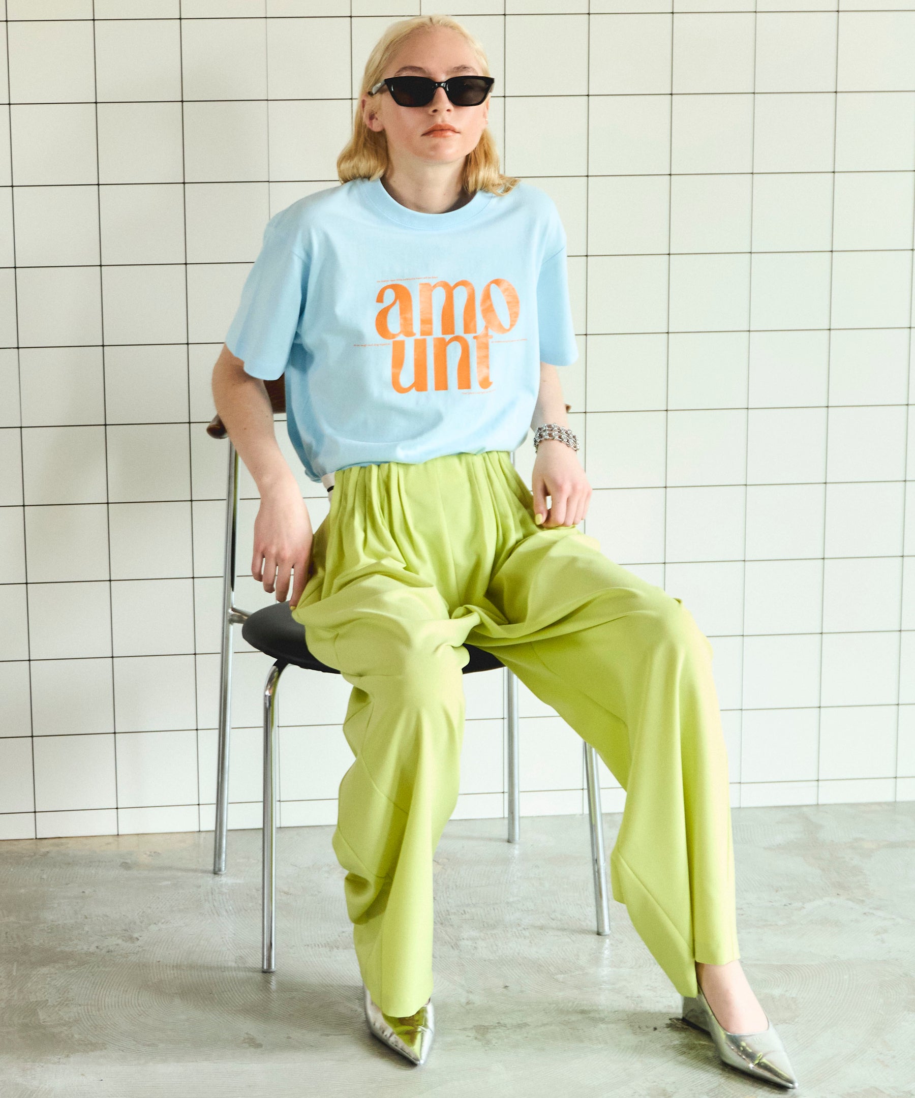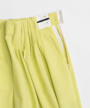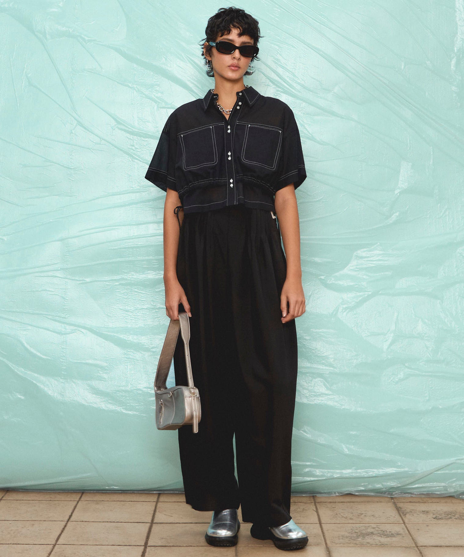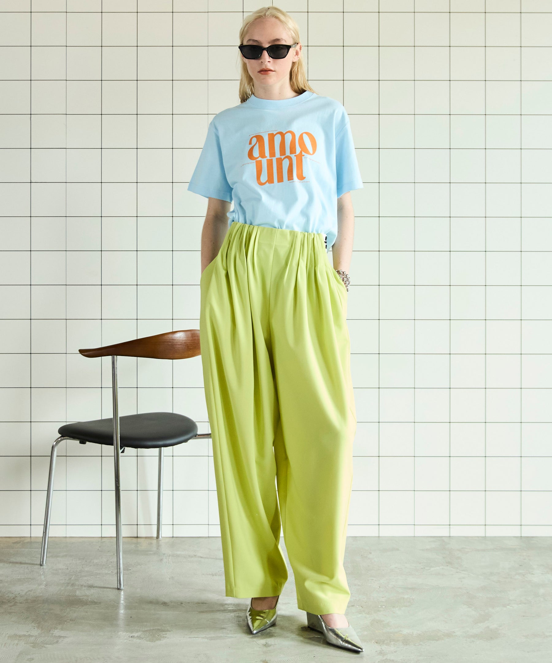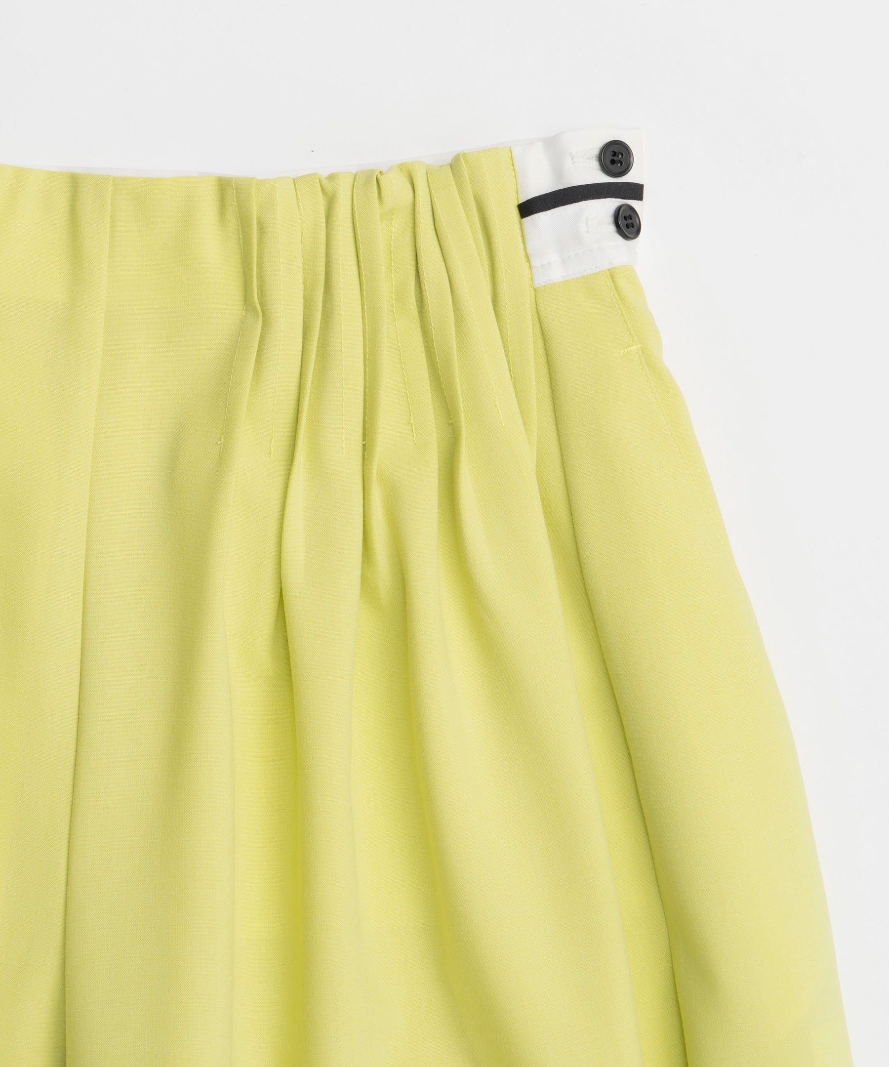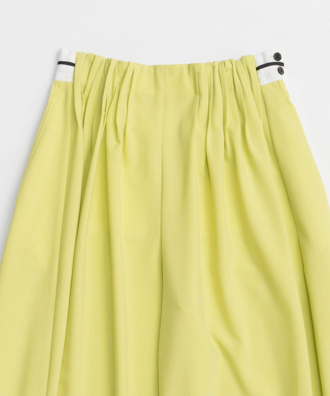 フロントのタックデザインが特徴的で、ウエストから裾にかけてふんわり広がるシルエットを演出。程よいボリューム感がこなれた雰囲気をプラス。