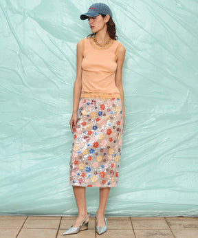 ・スパンコールであしらわれた花柄が華やかなマキシスカート。