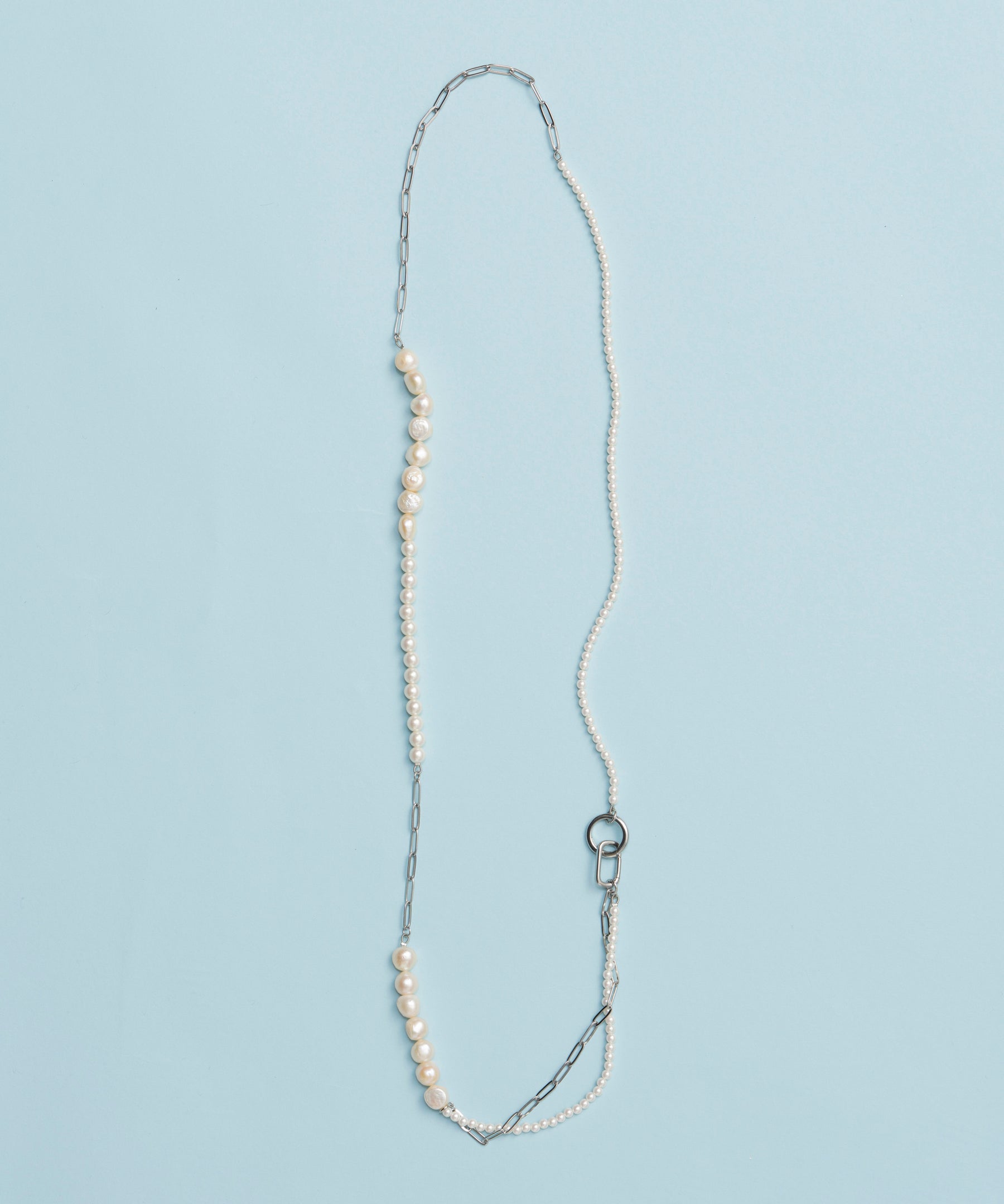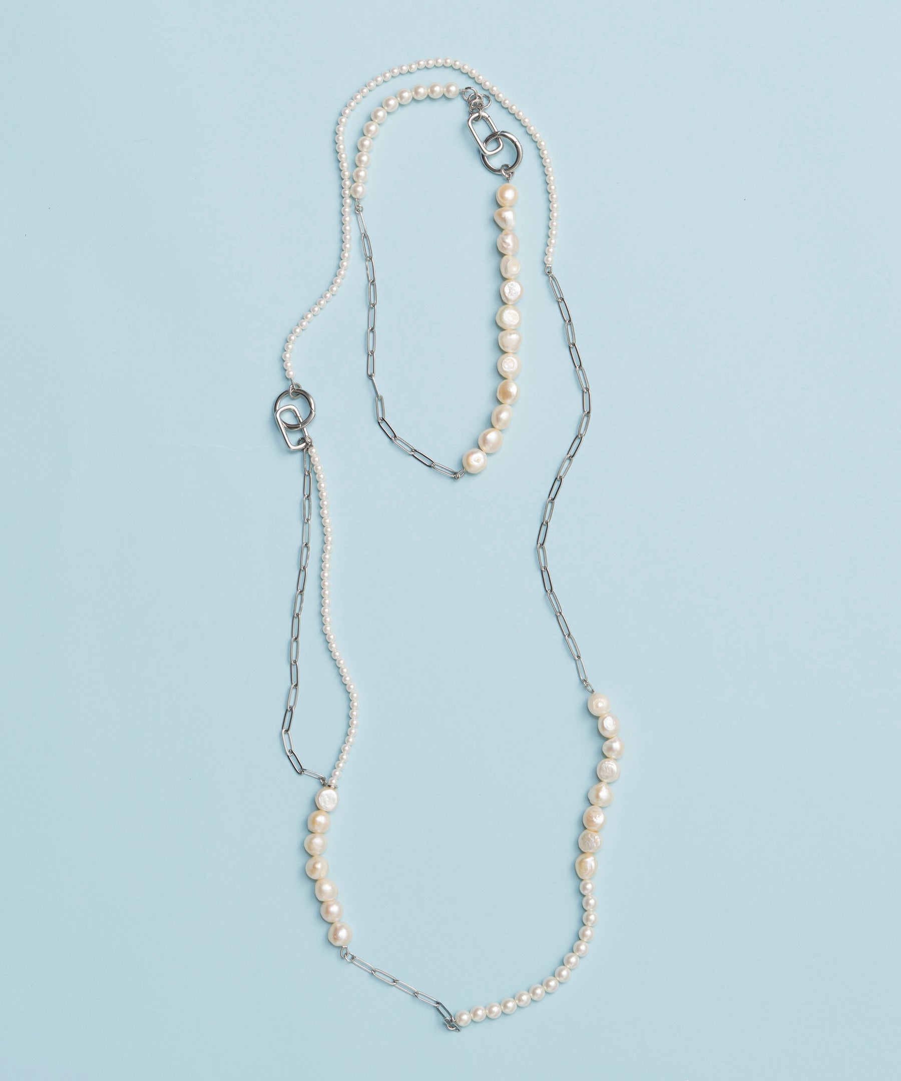 ネックレスとしても、ウエストベルトとしてもマルチに使える、ウェイ仕様のパールアクセサリー。 パールに
