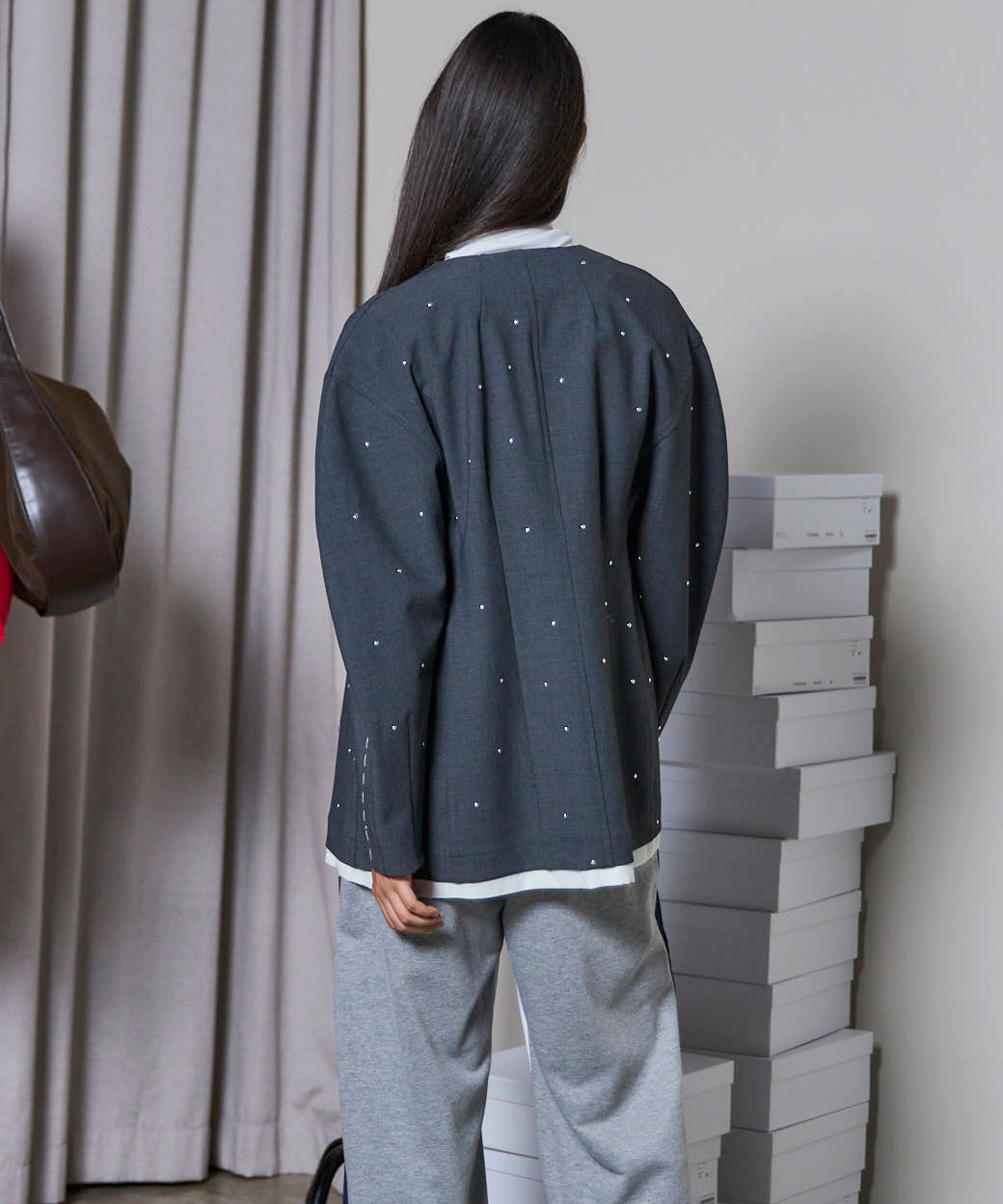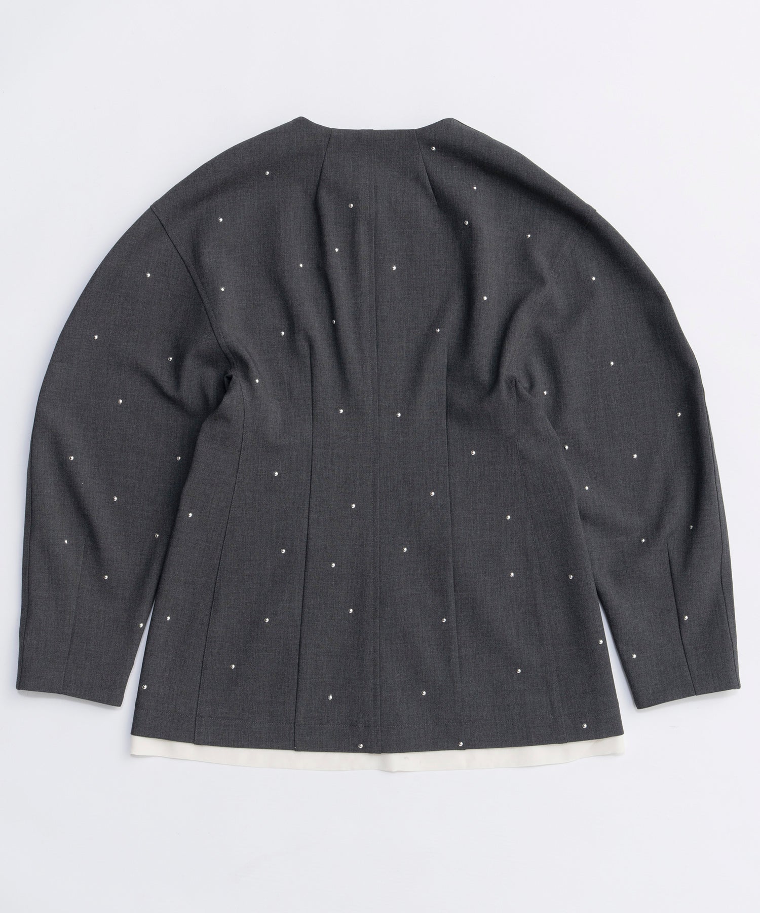 ・ノーカラーなのでシャツ襟を出したり、ラッフルブラウスなど襟周りで遊ぶスタイリングもおススメです。