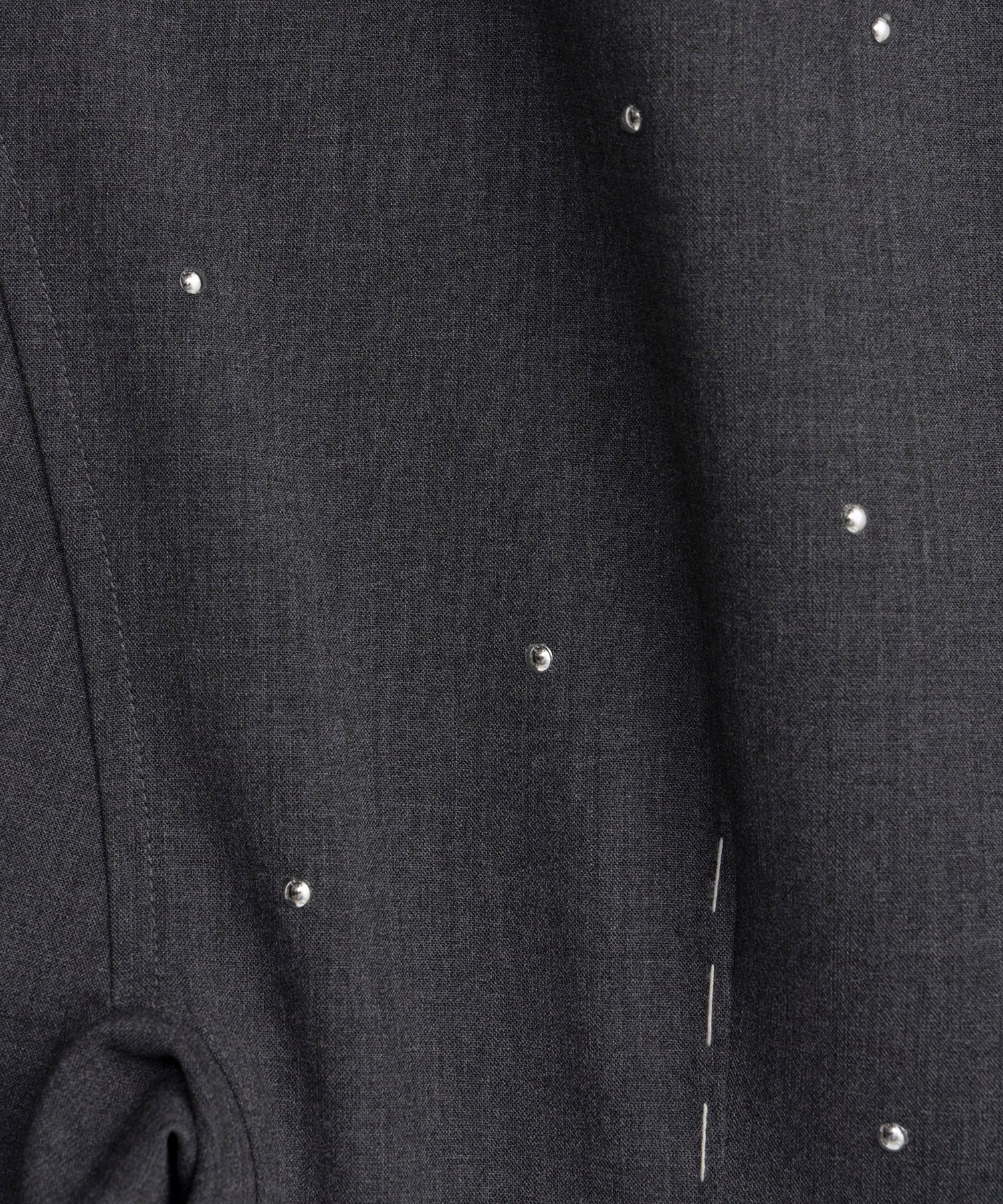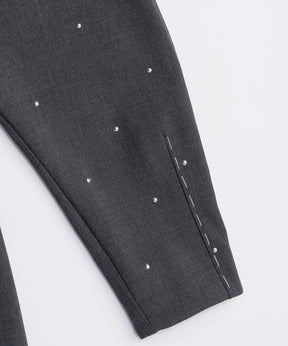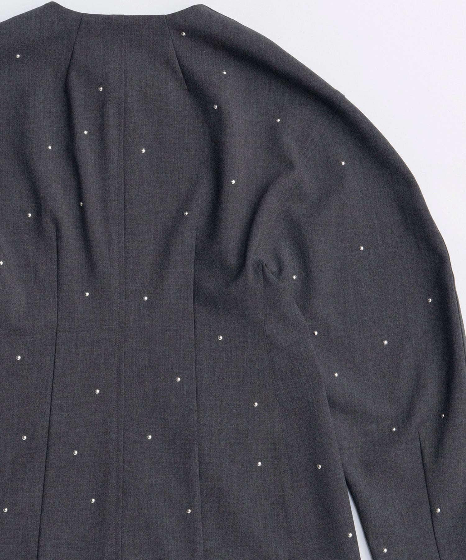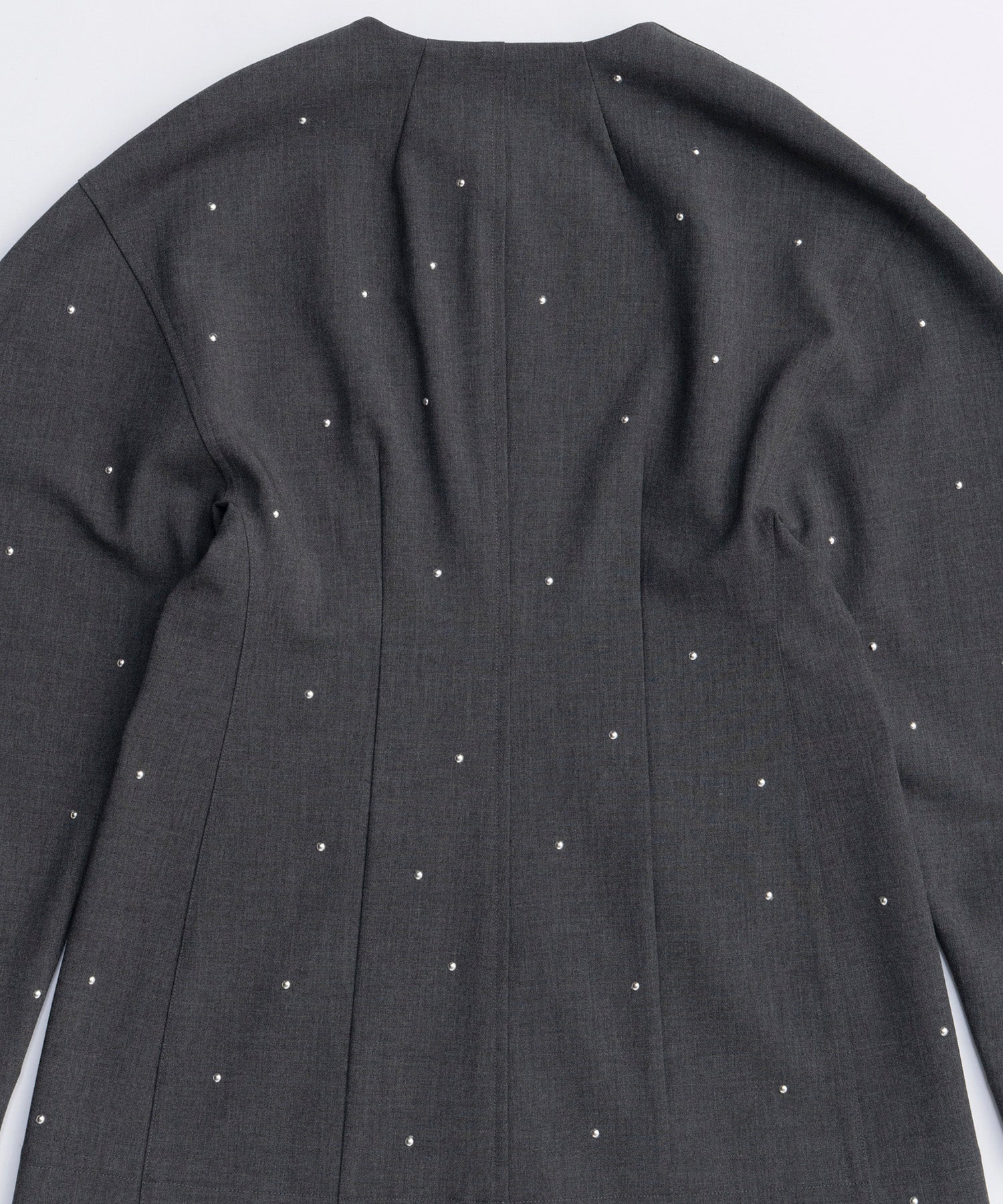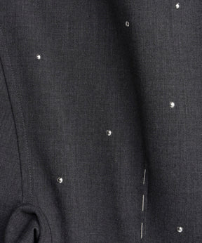 上品な印象のジャケットにスタッズを打ちこむことで、辛口に仕上げています。