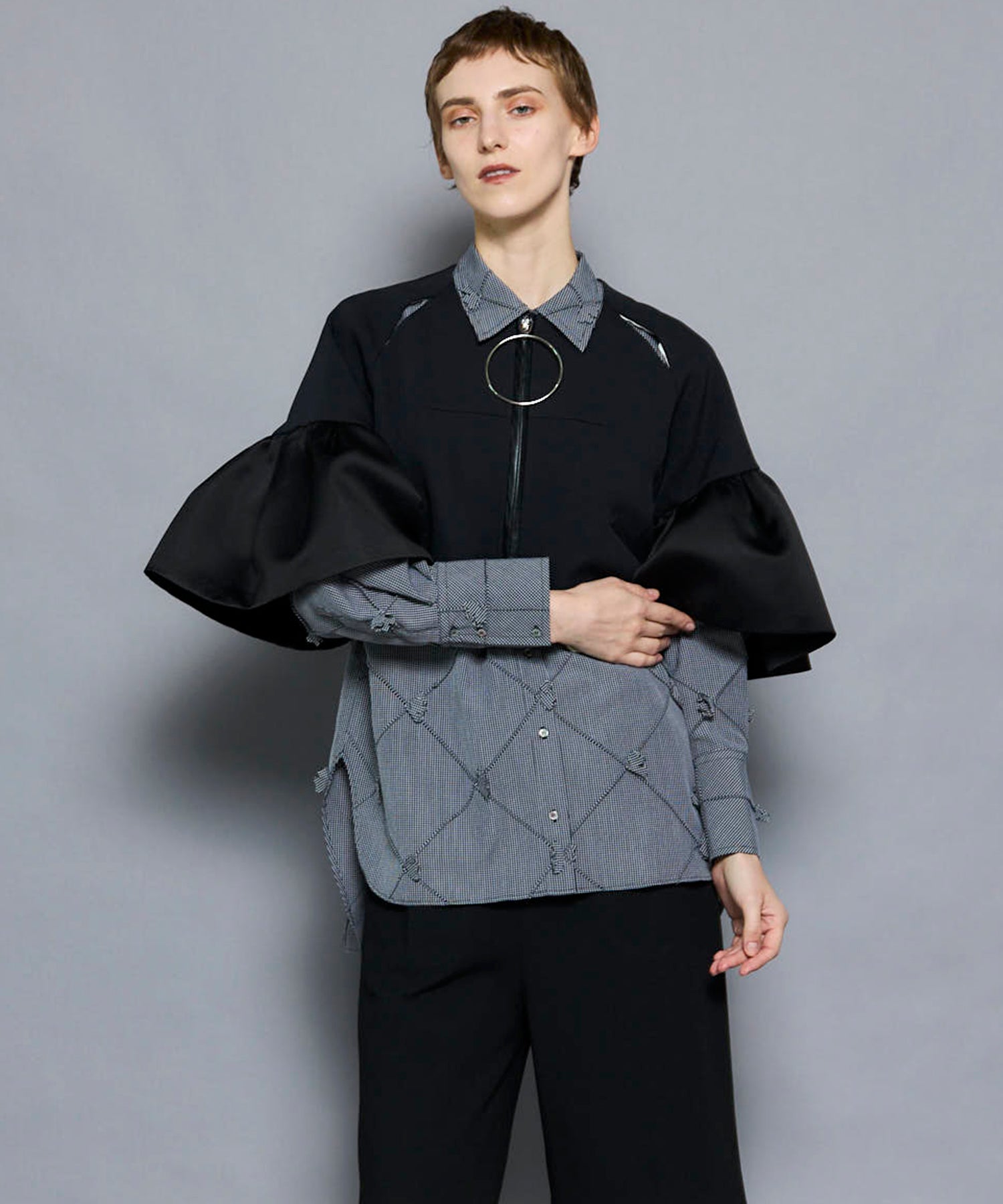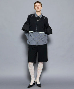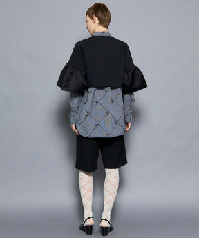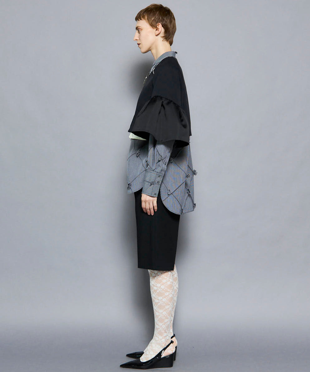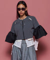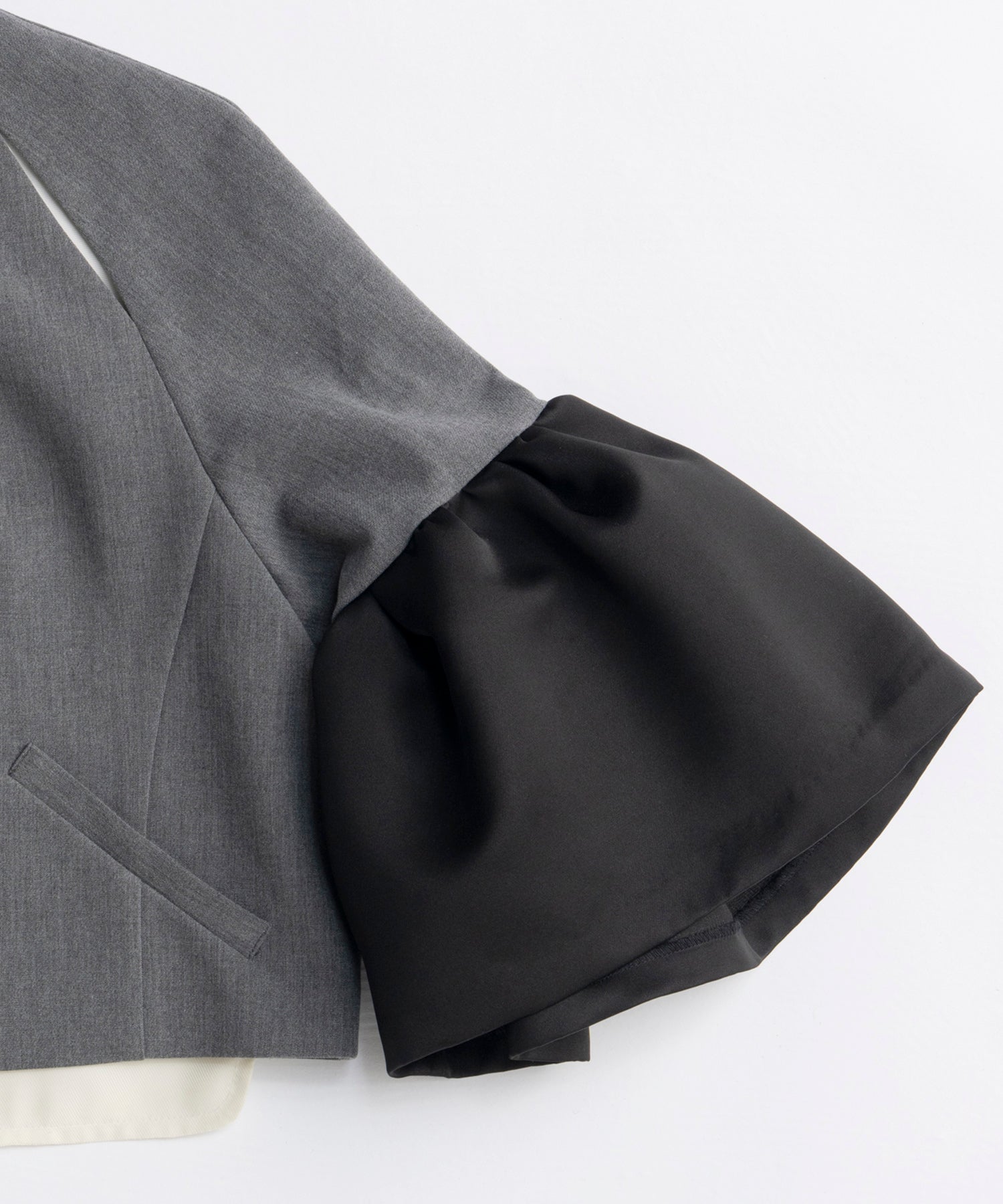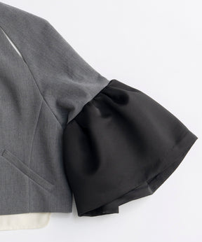 袖には光沢のあるサテンをコンビネーションし、ニュアンスのある雰囲気に。