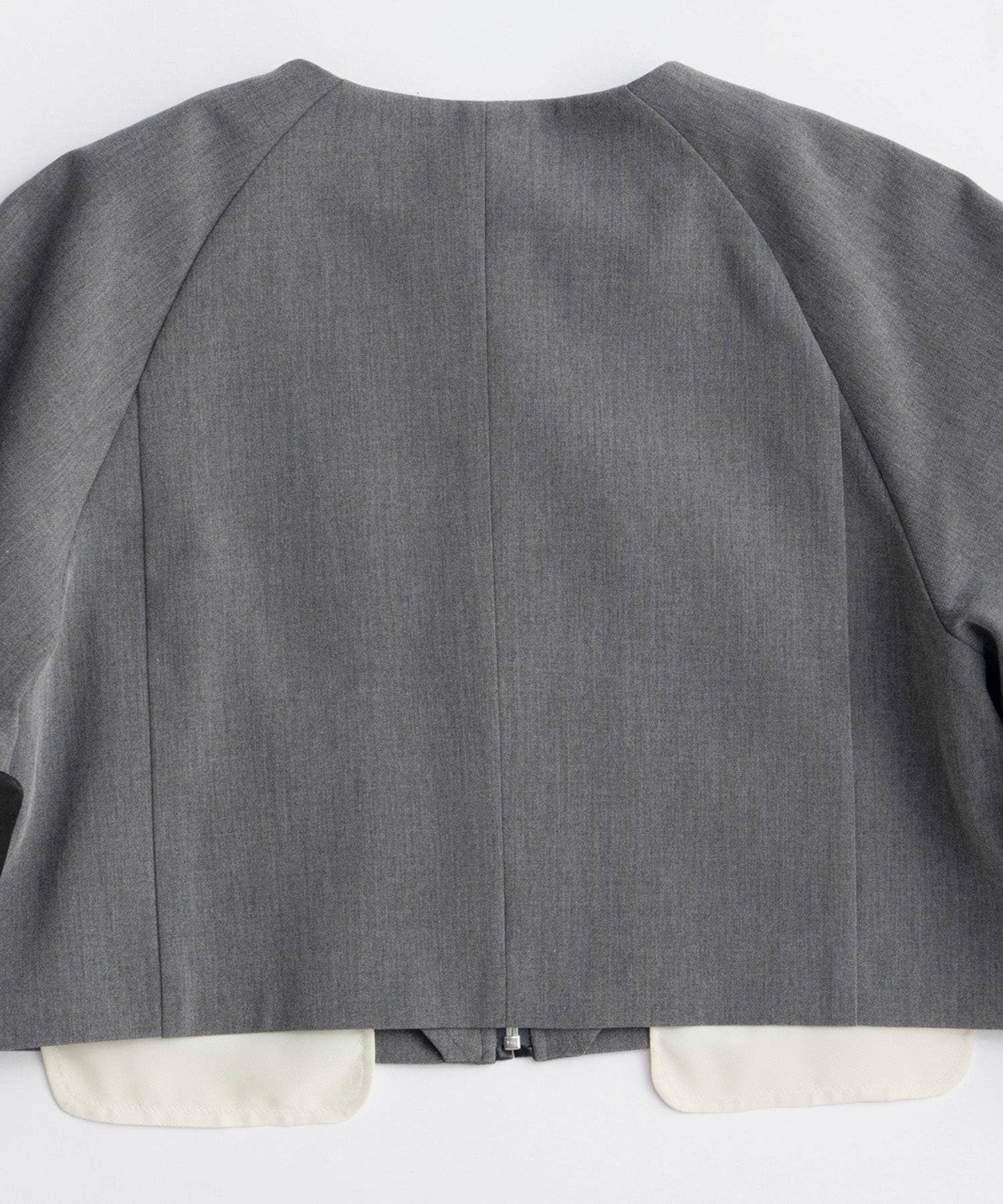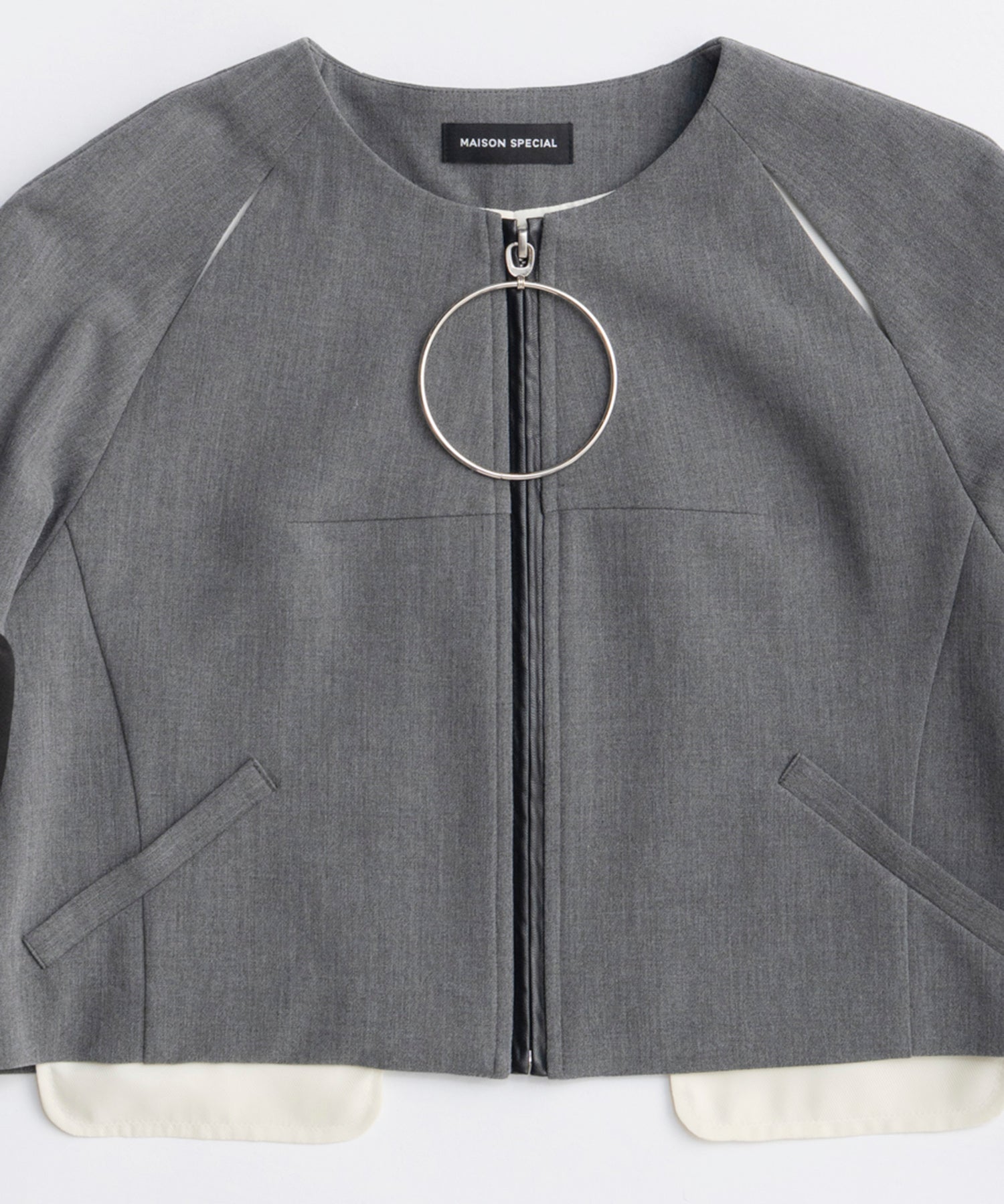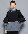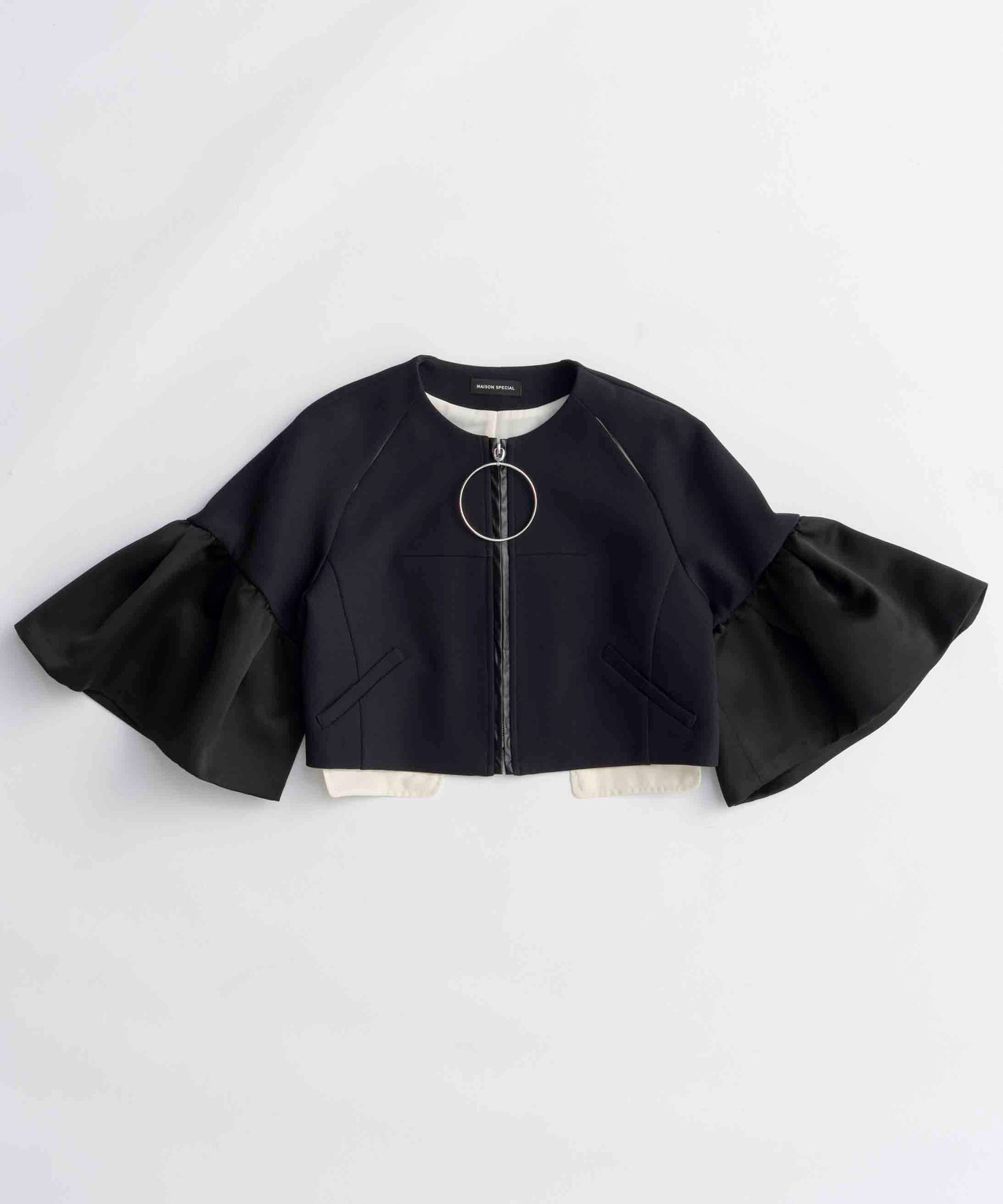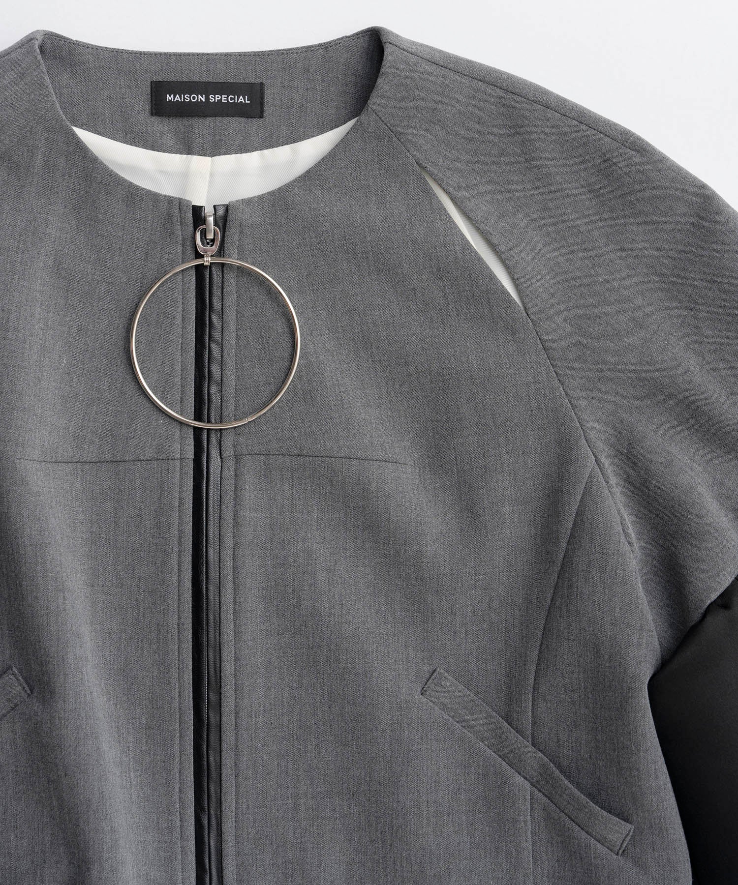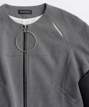 ・コンシャスな袖とビックリングのジップが特徴のノーカラージャケット。