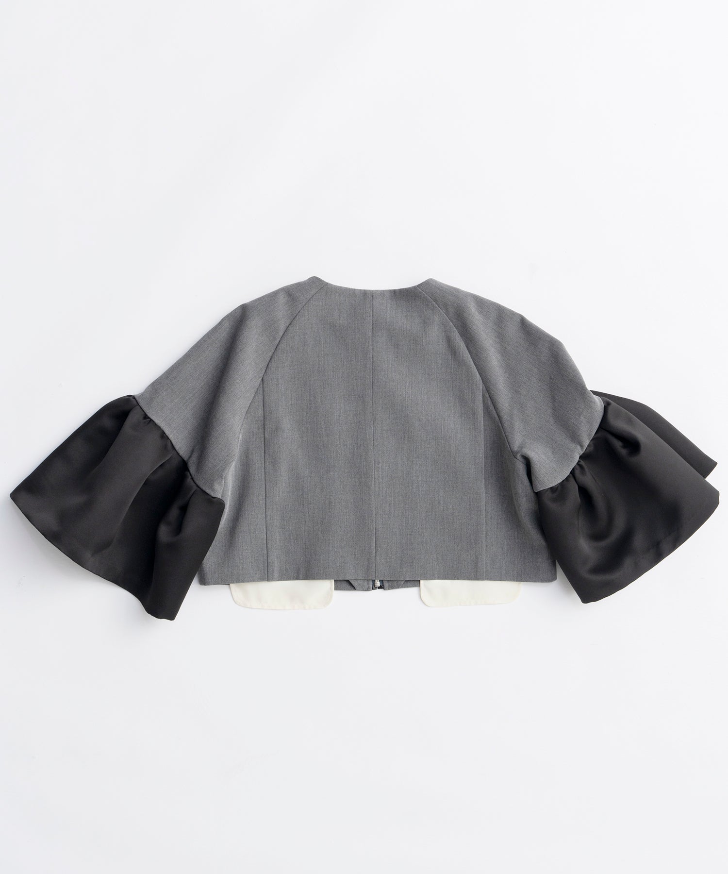 身頃には梳毛調のダブルクロスを使用し、袖には光沢のあるサテンを使用しコントラストを演出。