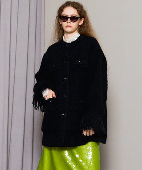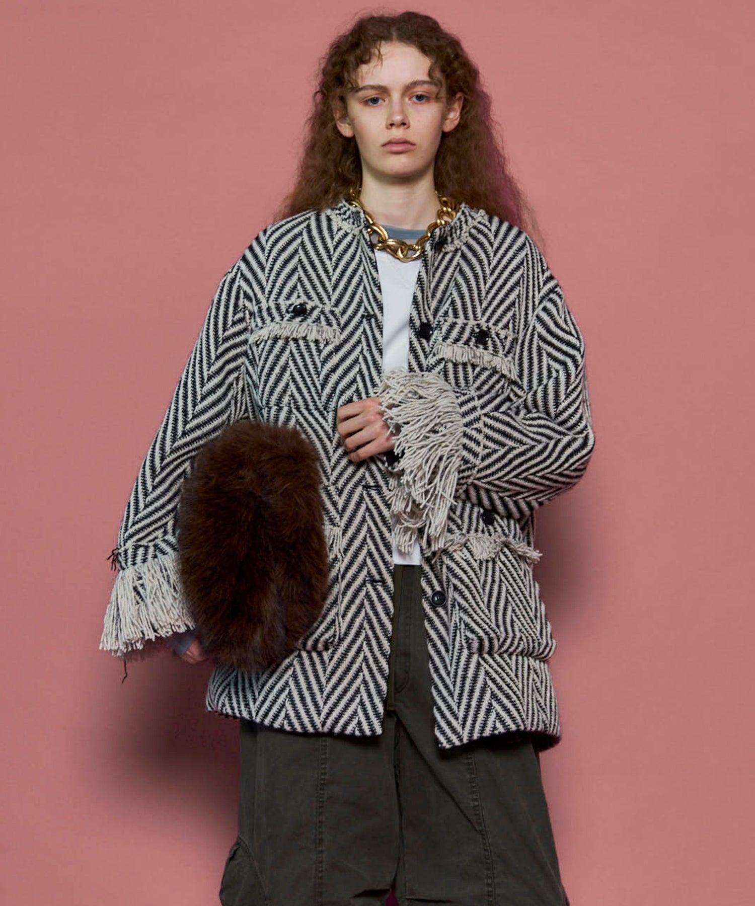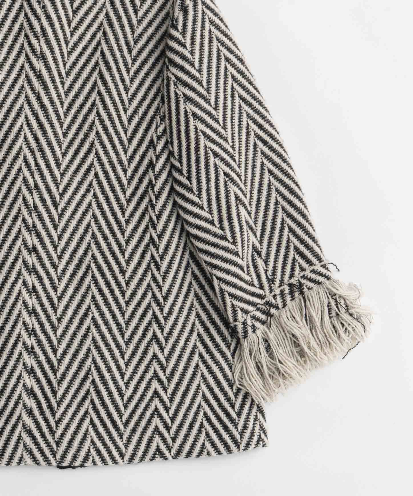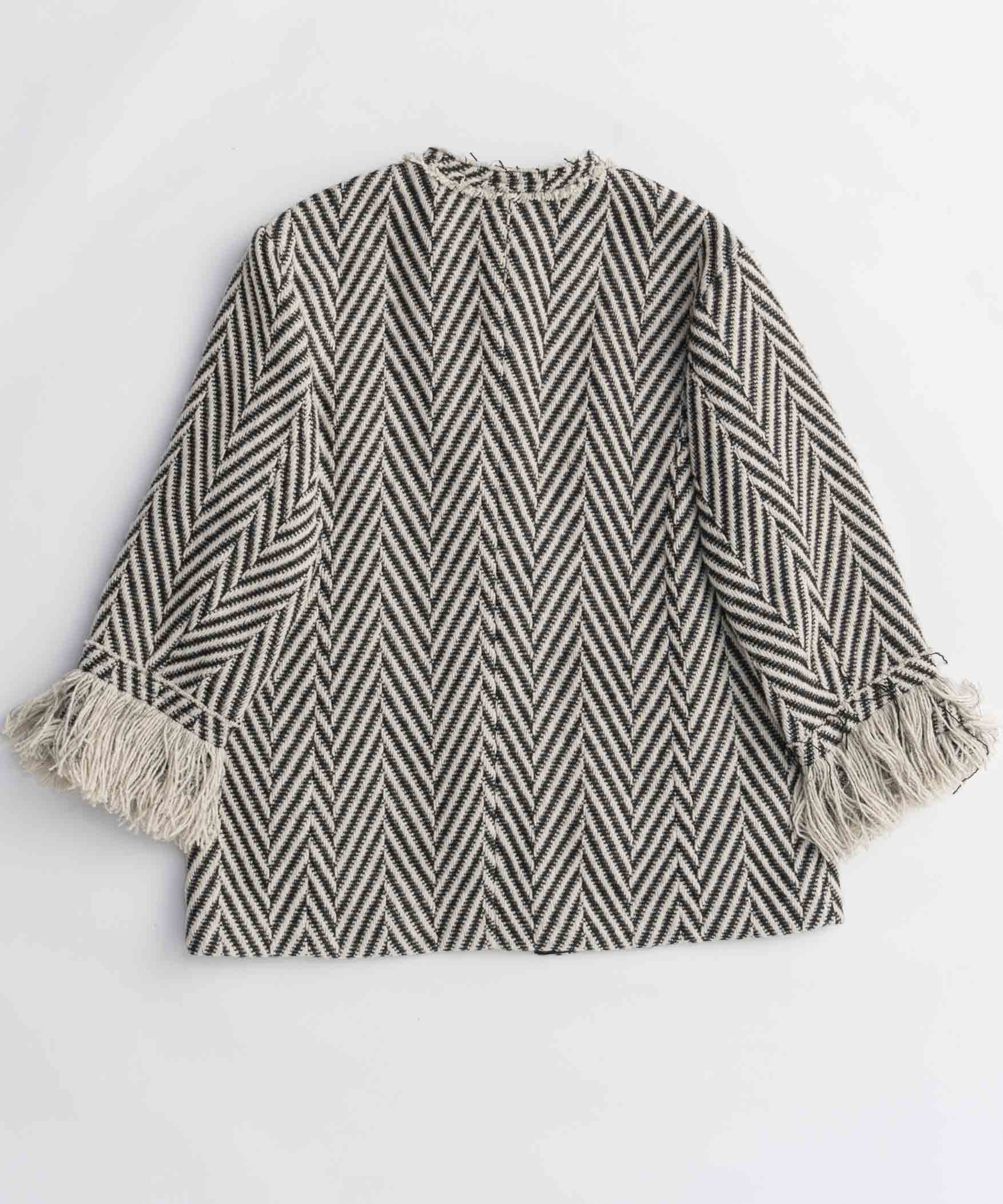 袖口の二段フリンジデザインが他にはなくモードな雰囲気を漂わせてくれています。