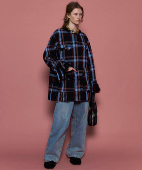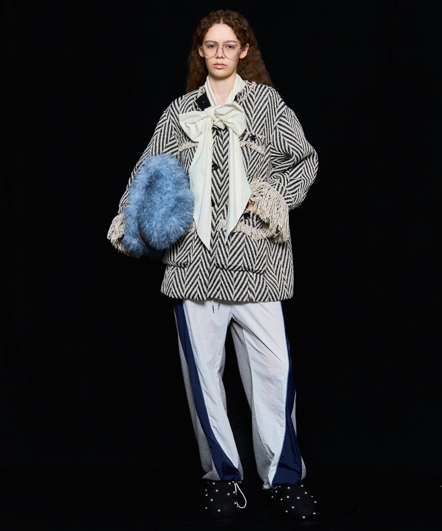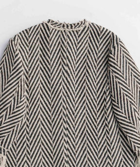 Material:【BLK】表地:ウール57%、ポリエステル43%、裏地:ポリエステル100%、【WHT】表地:ポリエステル100%、裏地:ポリエステル100%、【NVY】表地:ポリエステル79%、コットン12%、レーヨン6%、ナイロン1%、ポリウレタン1%、アクリル1%、裏地:ポリエステル100%