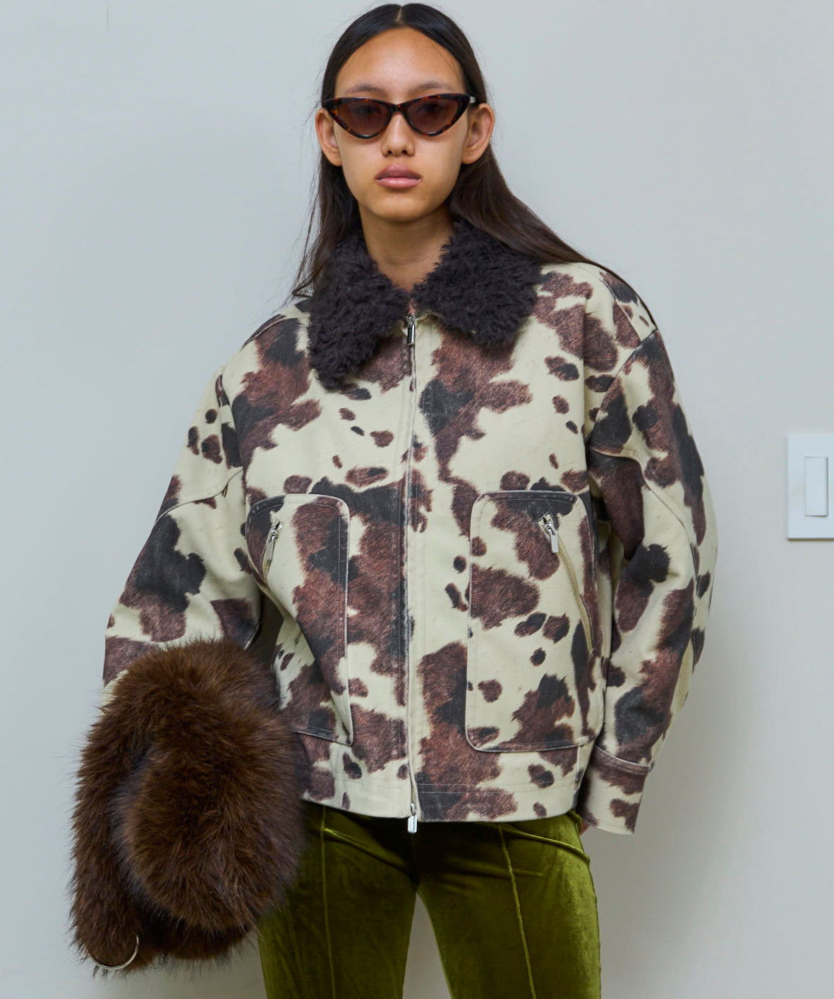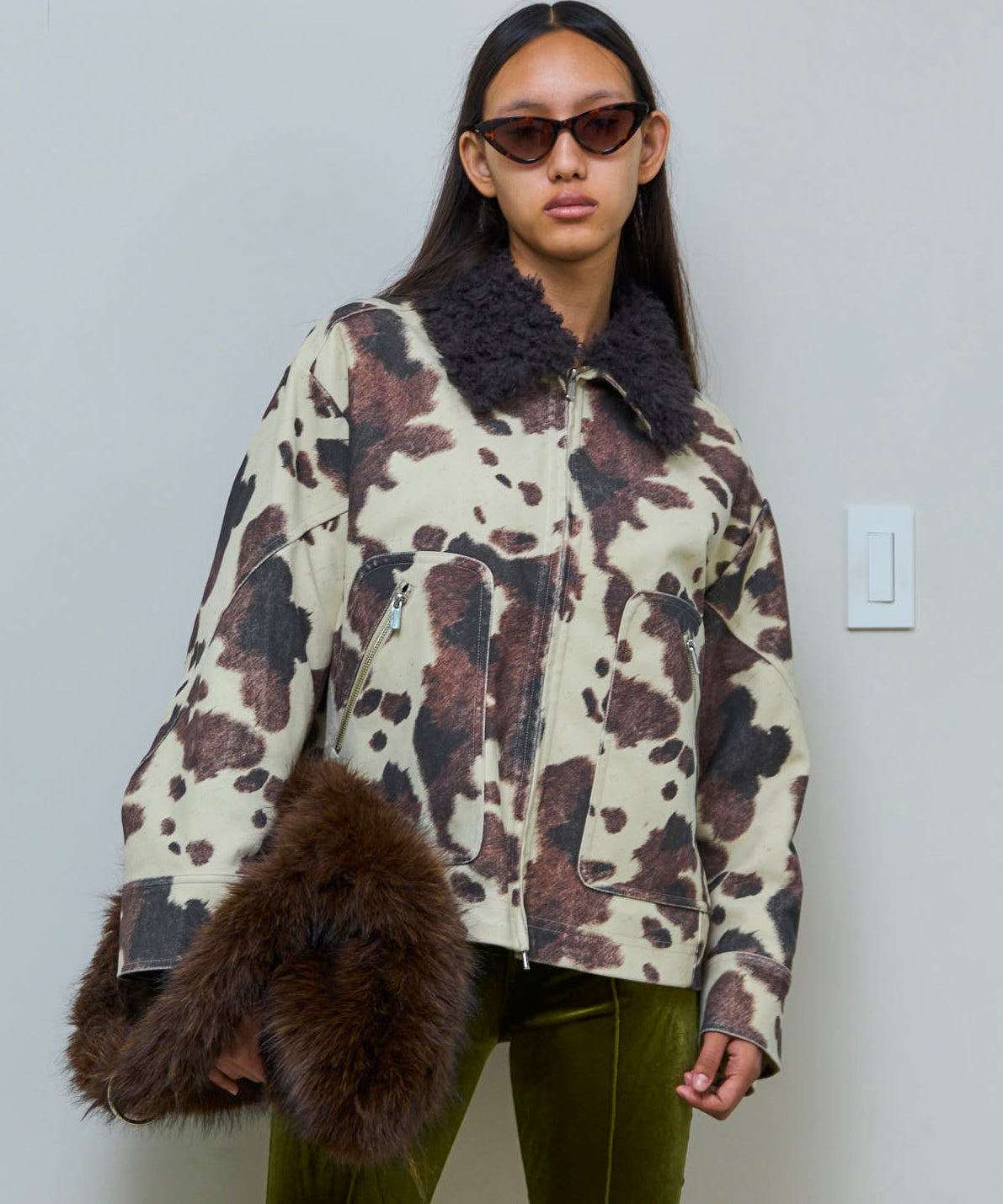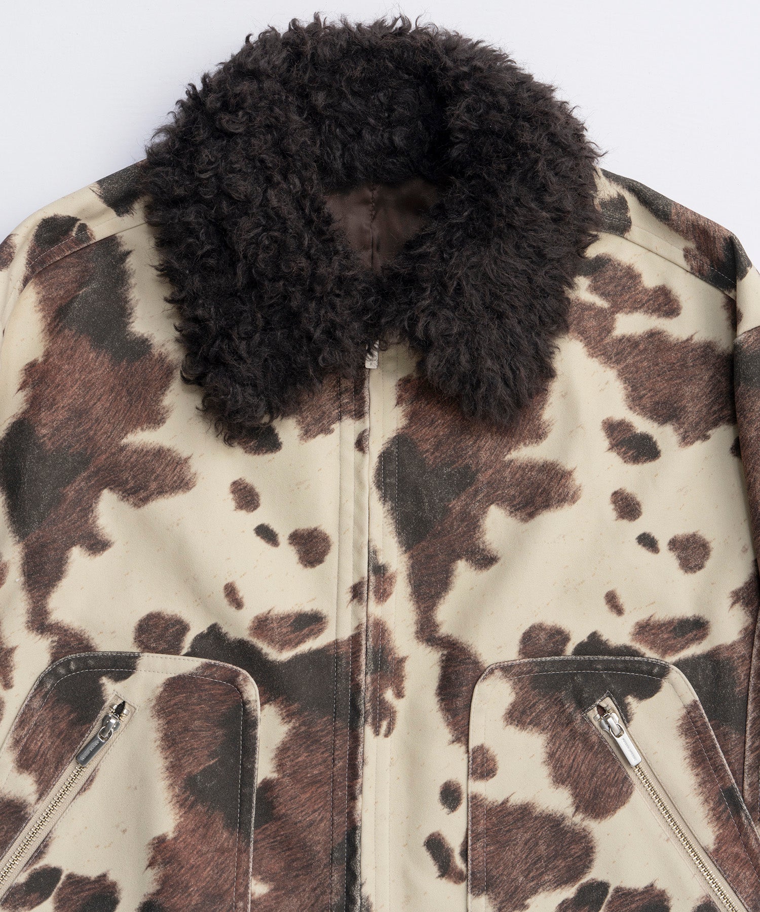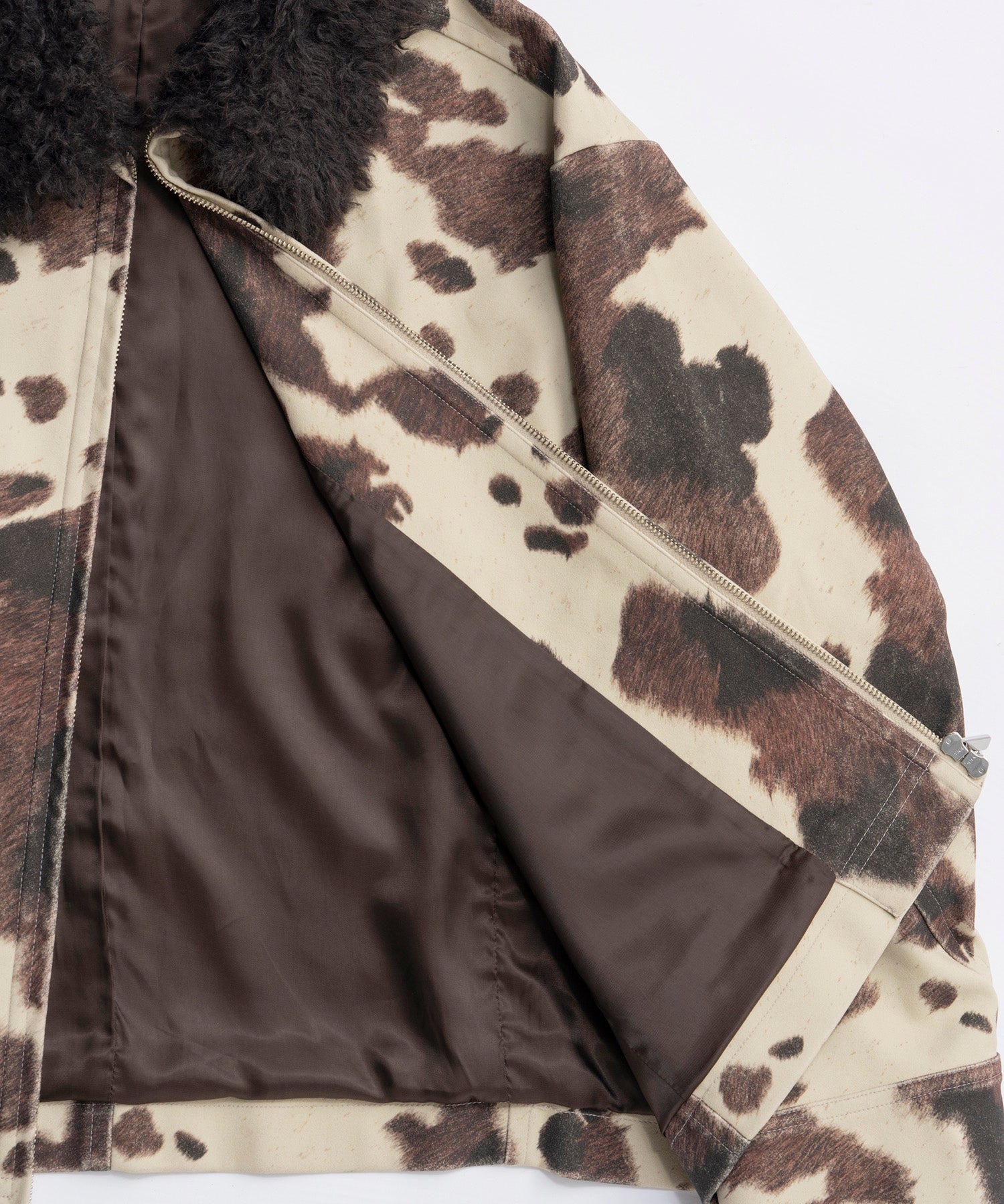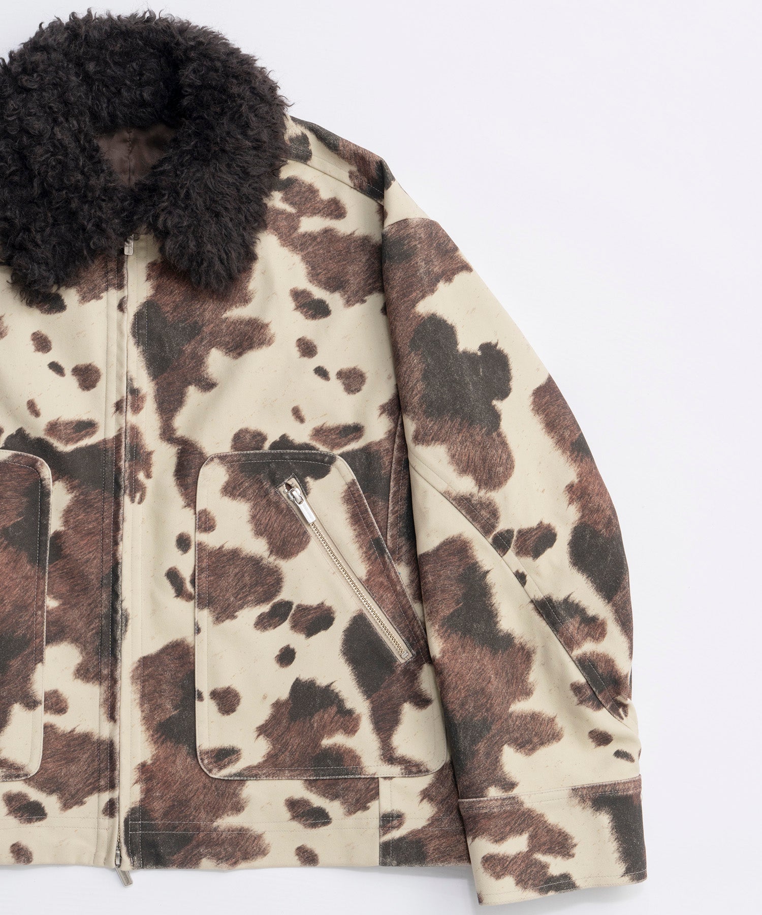 ・ユニークなオリジナルカウ柄プリントが印象的で、存在感のあるモノトーン×ブラウンのパターンが、コーディネートに遊び心とアクセントをプラスしてくれるレザーブルゾン。