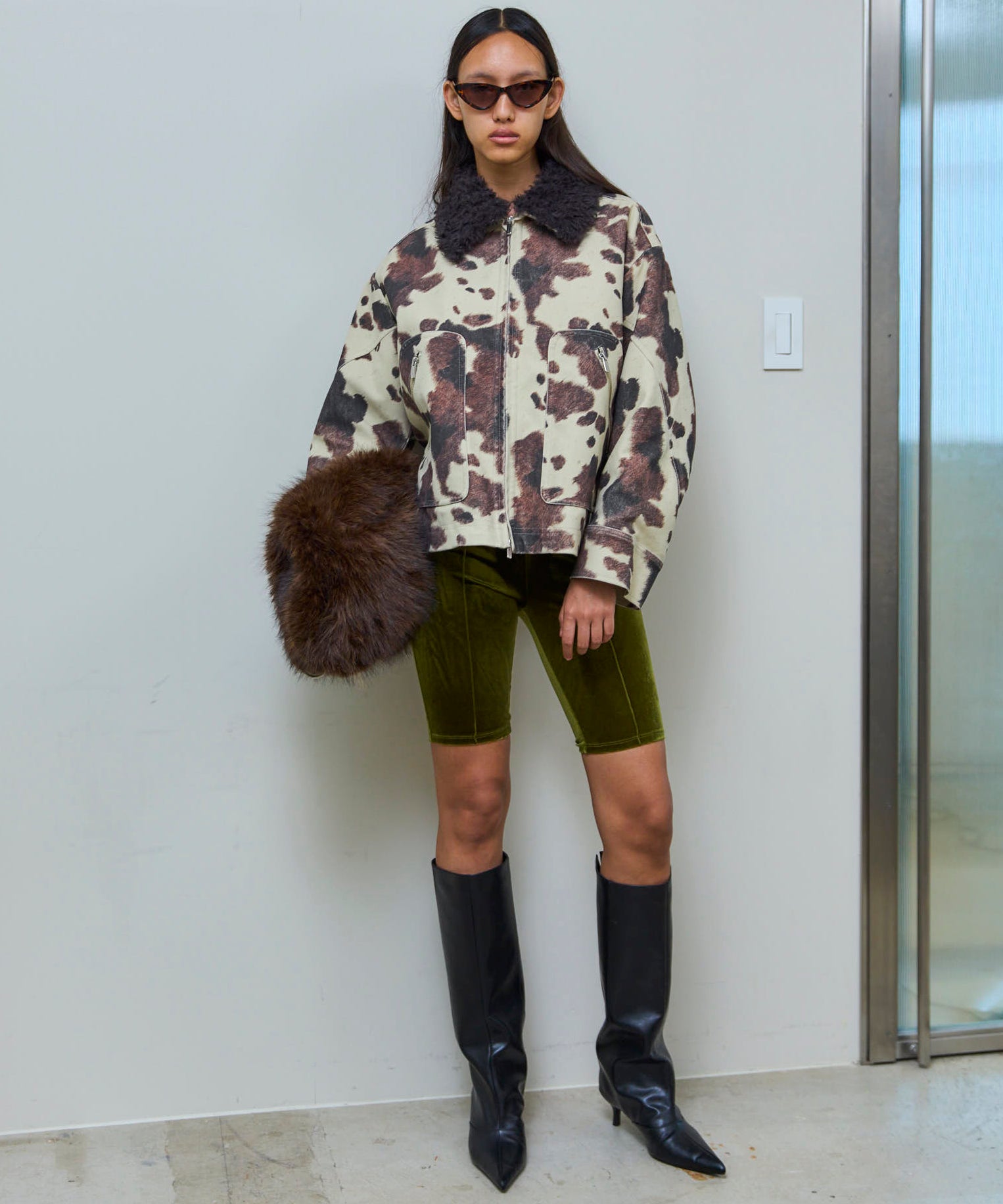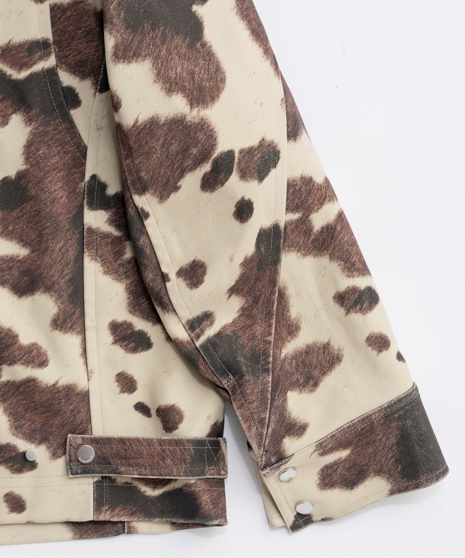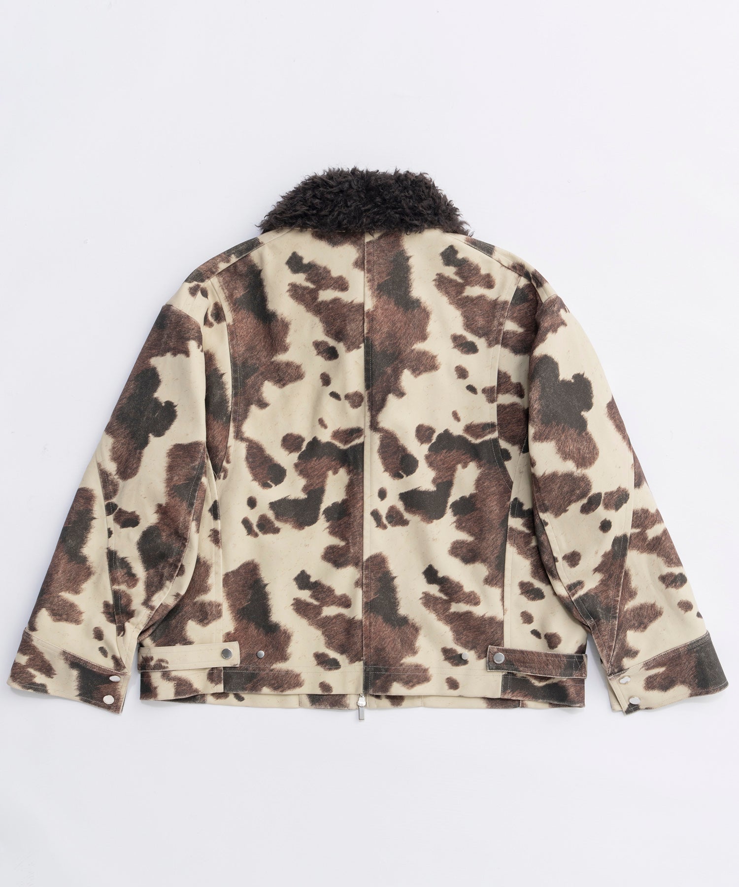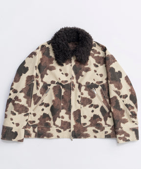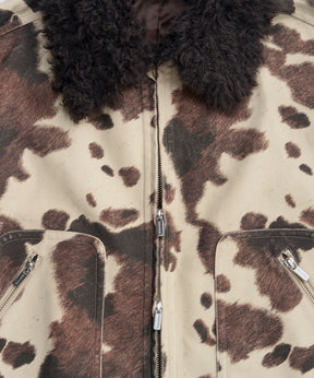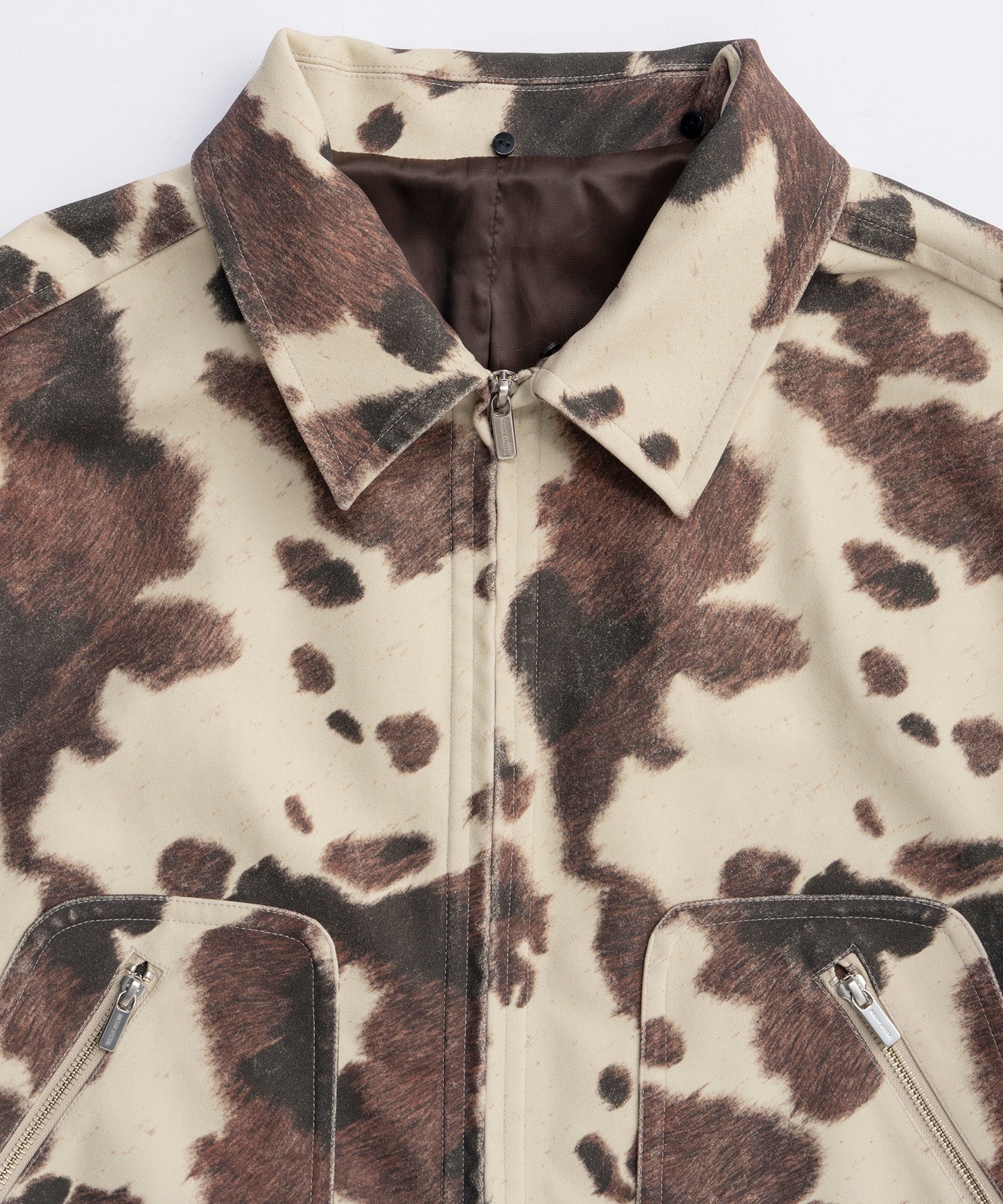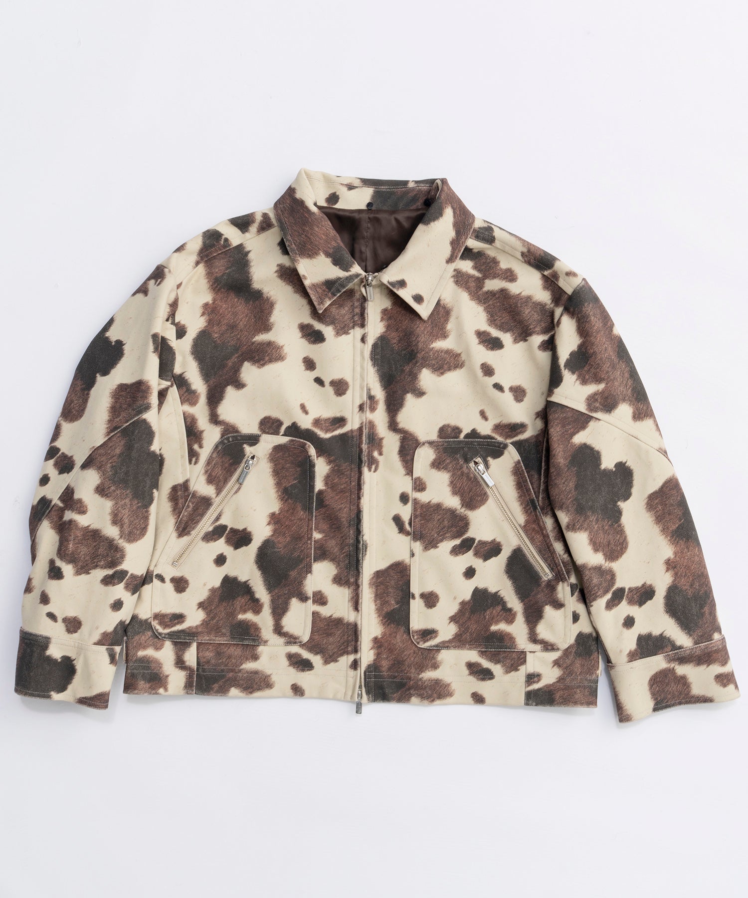 ・ユニークなオリジナルカウ柄プリントが印象的で、存在感のあるモノトーン×ブラウンのパターンが、コーディネートに遊び心とアクセントをプラスしてくれるレザーブルゾン。