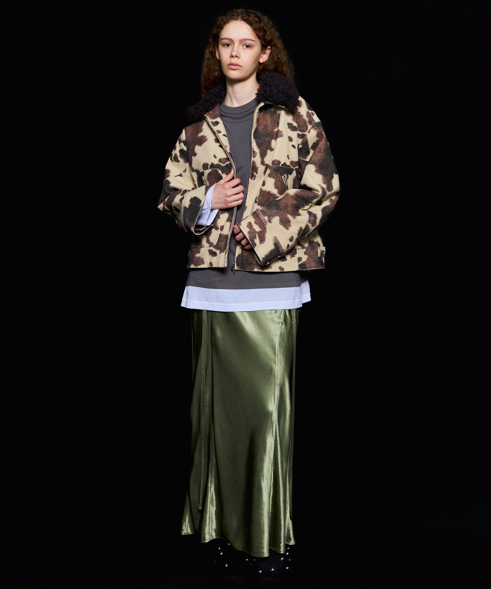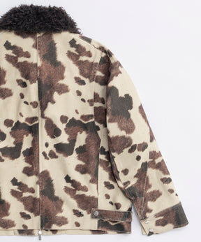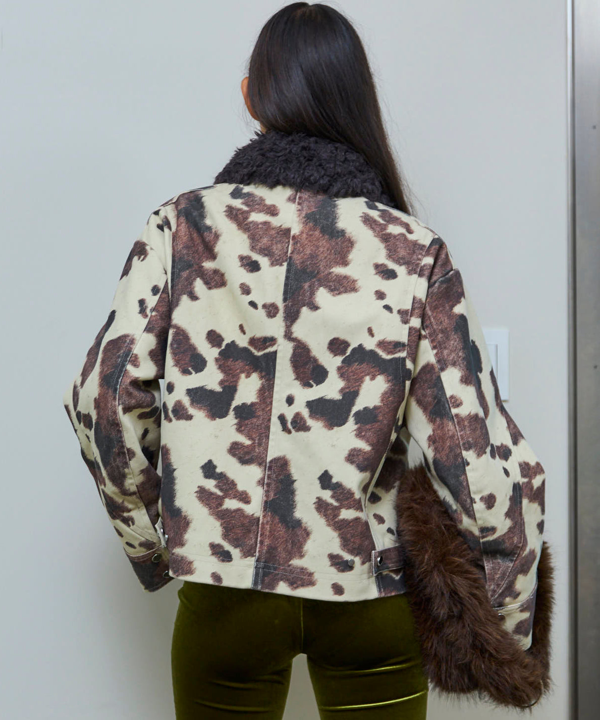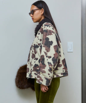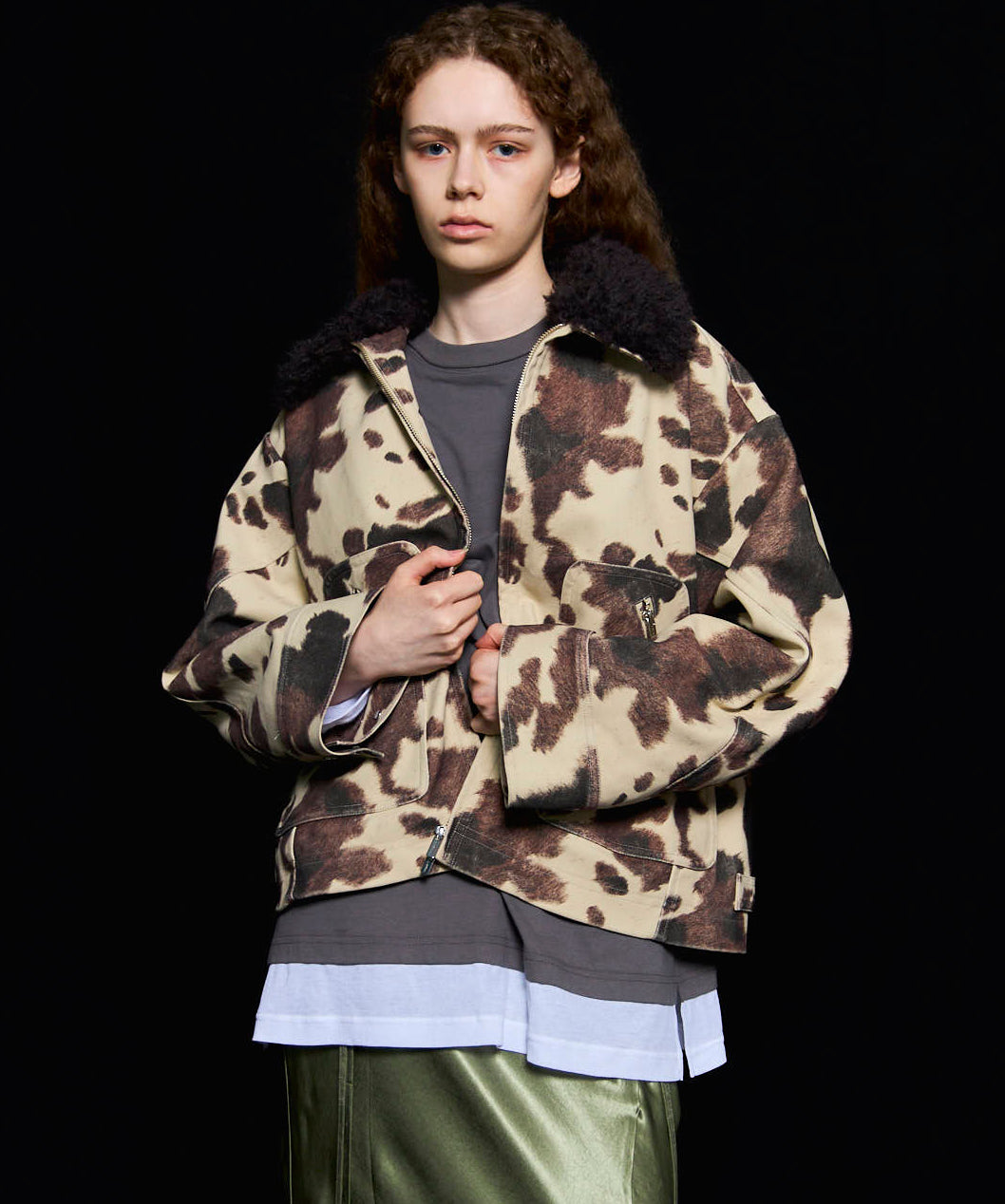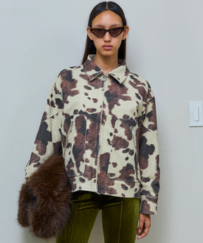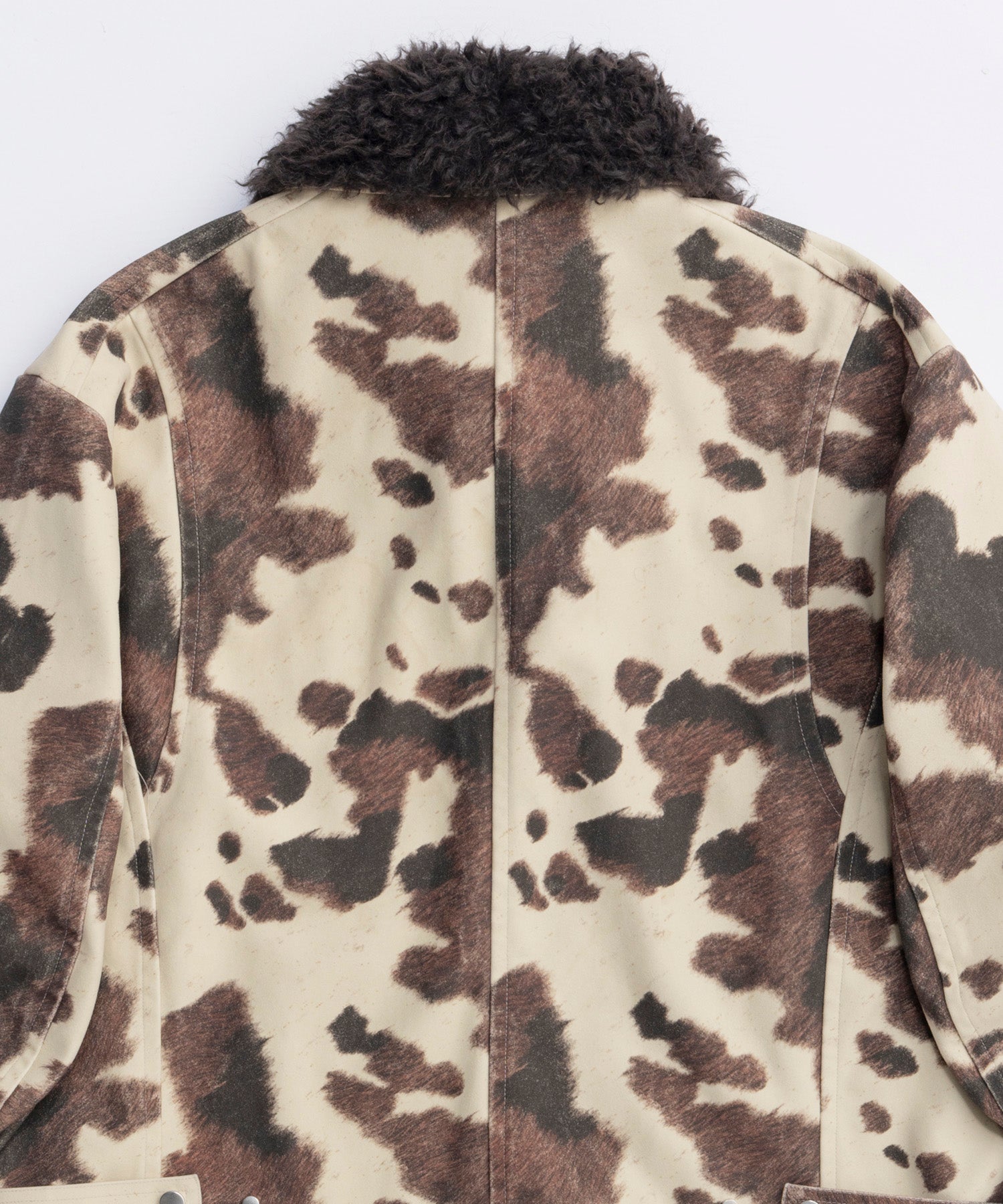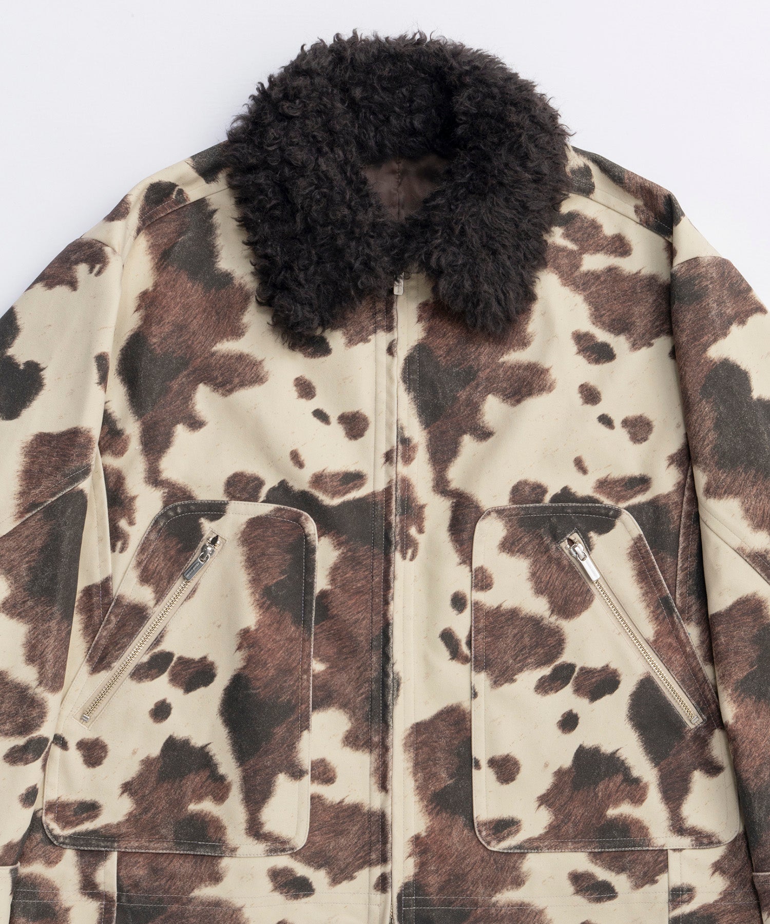 ・ユニークなオリジナルカウ柄プリントが印象的で、存在感のあるモノトーン×ブラウンのパターンが、コーディネートに遊び心とアクセントをプラスしてくれるレザーブルゾン。