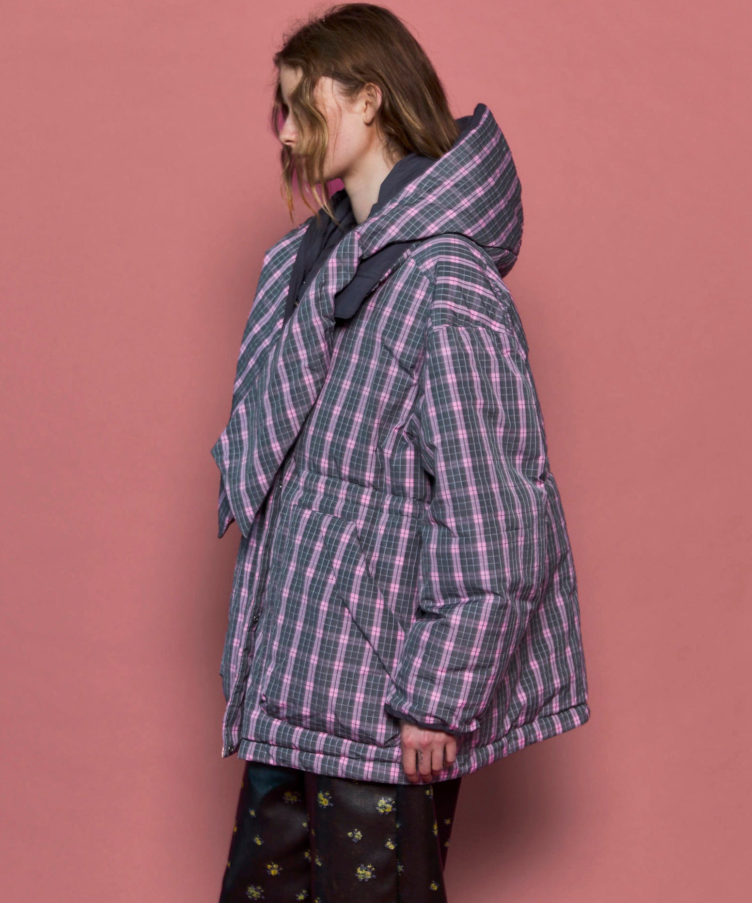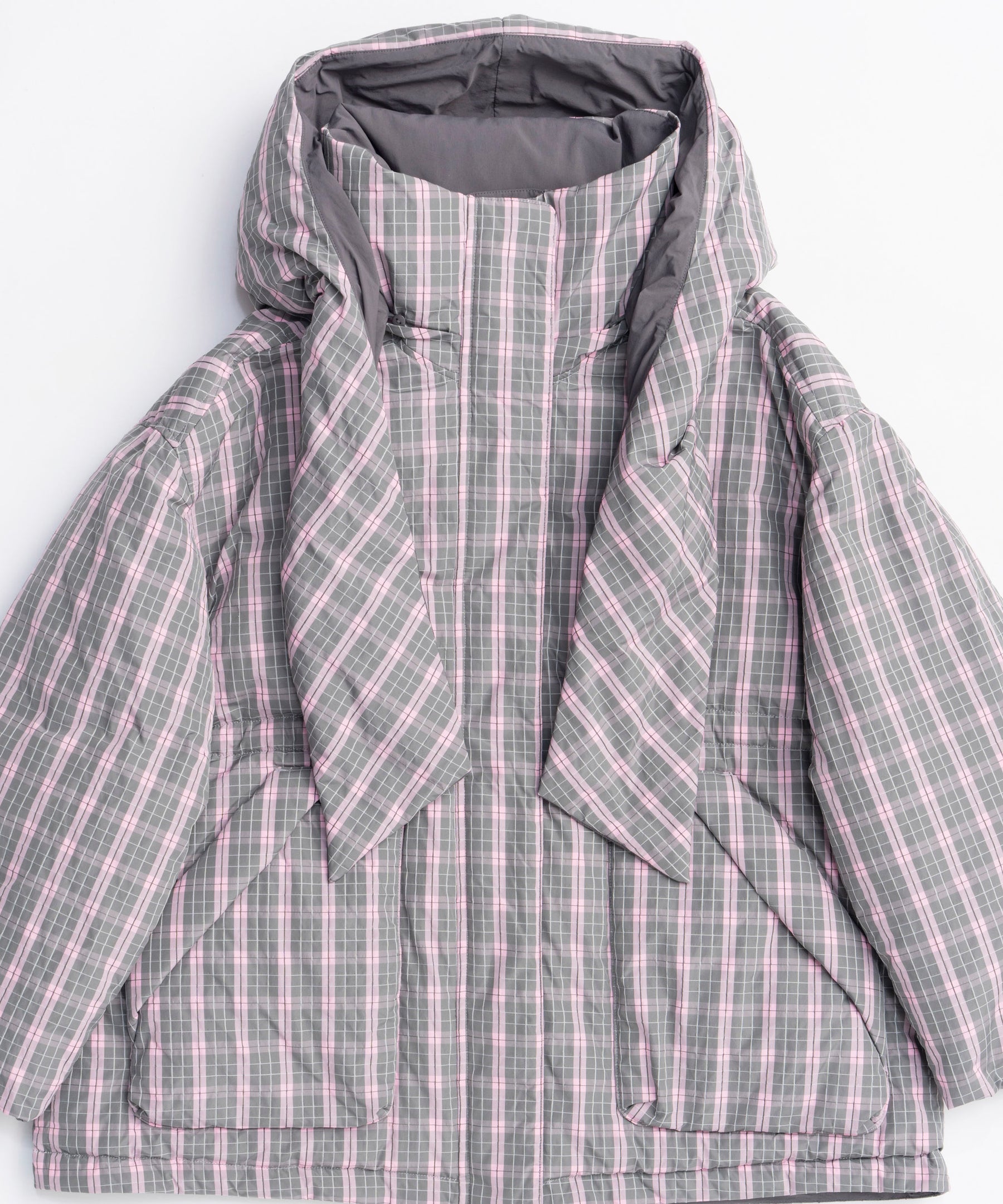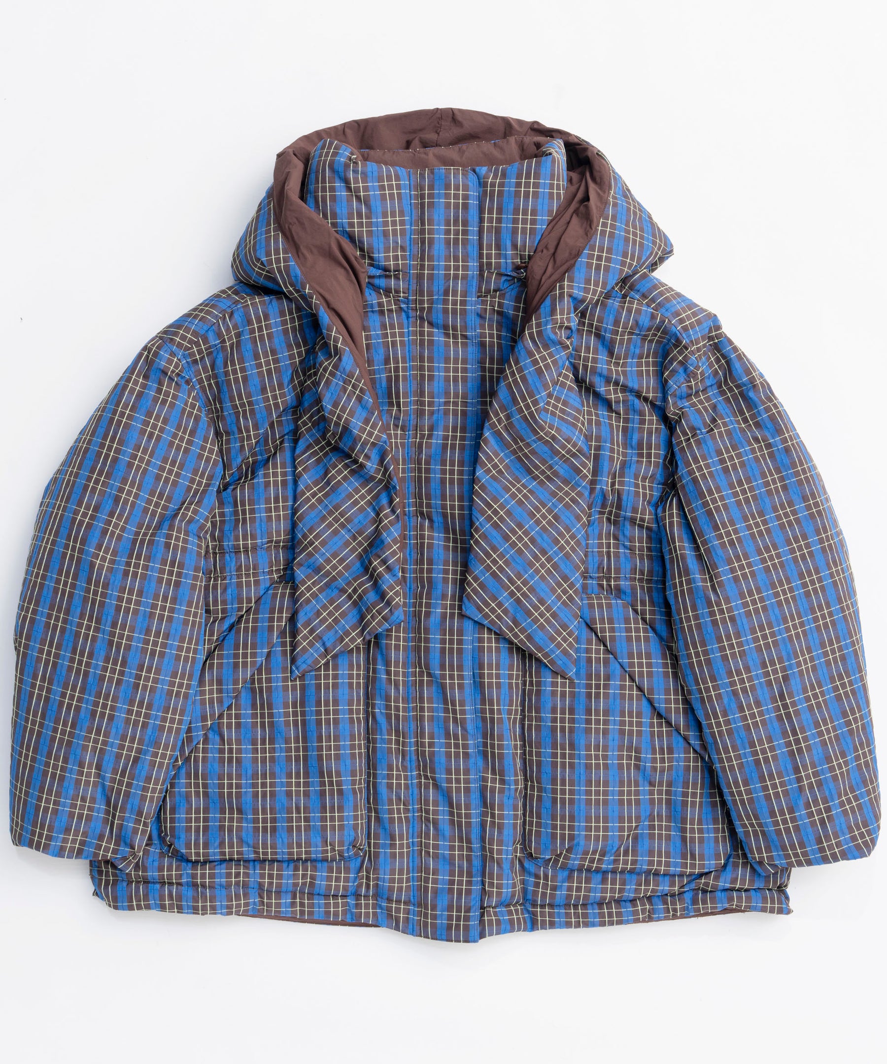 Product Name:チェックフーディマフラーミドルダウンコート